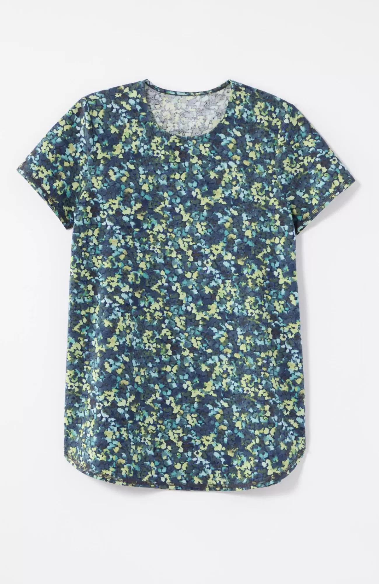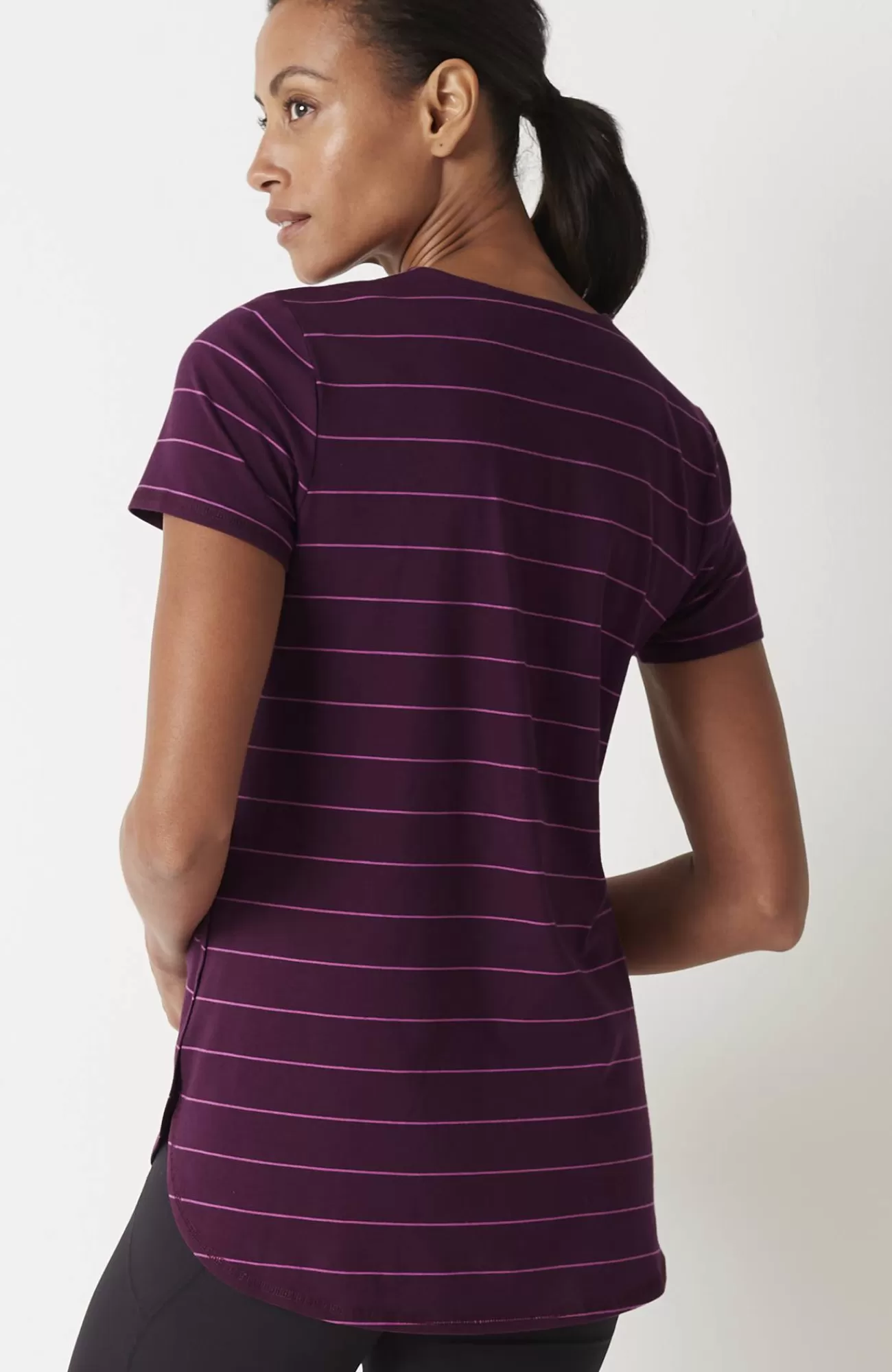 Our ultrasoft crew-neck tee is made of pima cotton with a touch of stretch so that it moves with you. It's an activewear essential combining the comfort of short set-in sleeves and simplicity with the added touch of style of a shirttail hemline; it’s slightly longer in the back and has lapped sides for added coverage.