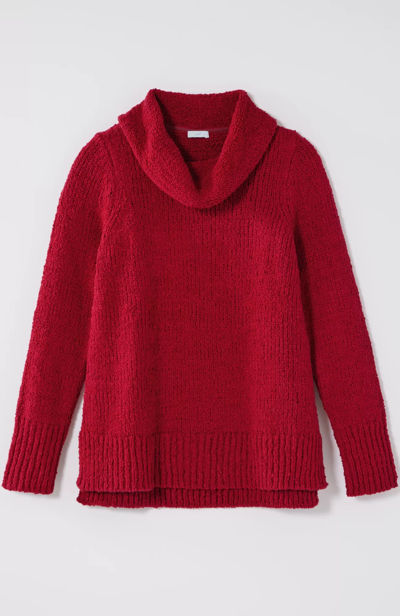 Our versatile sweater has a flattering cowl neckline and a perfectly relaxed shape. The cotton-blend knit is special too—it has a playful "popcorn" texture for added visual interest. Finished with ribbed cuffs and stepped hemline. Side vents.