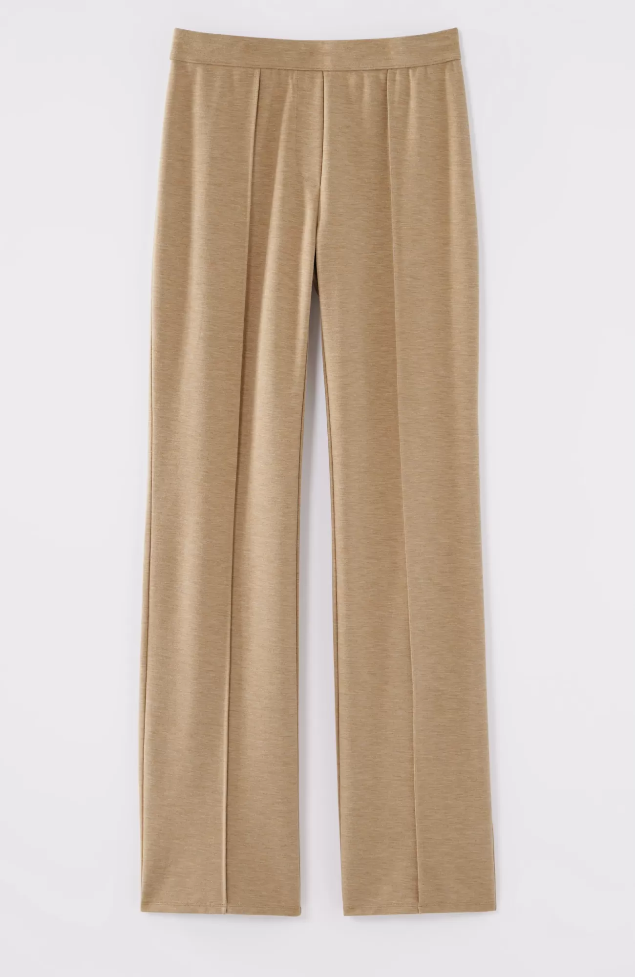 Designed in a soft, more substantial rayon-blend jersey knit, our pull-on pants are a style you'll enjoy wearing in virtually any season. The fabric is double-knit so it's slightly structured with a medium weight, a smooth polished finish and an easy drape. The slightly fuller leg flatters every body. A flat elasticized waistband and back darts create a comfortable fit that looks custom. Faux fly. Center-front pintucks finish the look.