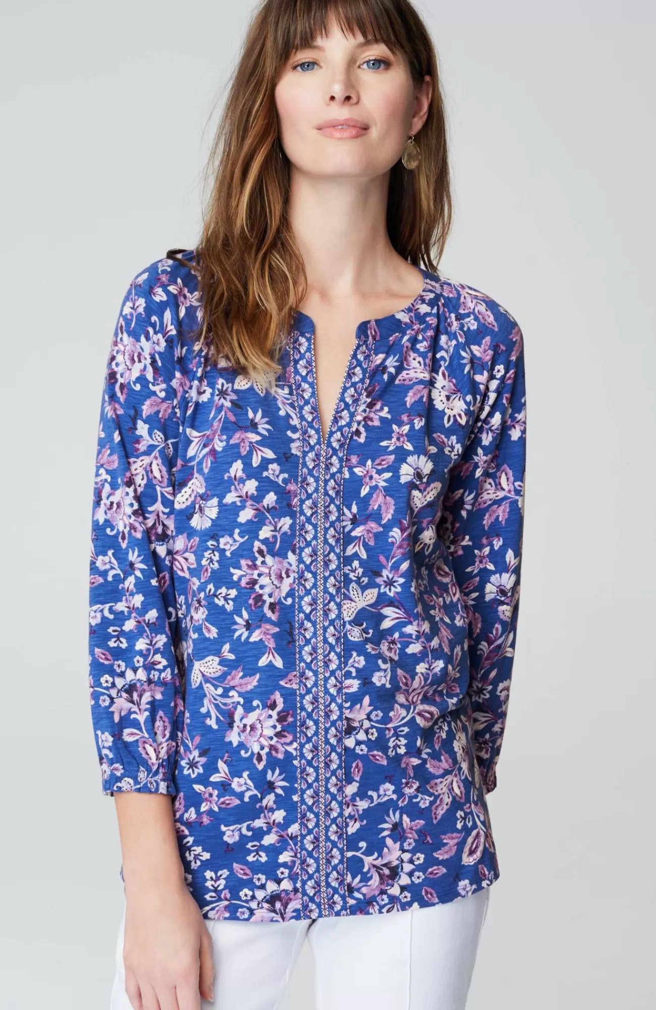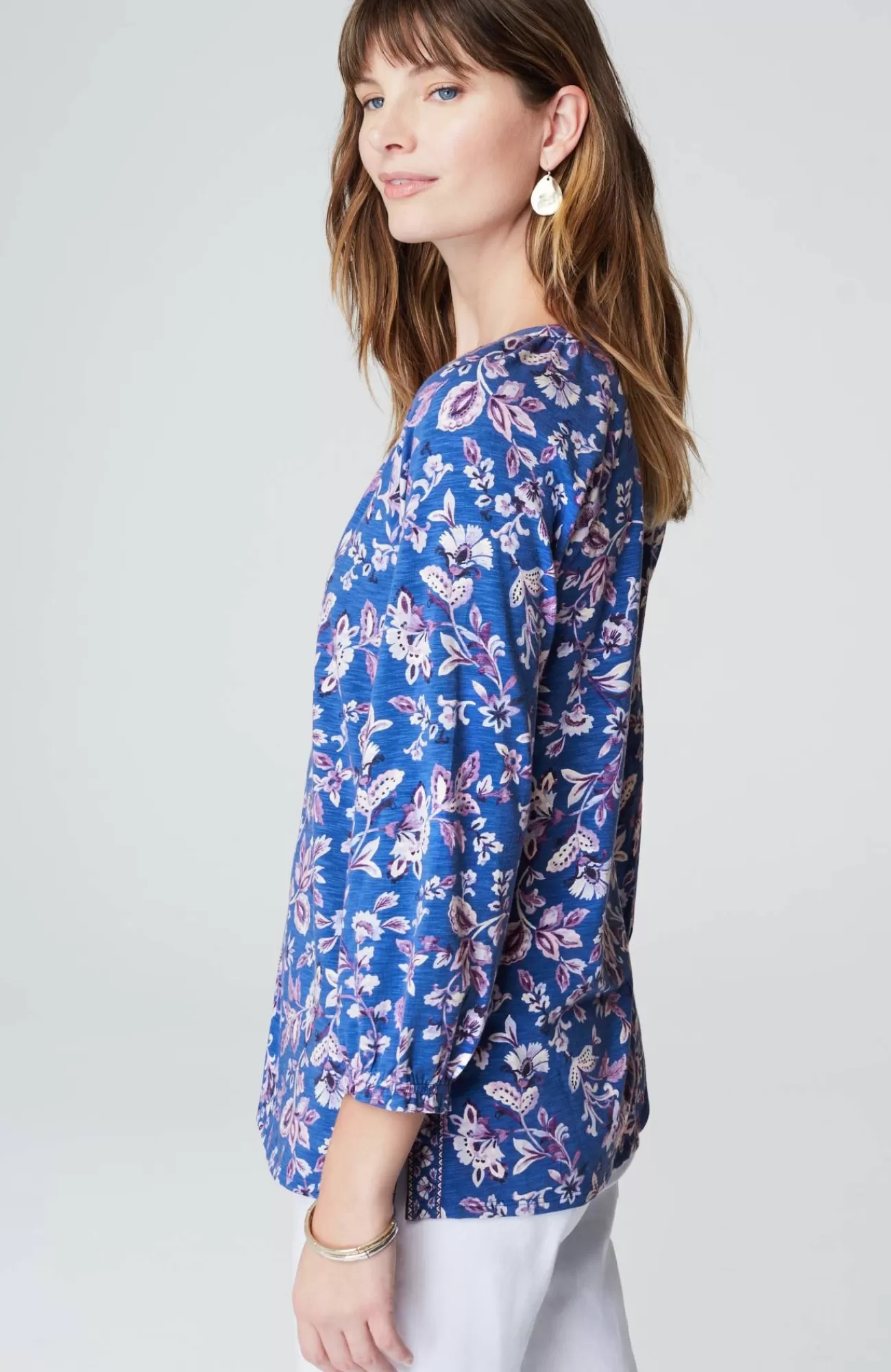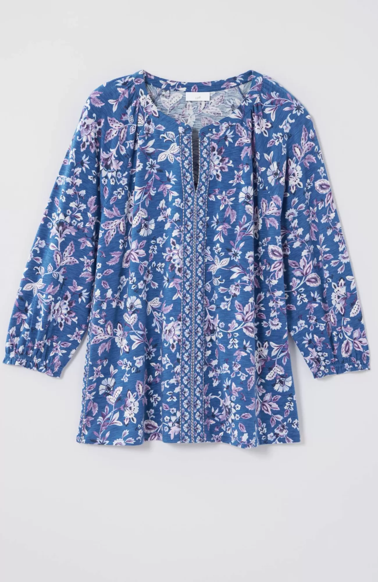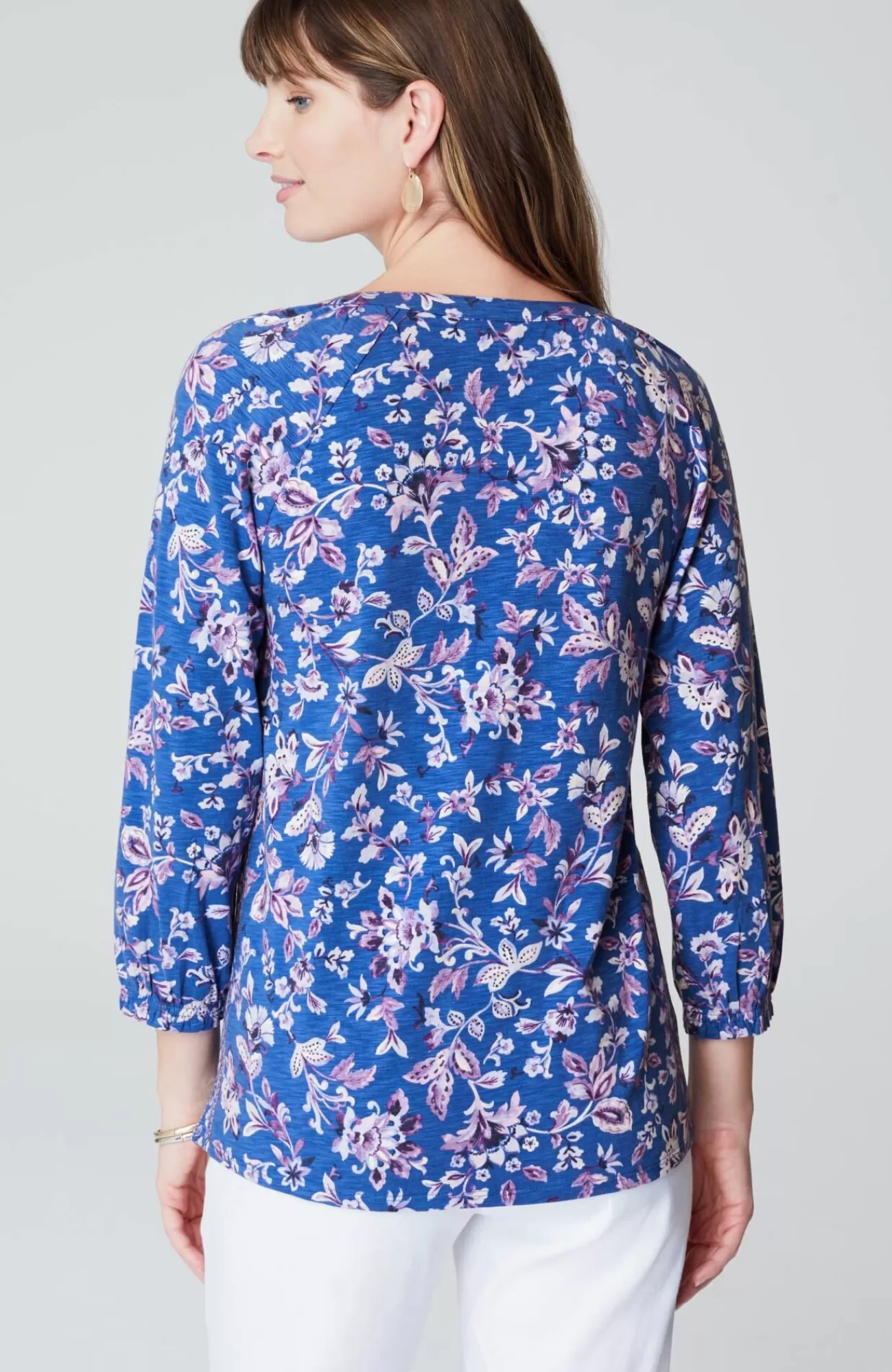 Fit for every occasion: a favorite versatile spring style, now in an elegant border print of blooming florals, with subtle ruffles at the cuffs. Breathable side vents.