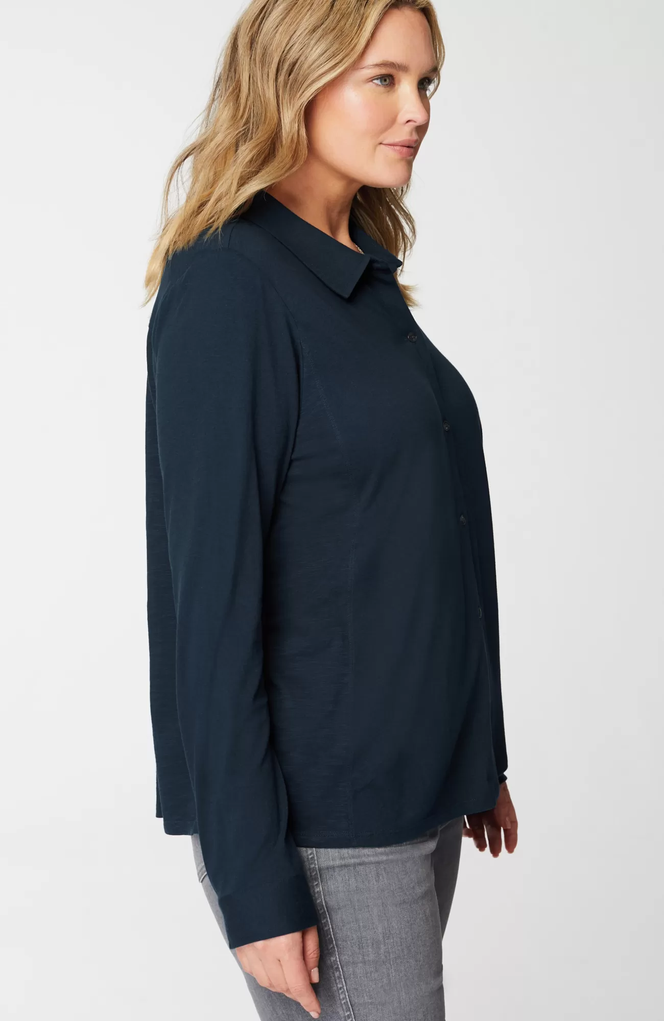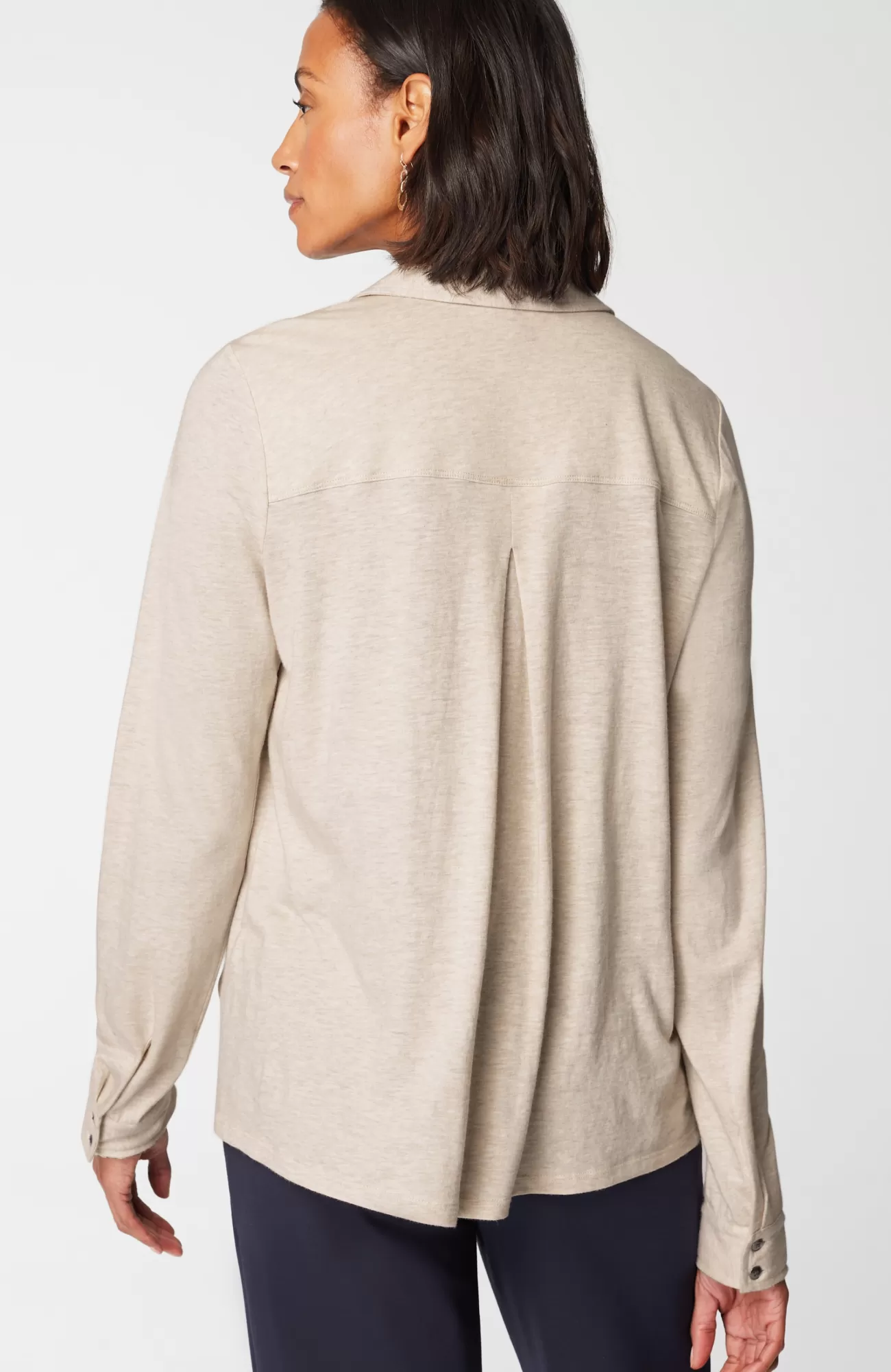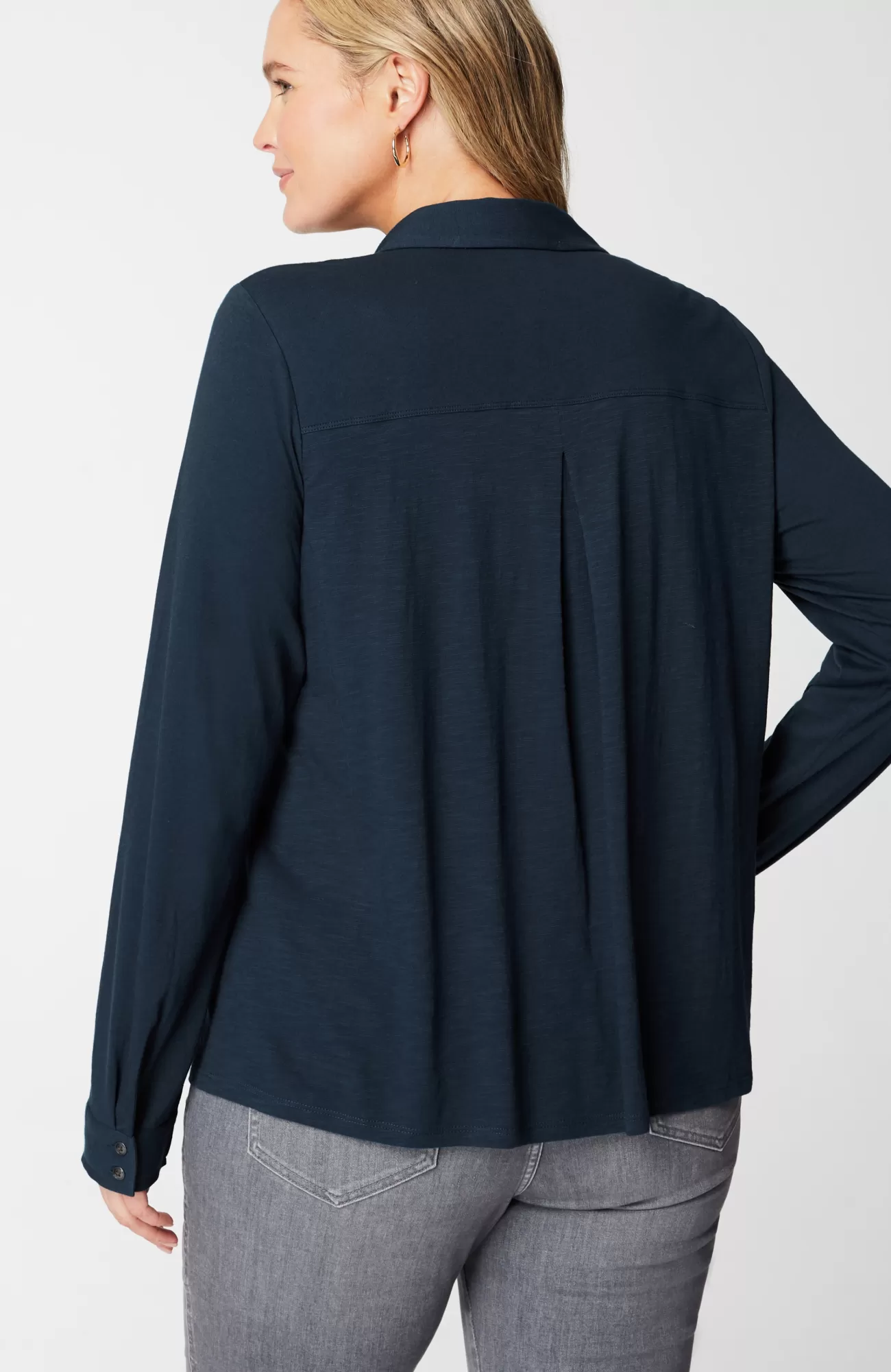 Not your average button-front: we've combined two of the softest fabrics—cotton-modal jersey and cotton-modal slub—for a lightweight, versatile piece you can wear buttoned alone or open as an elevated layer over tees and tanks. We love the unique metal-button detailing along the placket and cuffs as well as the flattering back pleat.