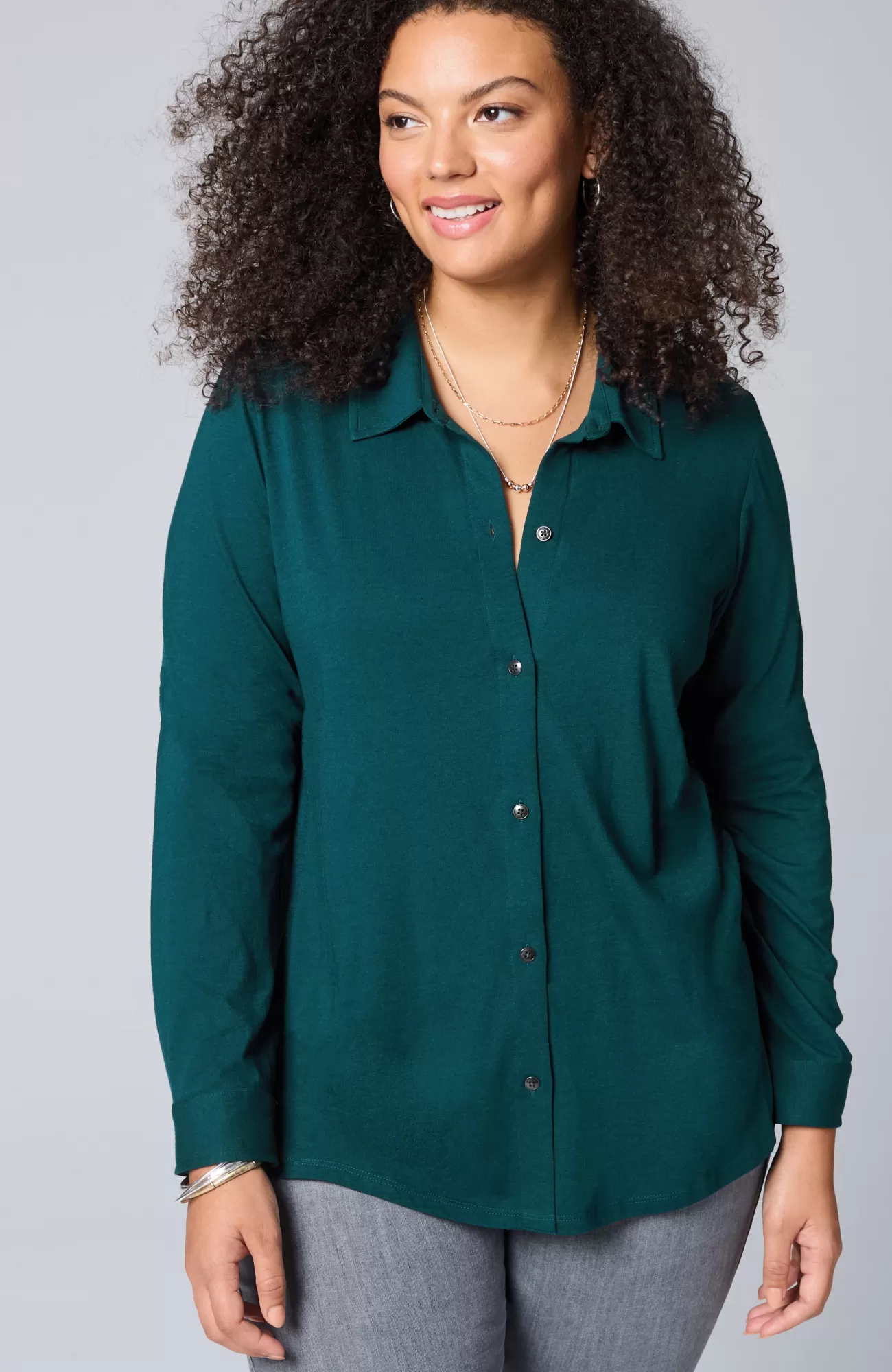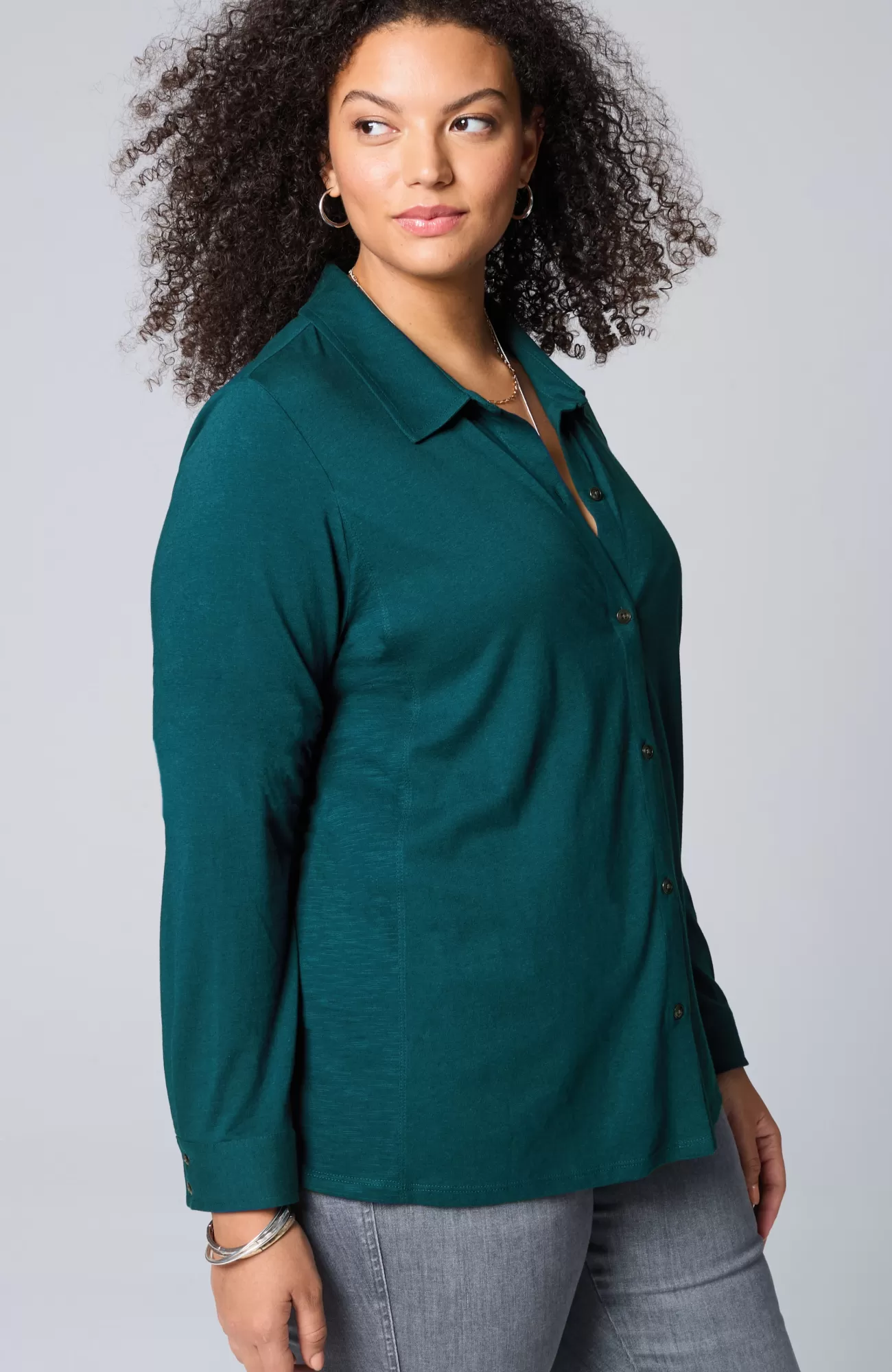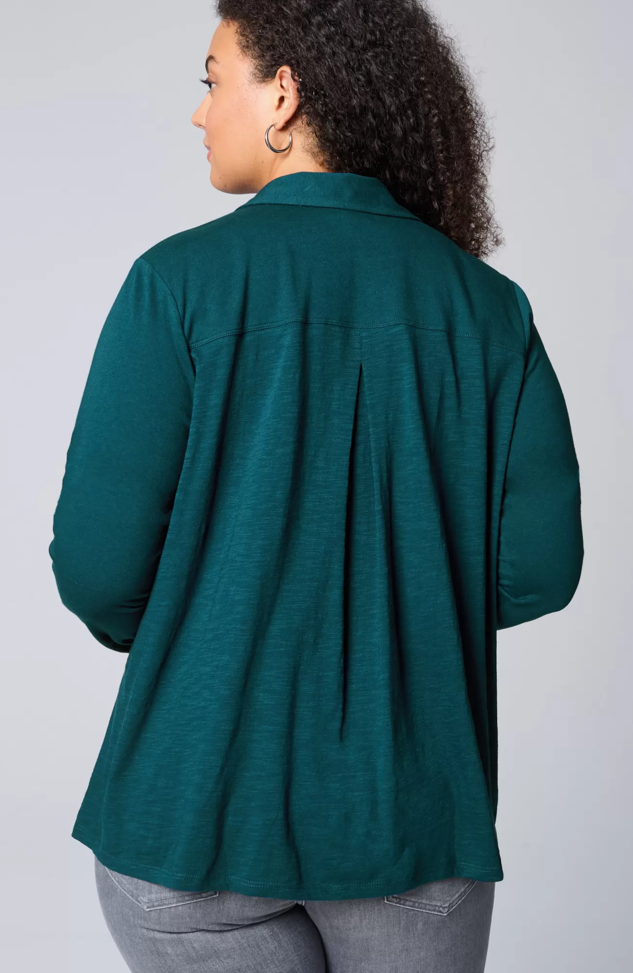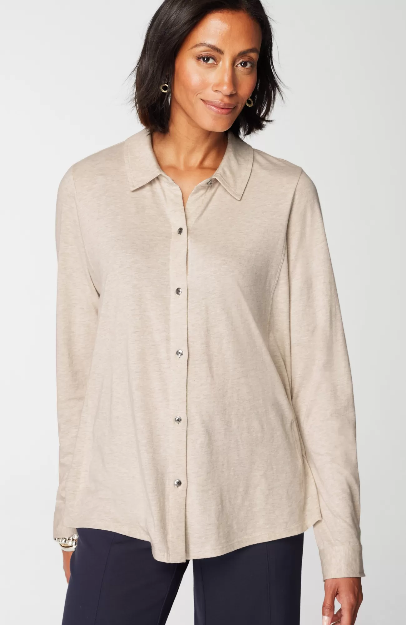 Not your average button-front: we've combined two of the softest fabrics—cotton-modal jersey and cotton-modal slub—for a lightweight, versatile piece you can wear buttoned alone or open as an elevated layer over tees and tanks. We love the unique metal-button detailing along the placket and cuffs as well as the flattering back pleat.