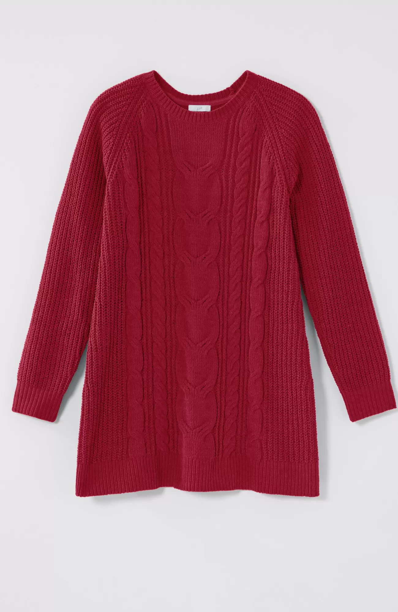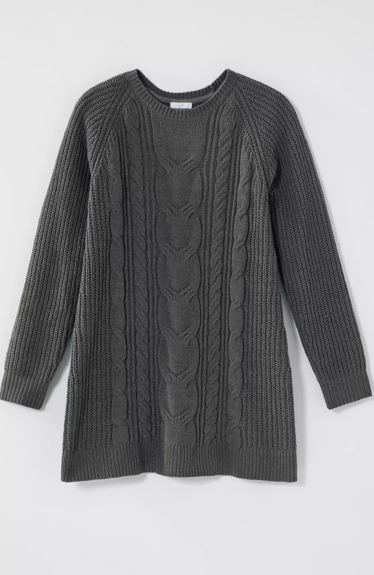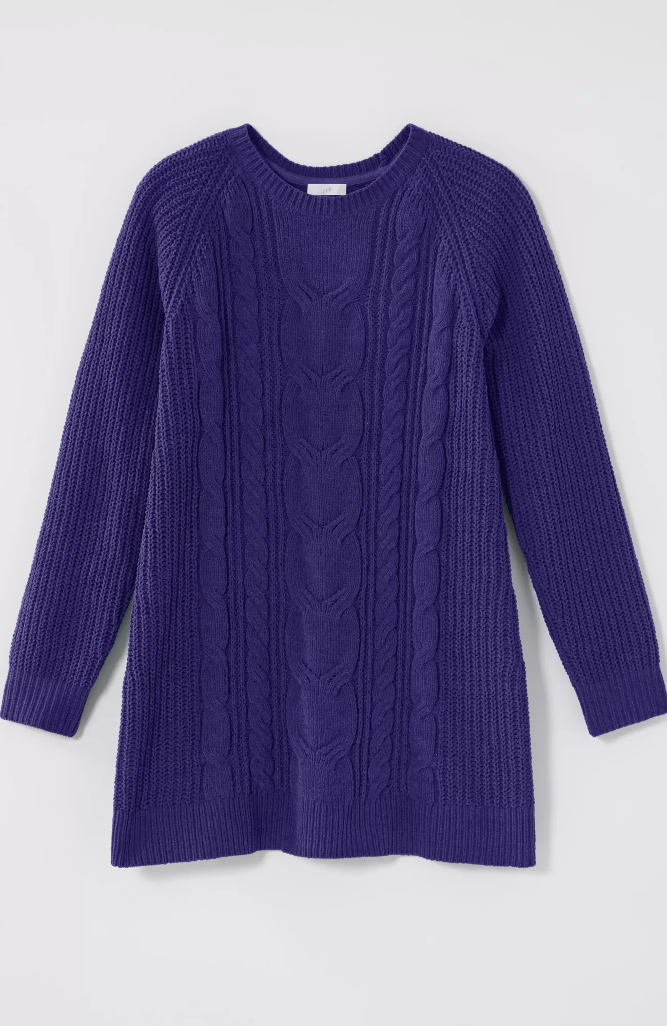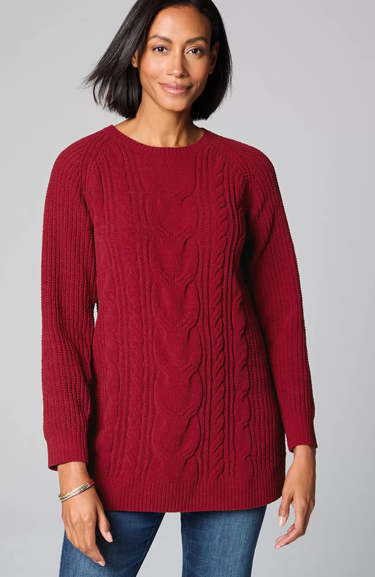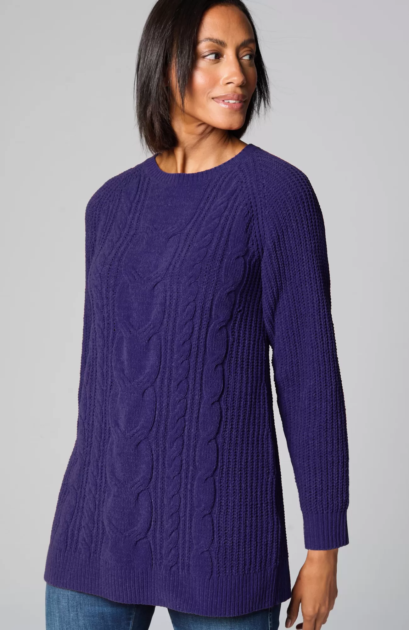 A lovely blend of textures brings a special touch to this sweater tunic. The soft-as-ever chenille you love is back, and this year we're accentuating it with placed cables for effortless styling, whether you're dressing up or down. Raglan sleeves. Finished with a ribbed neckline, cuffs and hem.