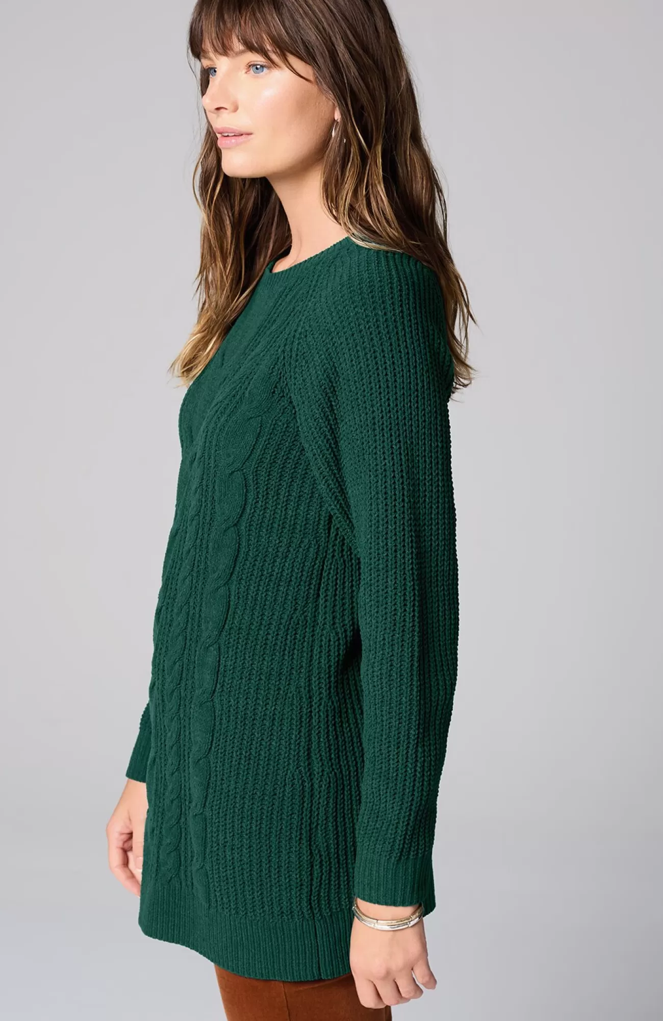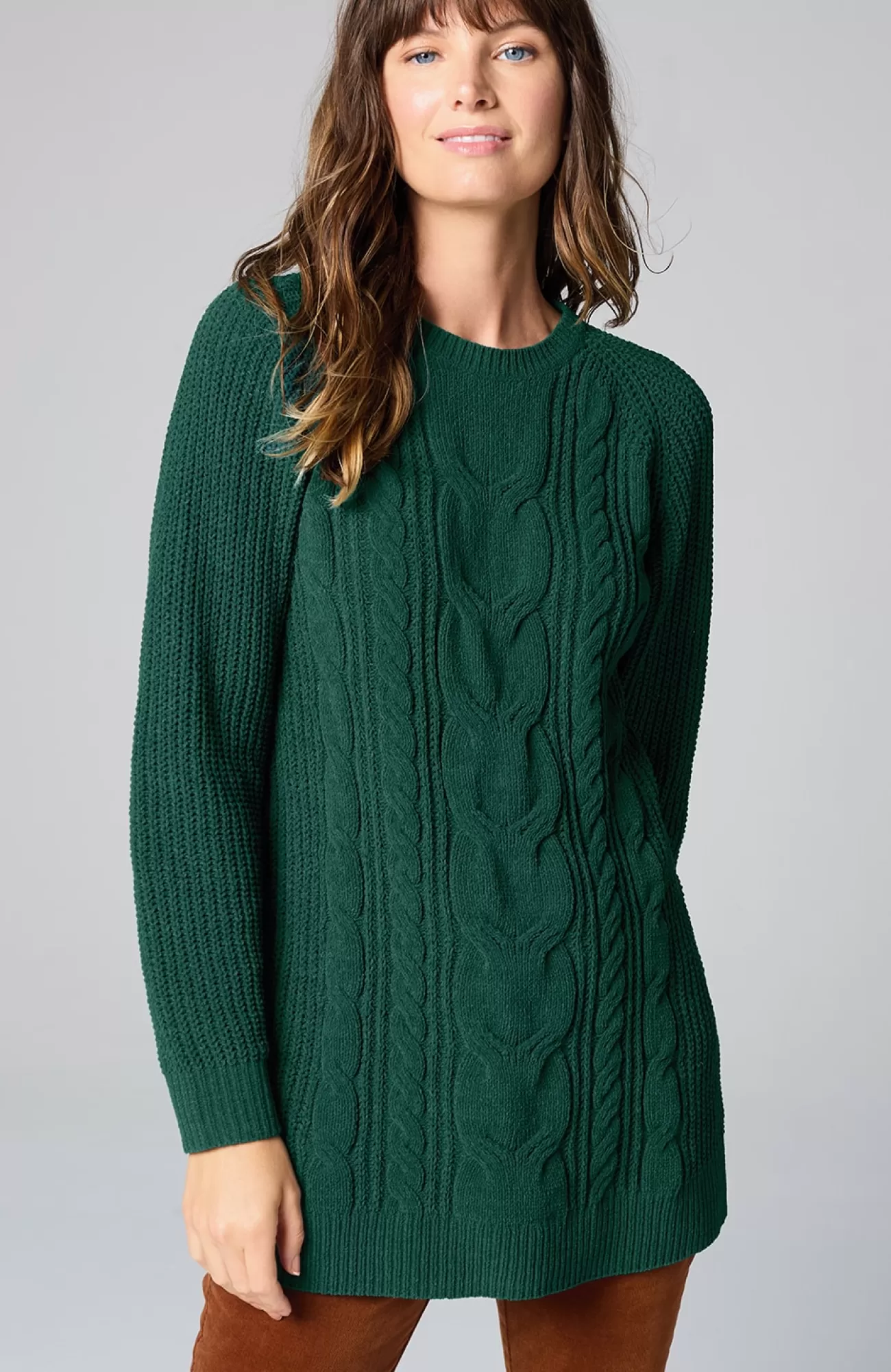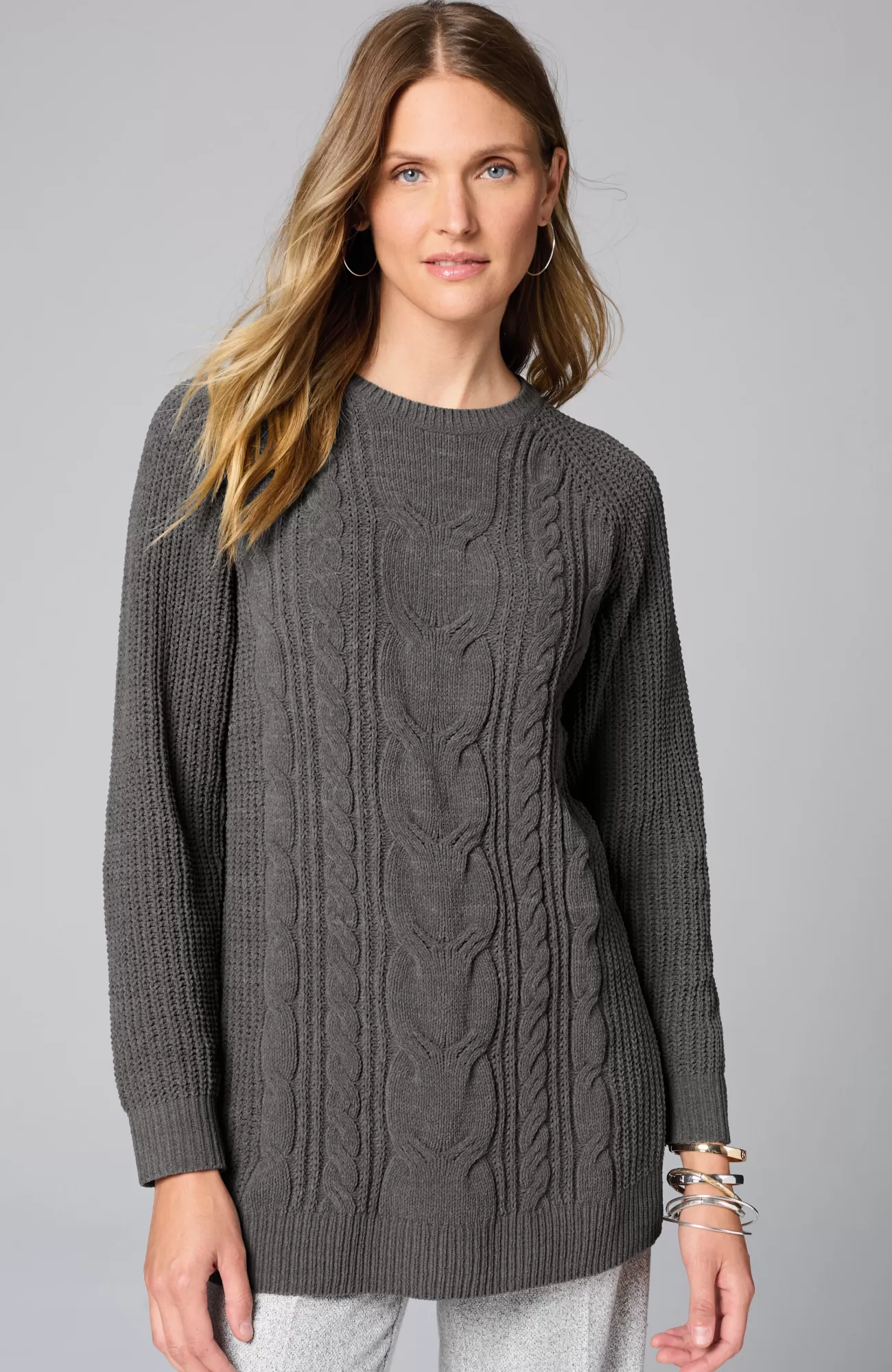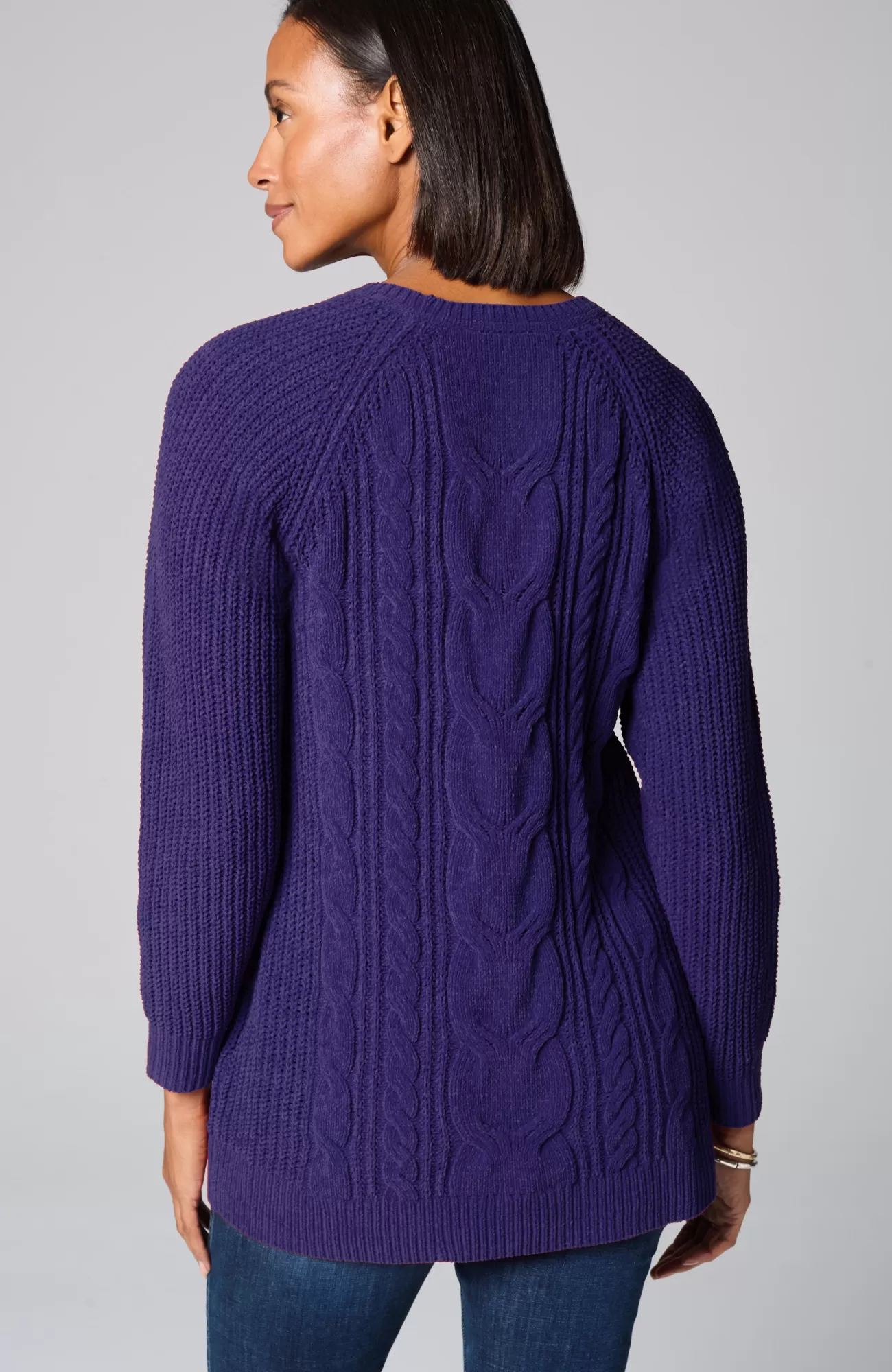A lovely blend of textures brings a special touch to this sweater tunic. The soft-as-ever chenille you love is back, and this year we're accentuating it with placed cables for effortless styling, whether you're dressing up or down. Raglan sleeves. Finished with a ribbed neckline, cuffs and hem.