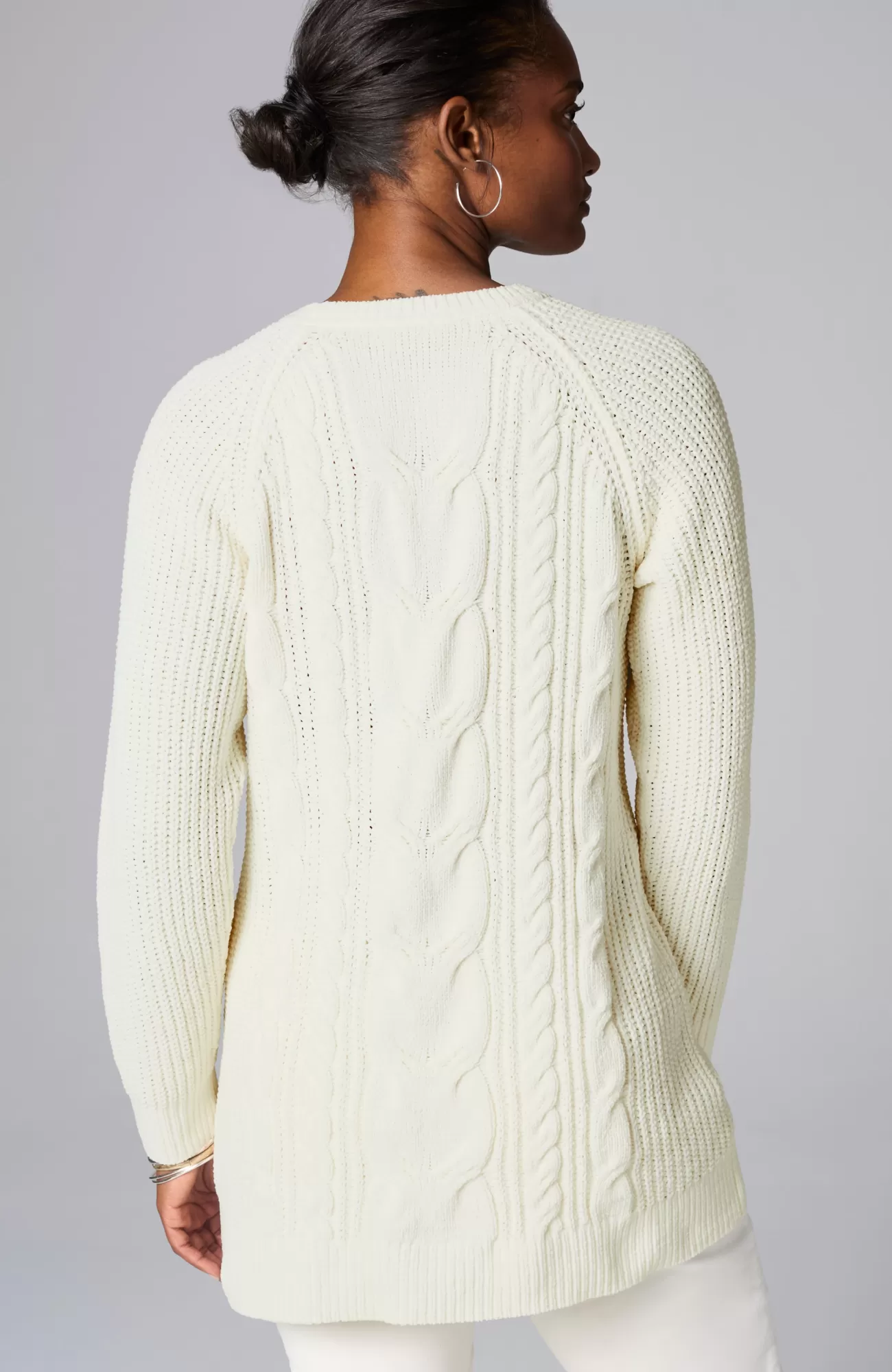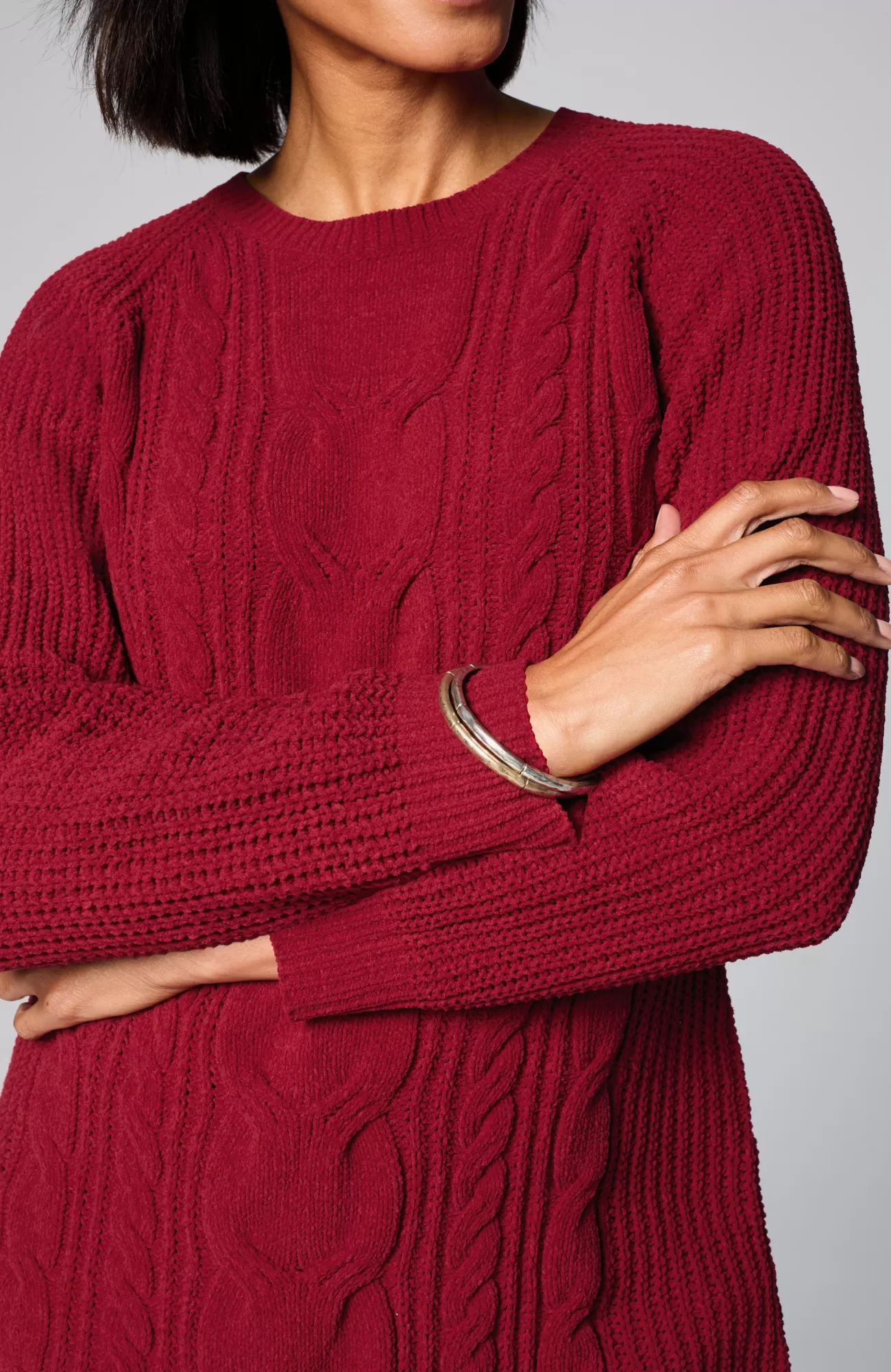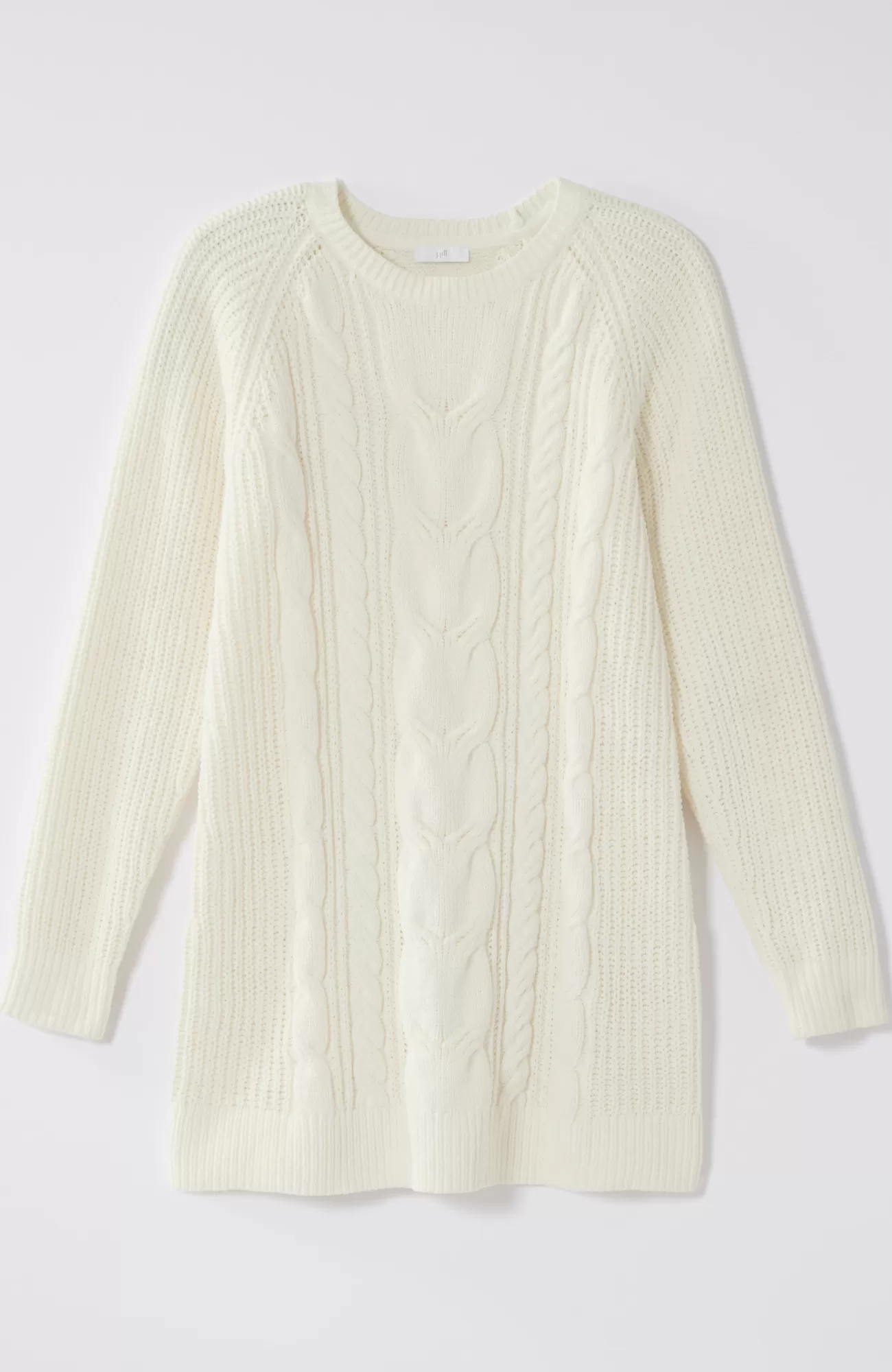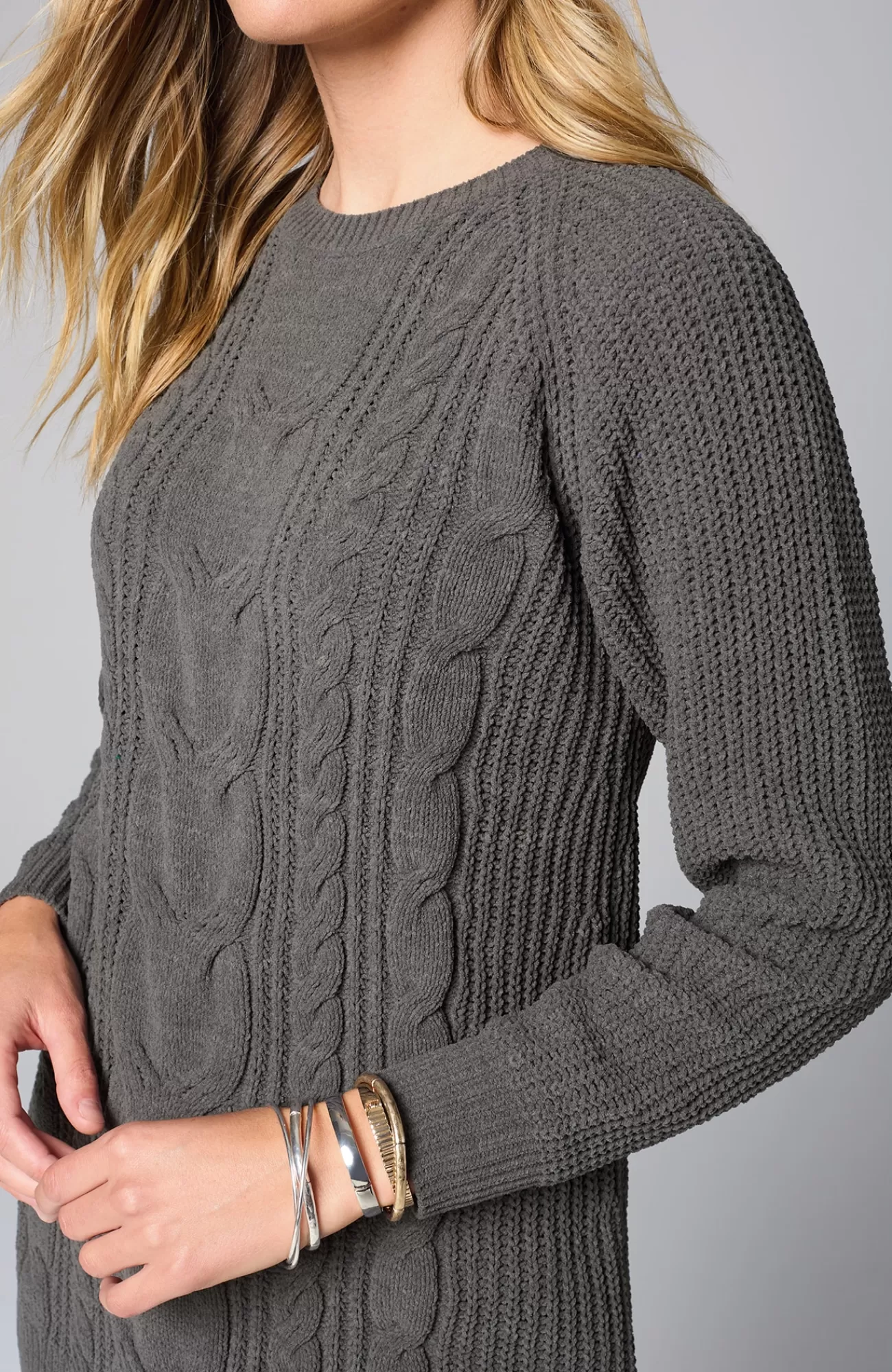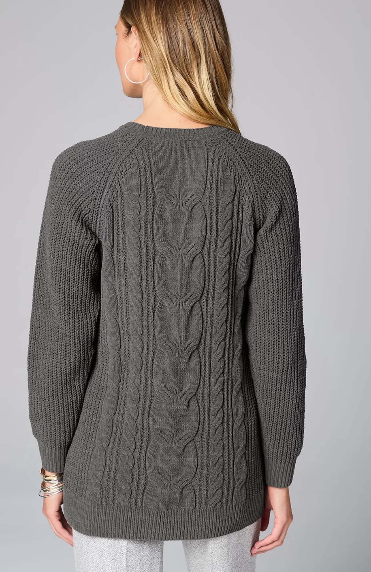 A lovely blend of textures brings a special touch to this sweater tunic. The soft-as-ever chenille you love is back, and this year we're accentuating it with placed cables for effortless styling, whether you're dressing up or down. Raglan sleeves. Finished with a ribbed neckline, cuffs and hem.