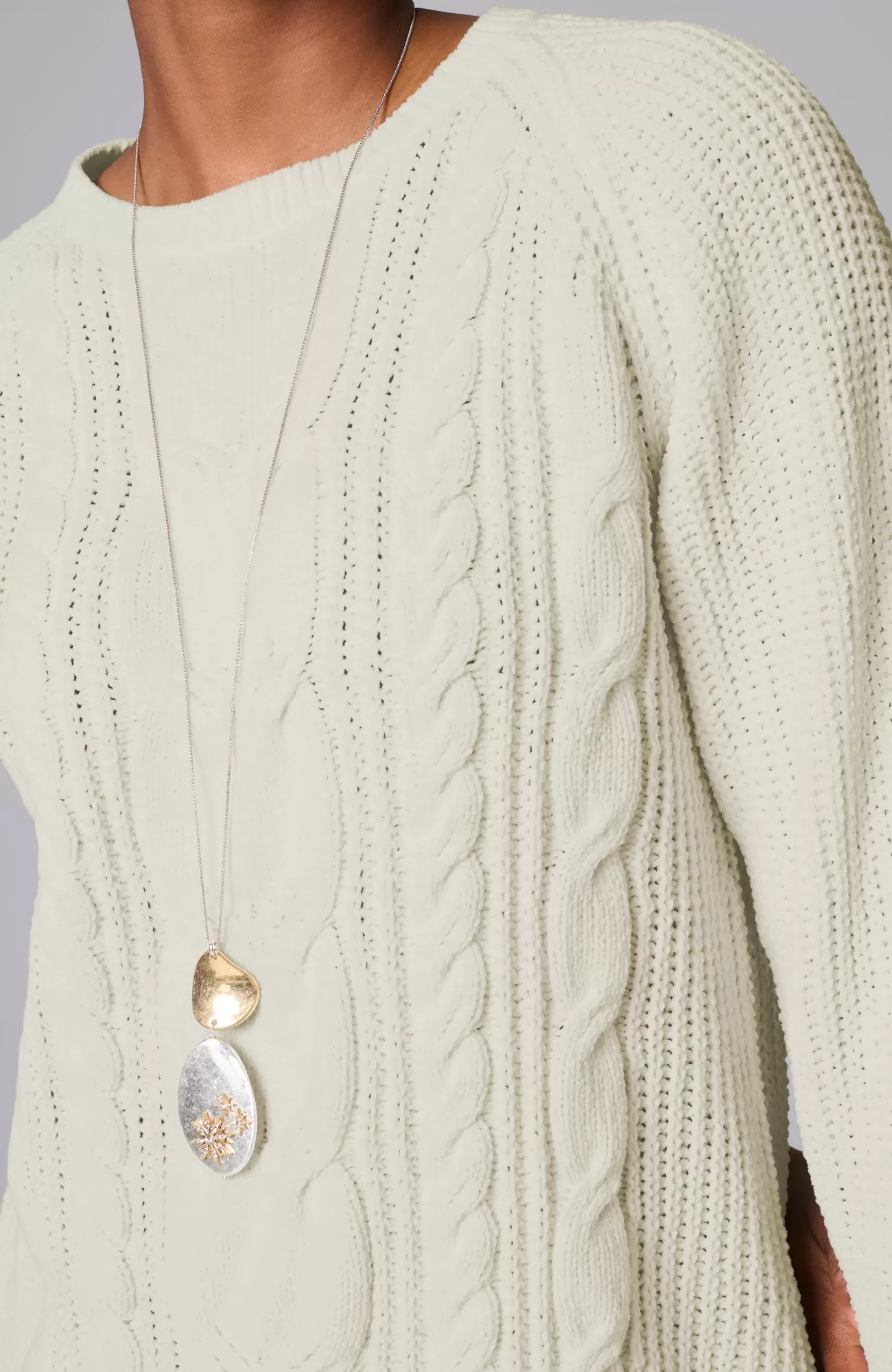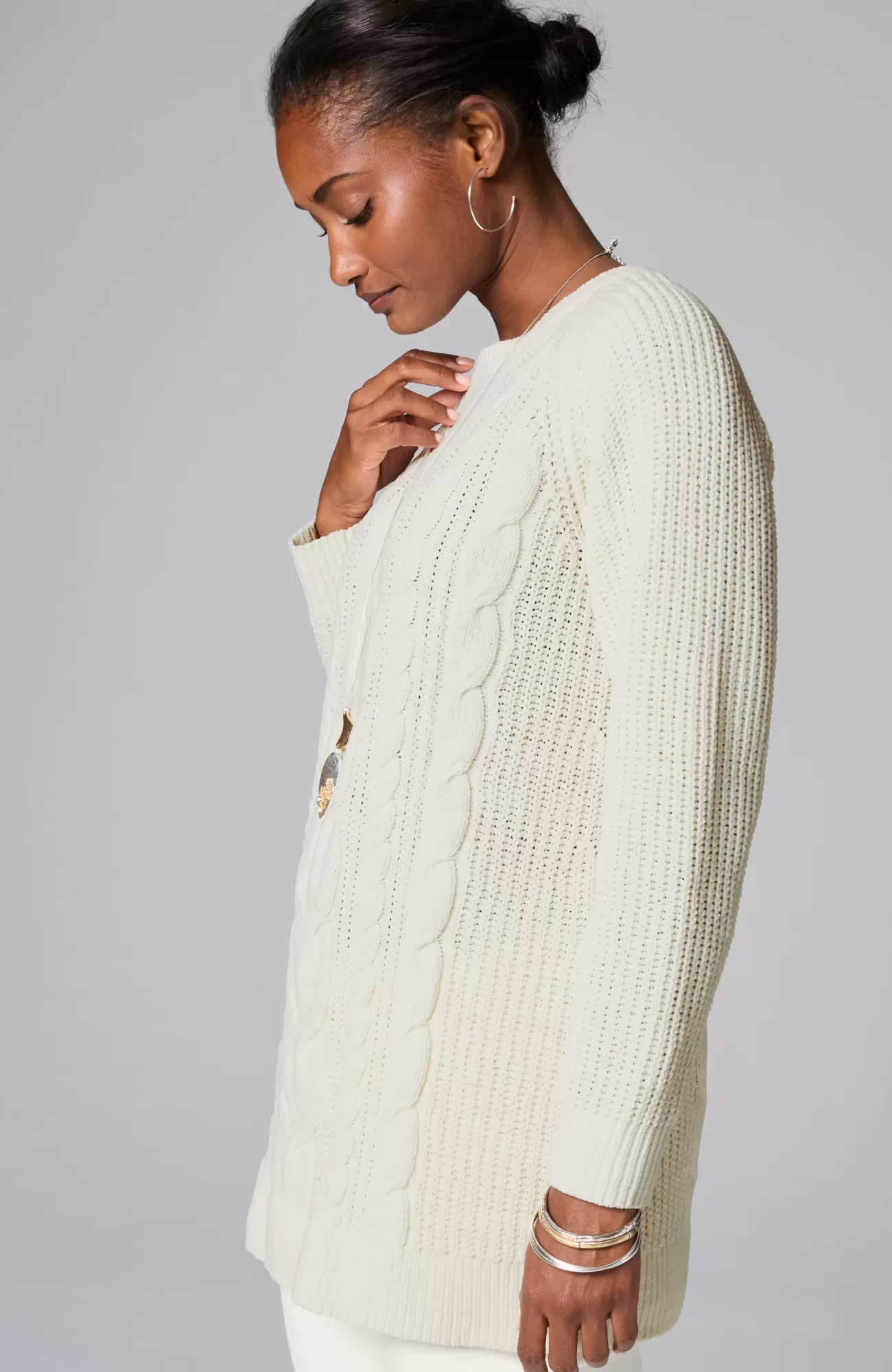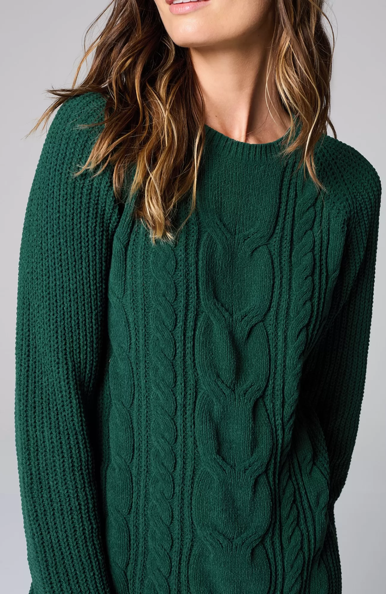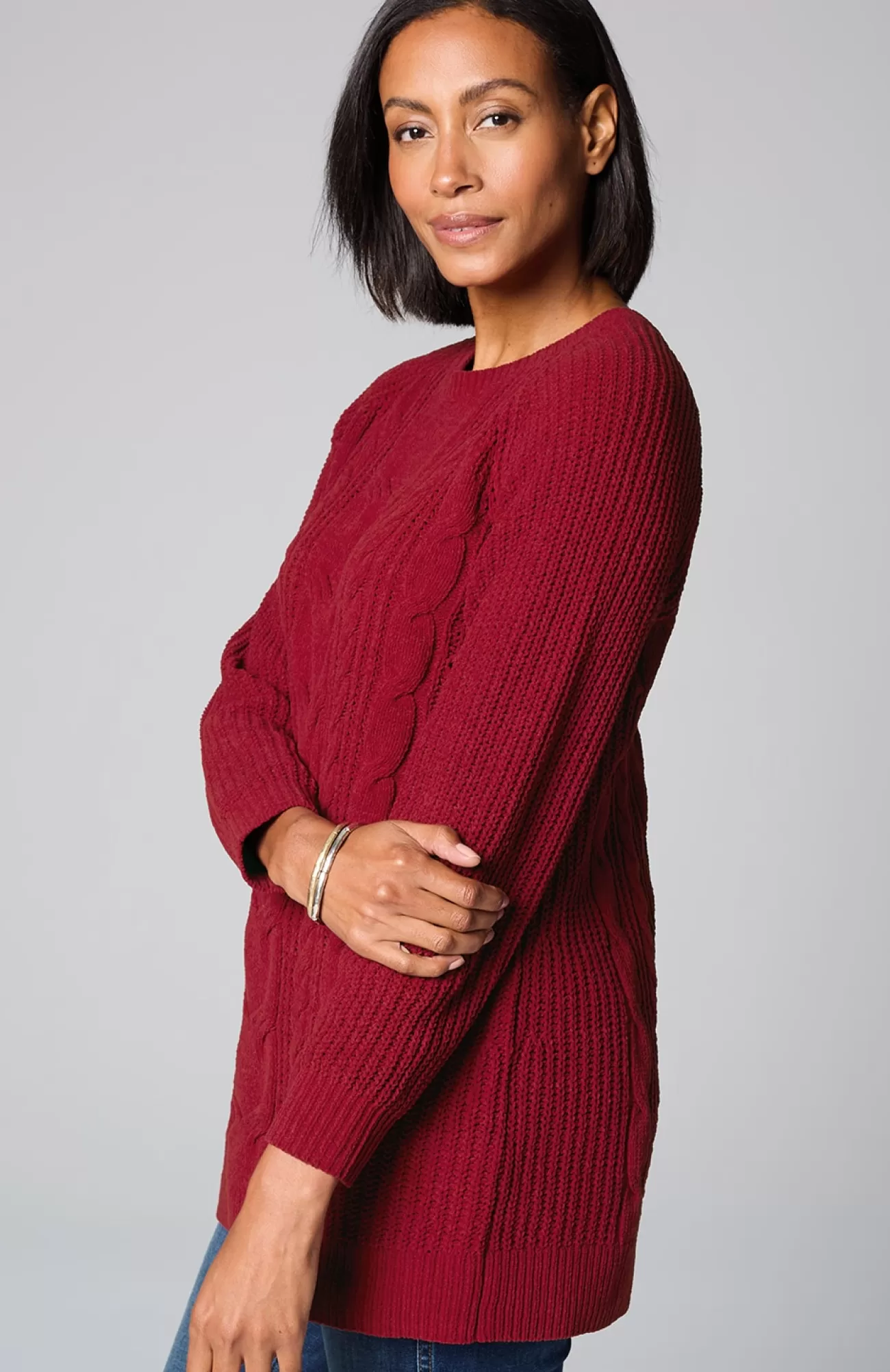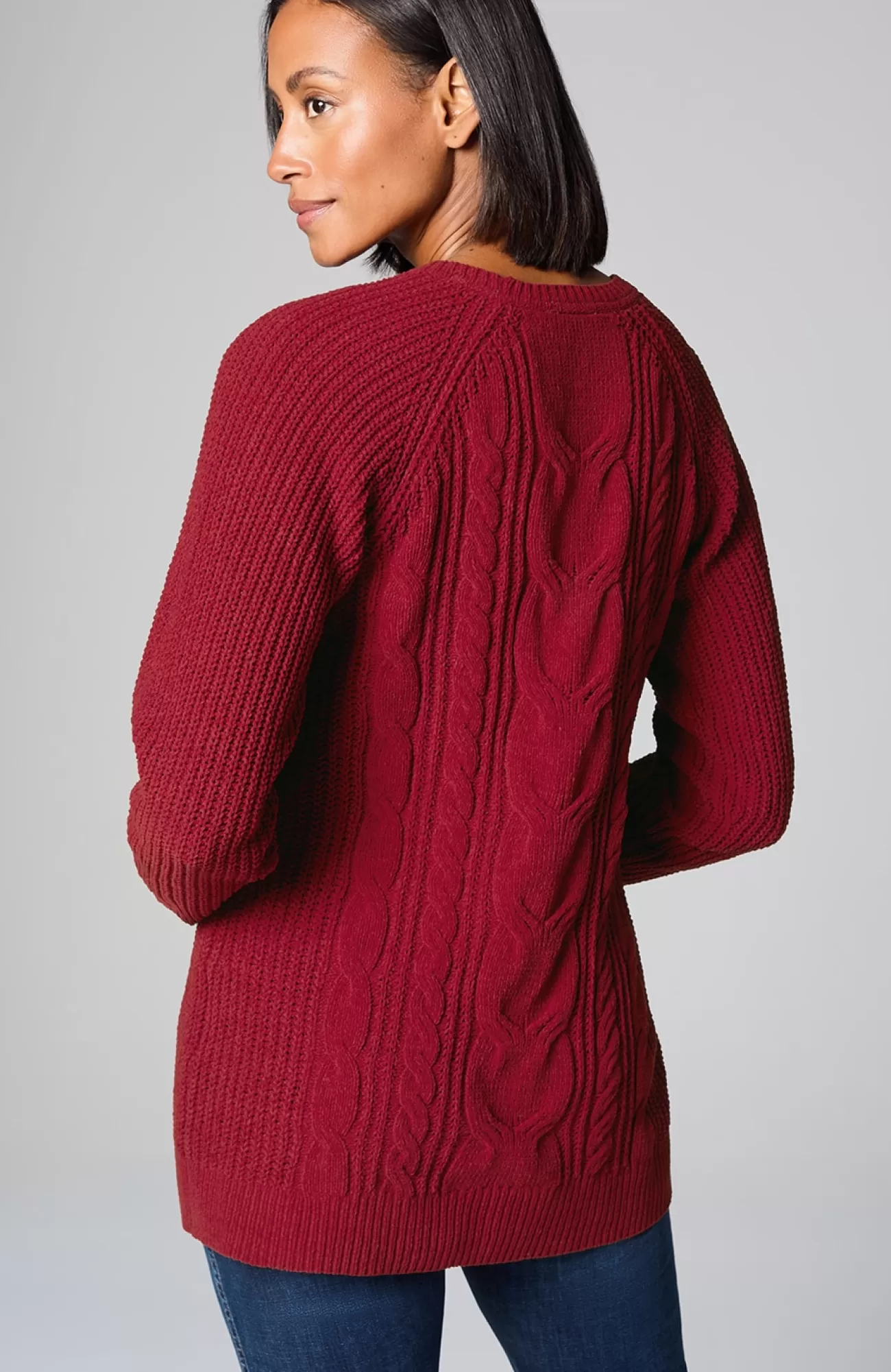 A lovely blend of textures brings a special touch to this sweater tunic. The soft-as-ever chenille you love is back, and this year we're accentuating it with placed cables for effortless styling, whether you're dressing up or down. Raglan sleeves. Finished with a ribbed neckline, cuffs and hem.