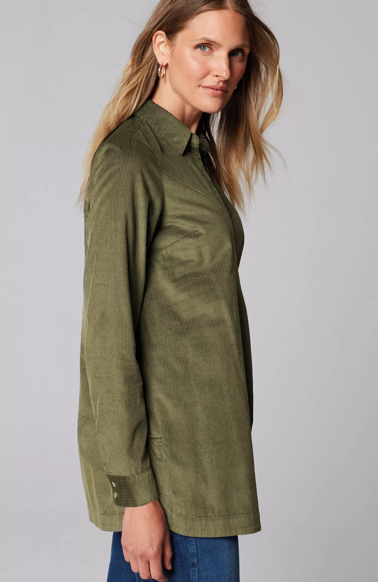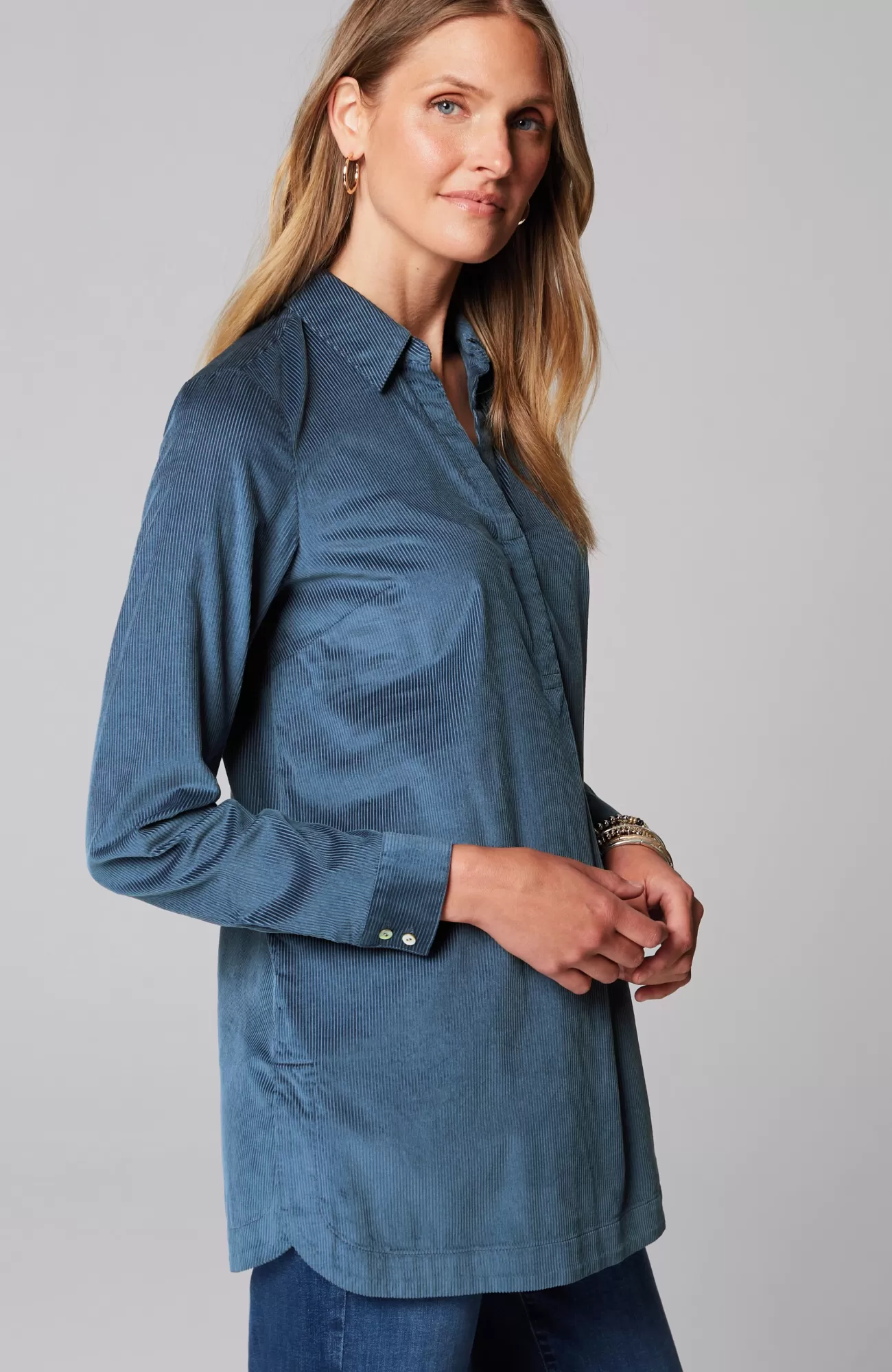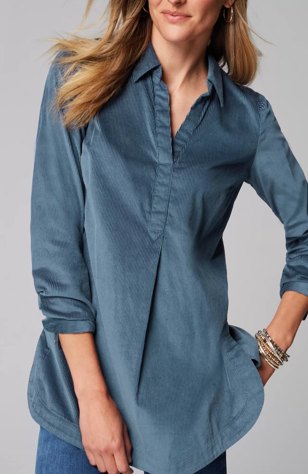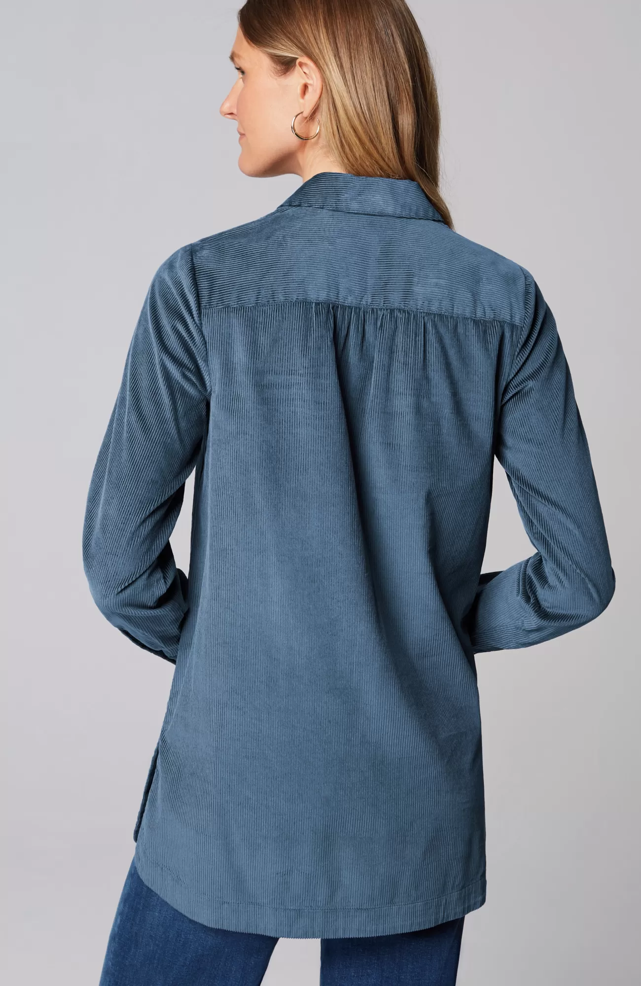 Designed in a wide-wale fabric with a luxuriously soft feel, our corduroy A-line popover is the perfect fall staple. It has classic details like a shirt collar, buttoned cuffs and a longer length, mixed with modern accents like rounded-corner side slits, shirring at the back yoke and a subtle front pleat. Catalog & Online Exclusive.