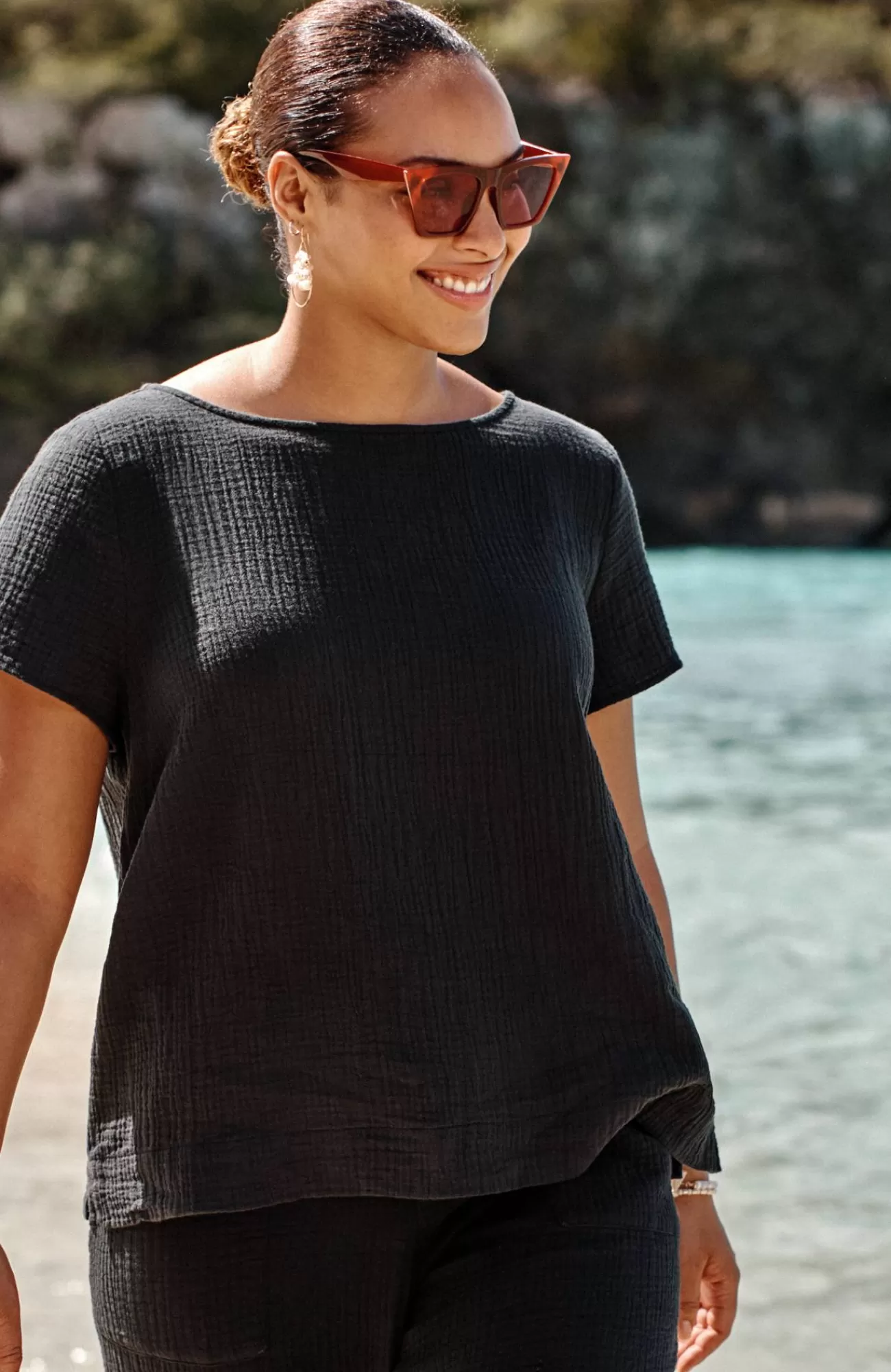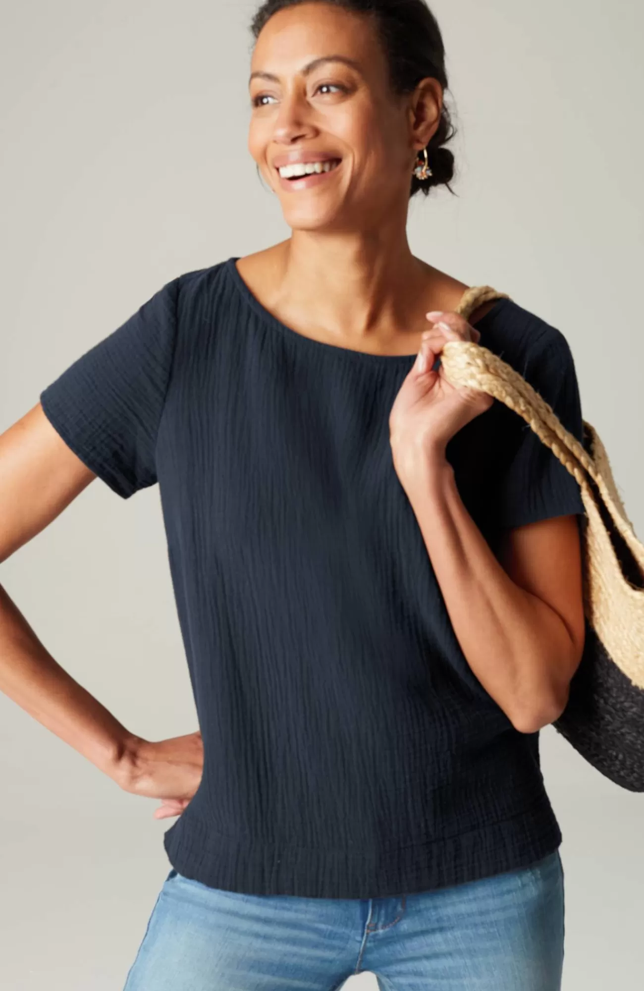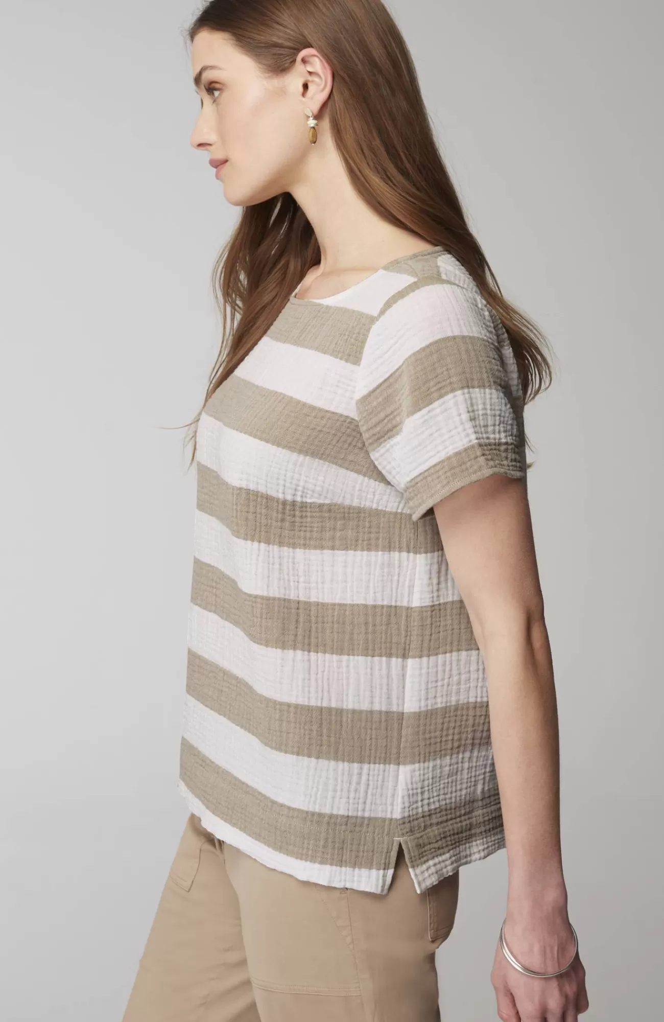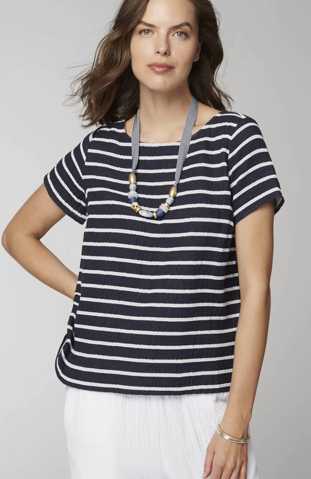 Our relaxed boat-neck top is made with a cotton-gauze fabric for a slightly more substantial look and feel that's both soft and light. It will be a warm-weather favorite as the shorter length gives you so many styling options. You'll love it with jeans, crops, shorts and skirts. Side vents.