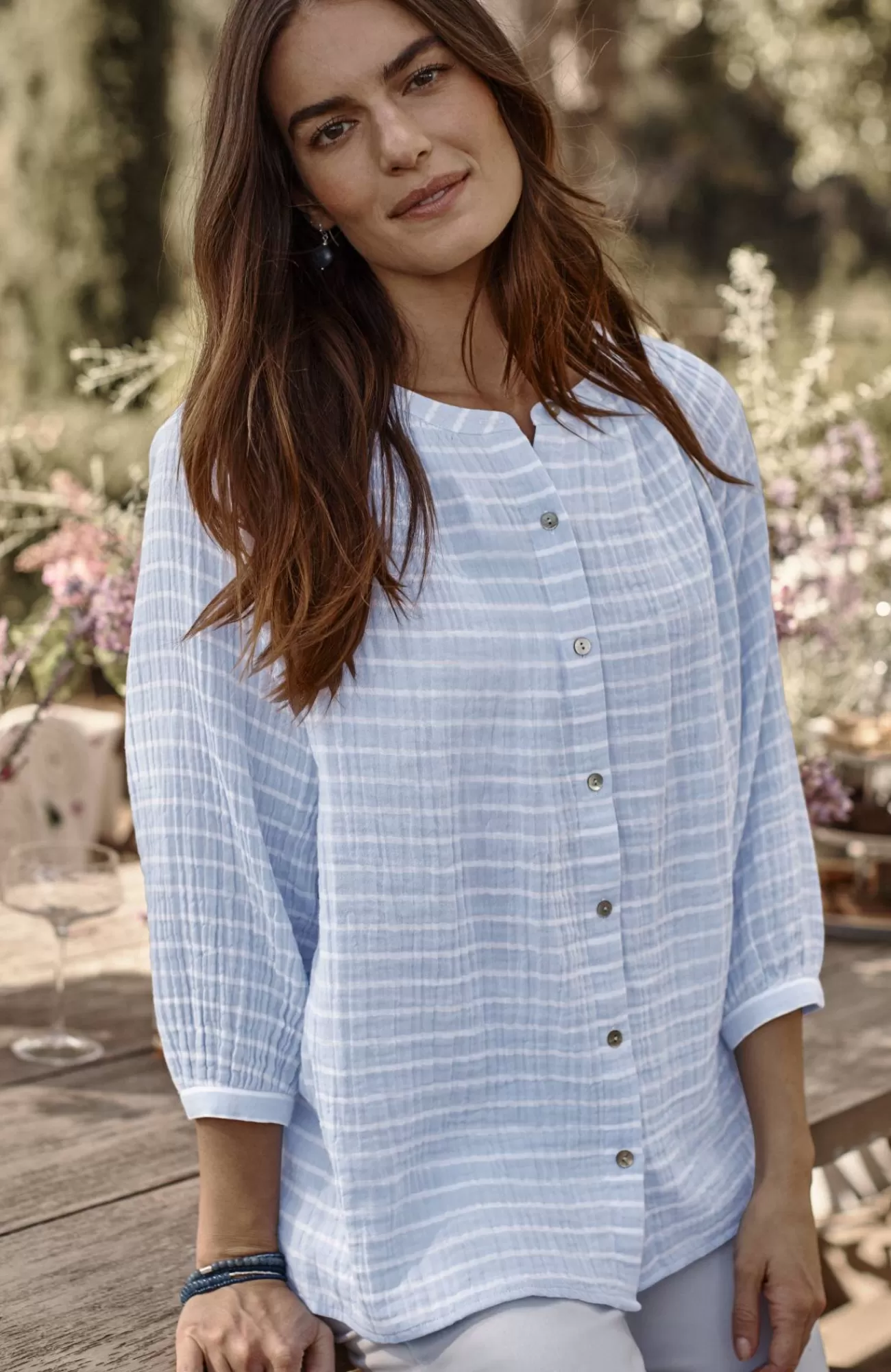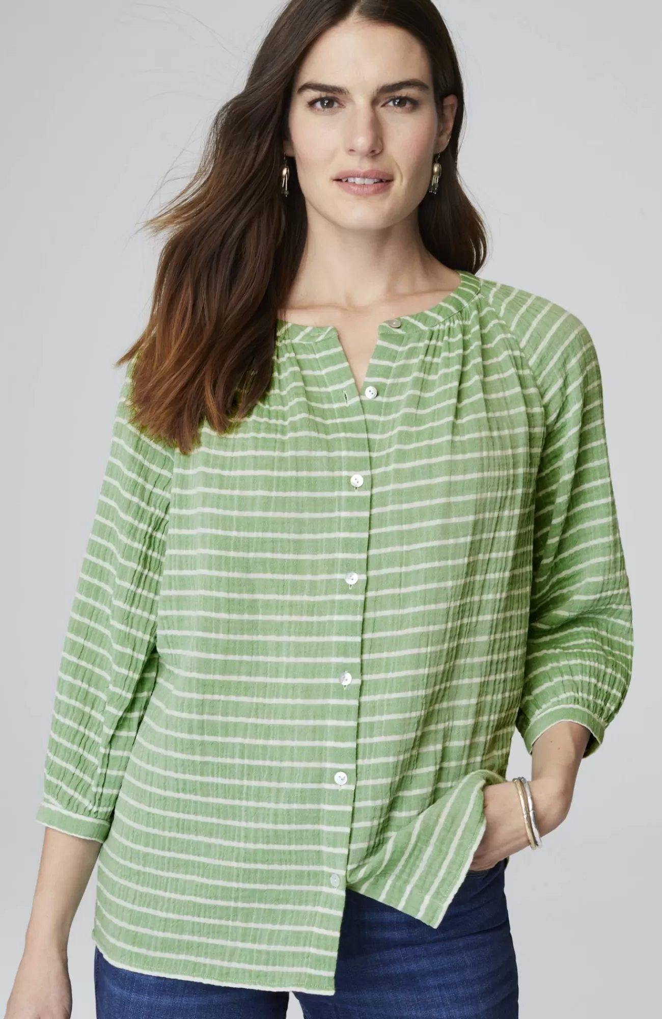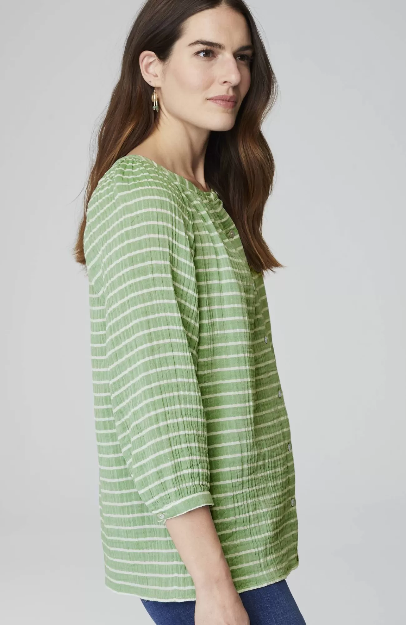 Happy stripes in a wardrobe essential?our button-front A-line top, crafted from soft, light cotton gauze, in colorful yarn-dyed stripes, with subtle shirring at the neckline. Buttoned cuffs.
