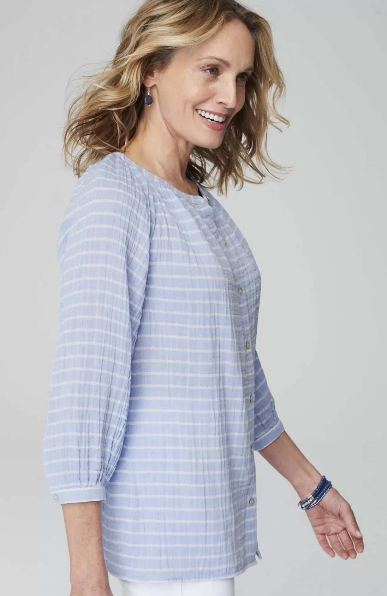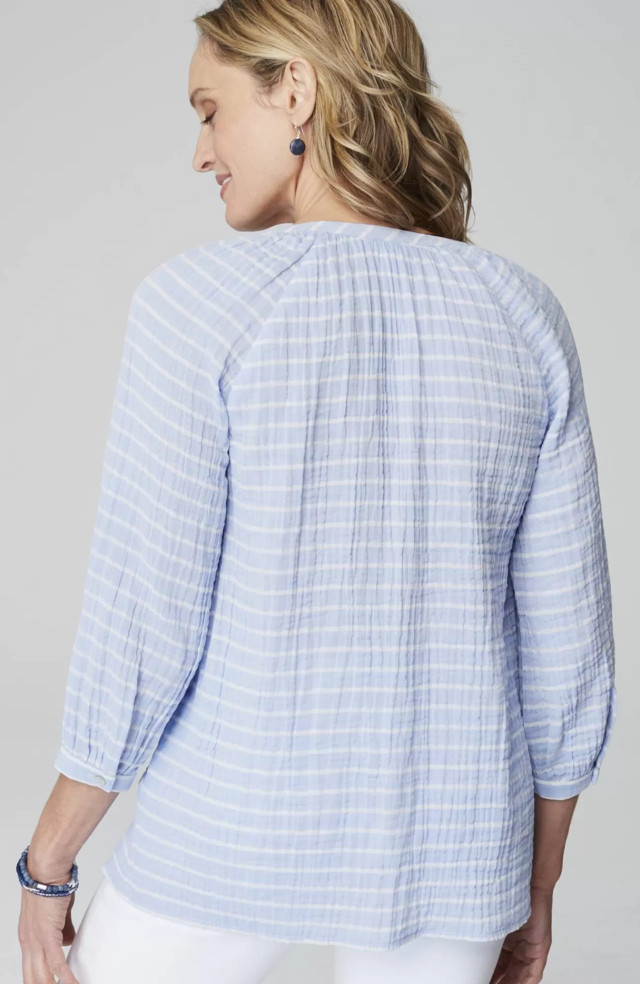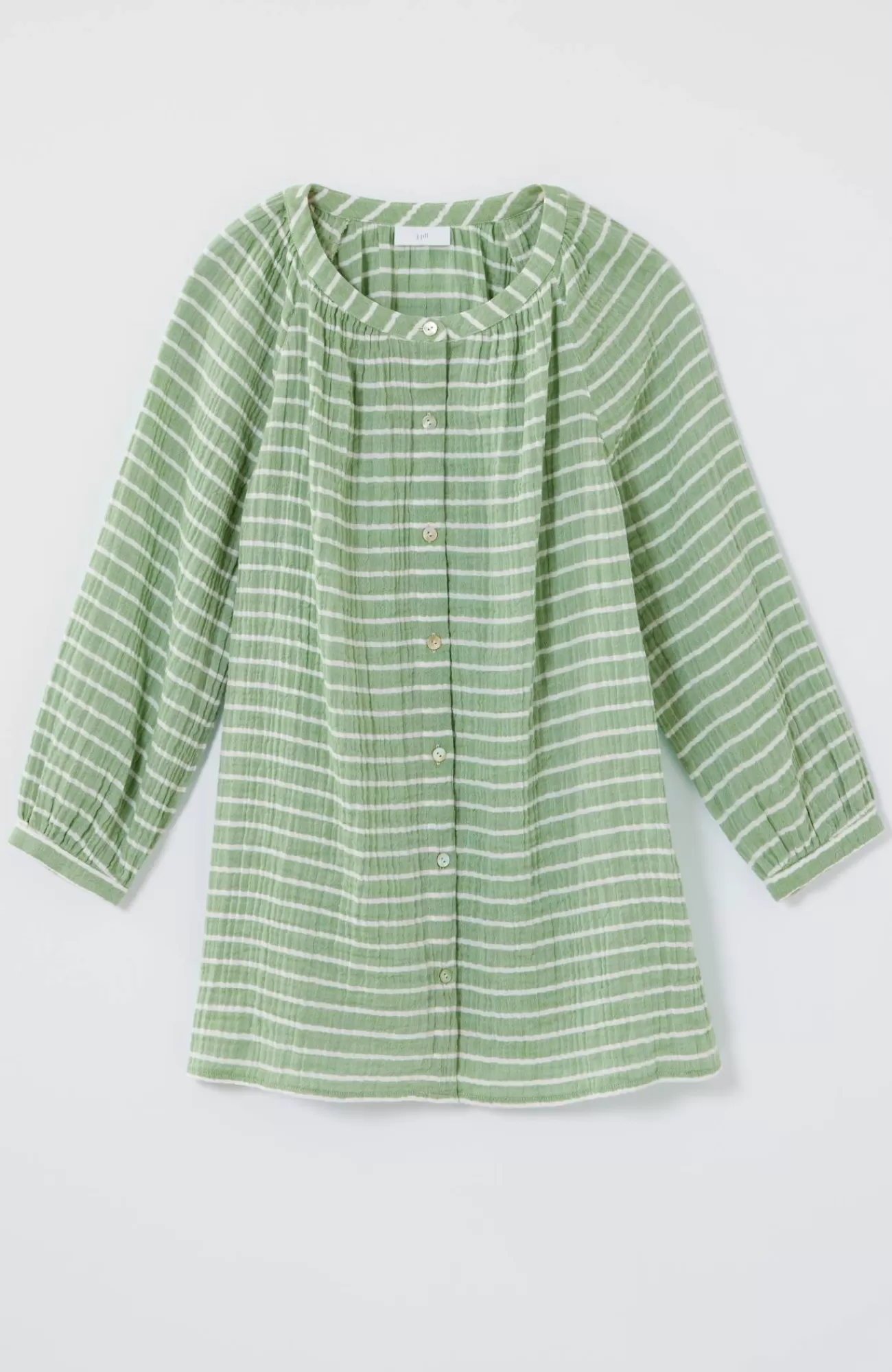 Happy stripes in a wardrobe essential?our button-front A-line top, crafted from soft, light cotton gauze, in colorful yarn-dyed stripes, with subtle shirring at the neckline. Buttoned cuffs.