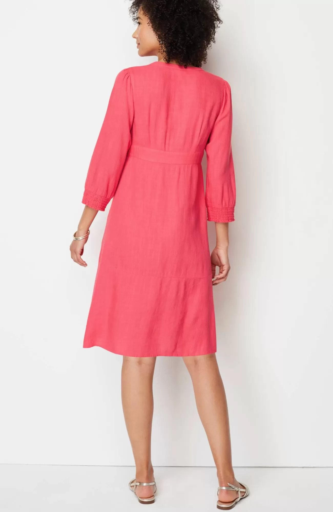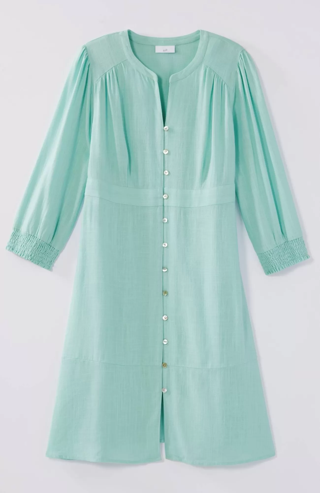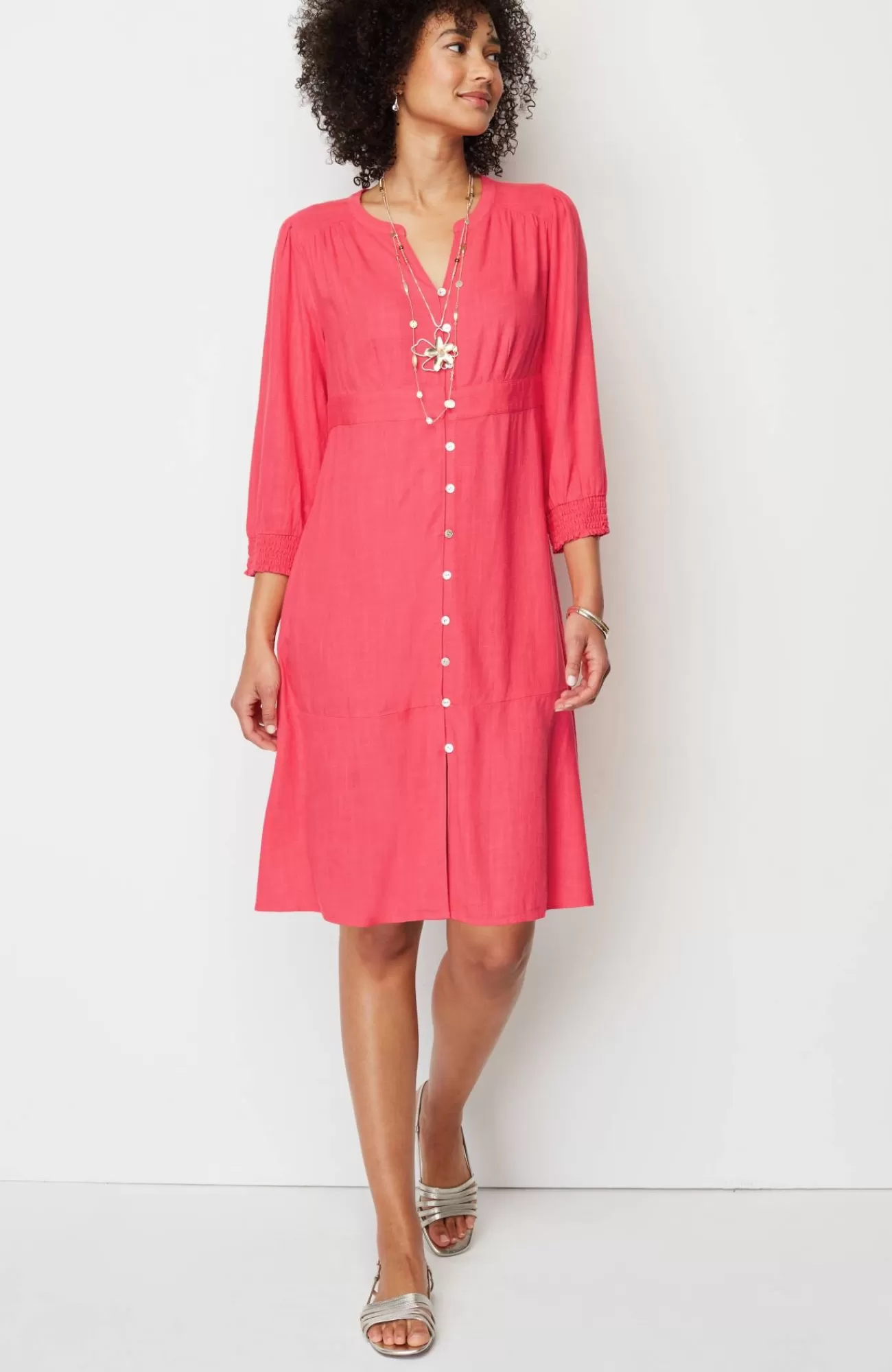 The button-front dress with extra personality: crafted from a breezy, lightweight linen blend, with a fun flounced hem and subtle smocking at the cuffs.