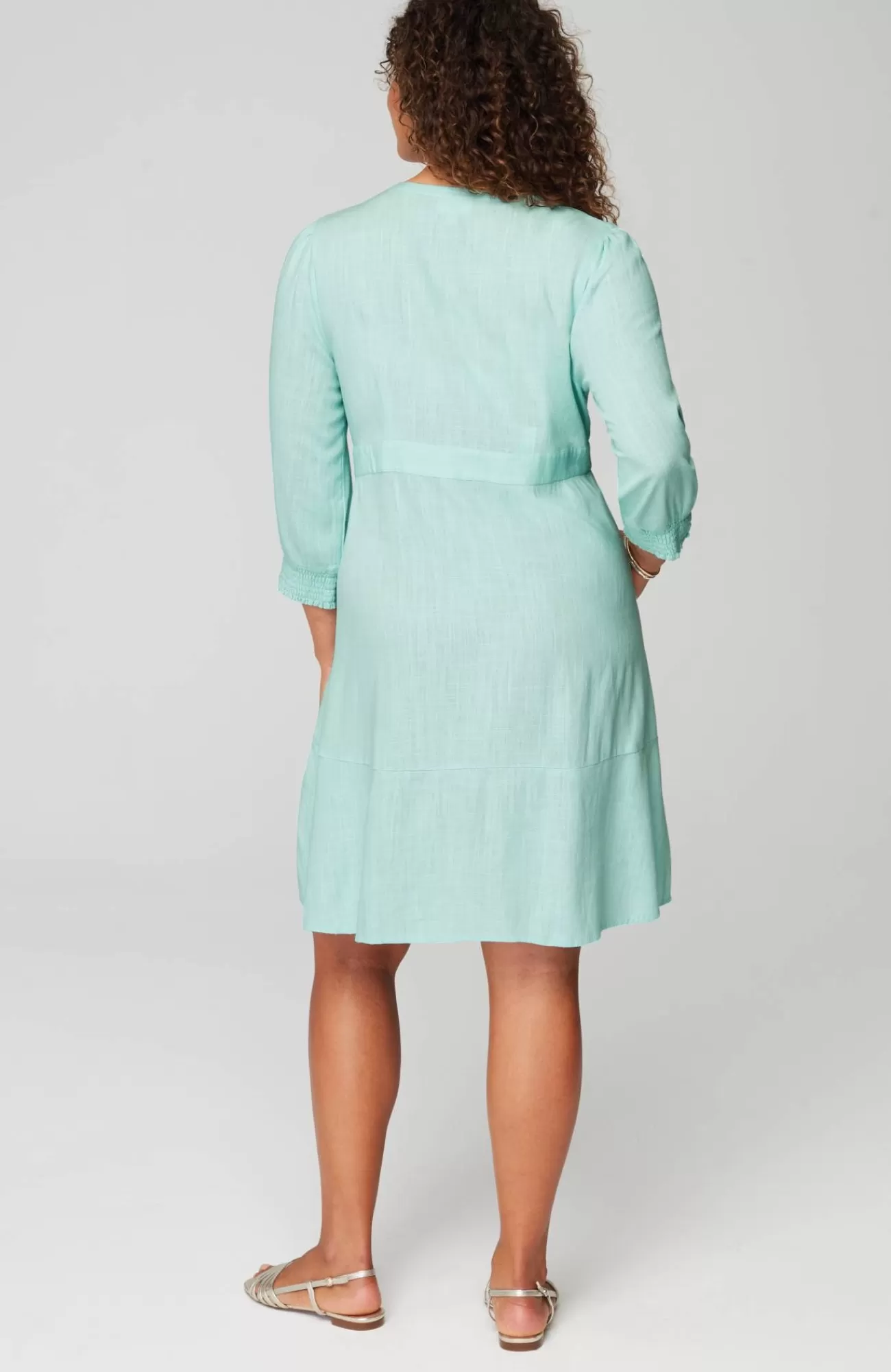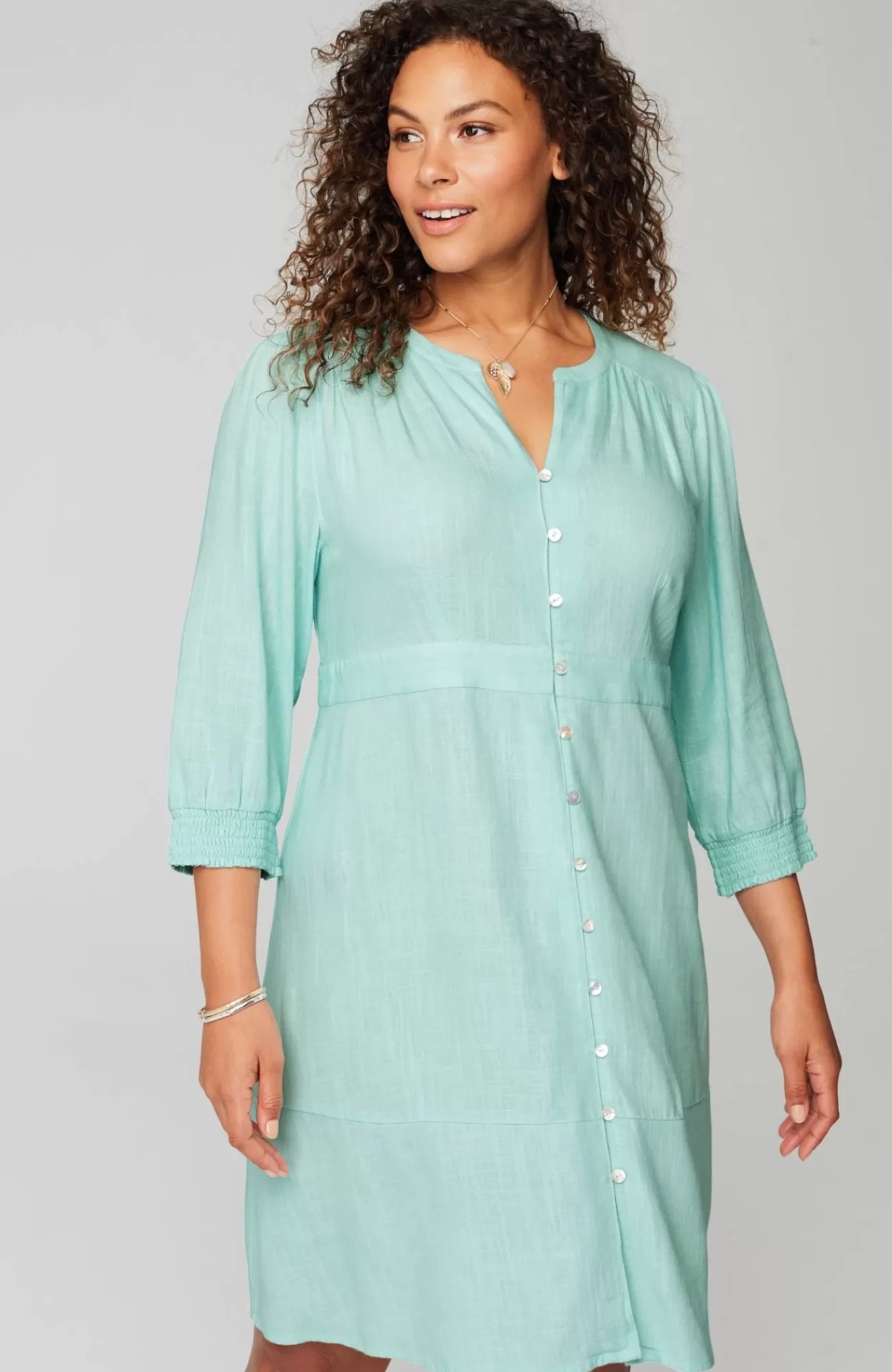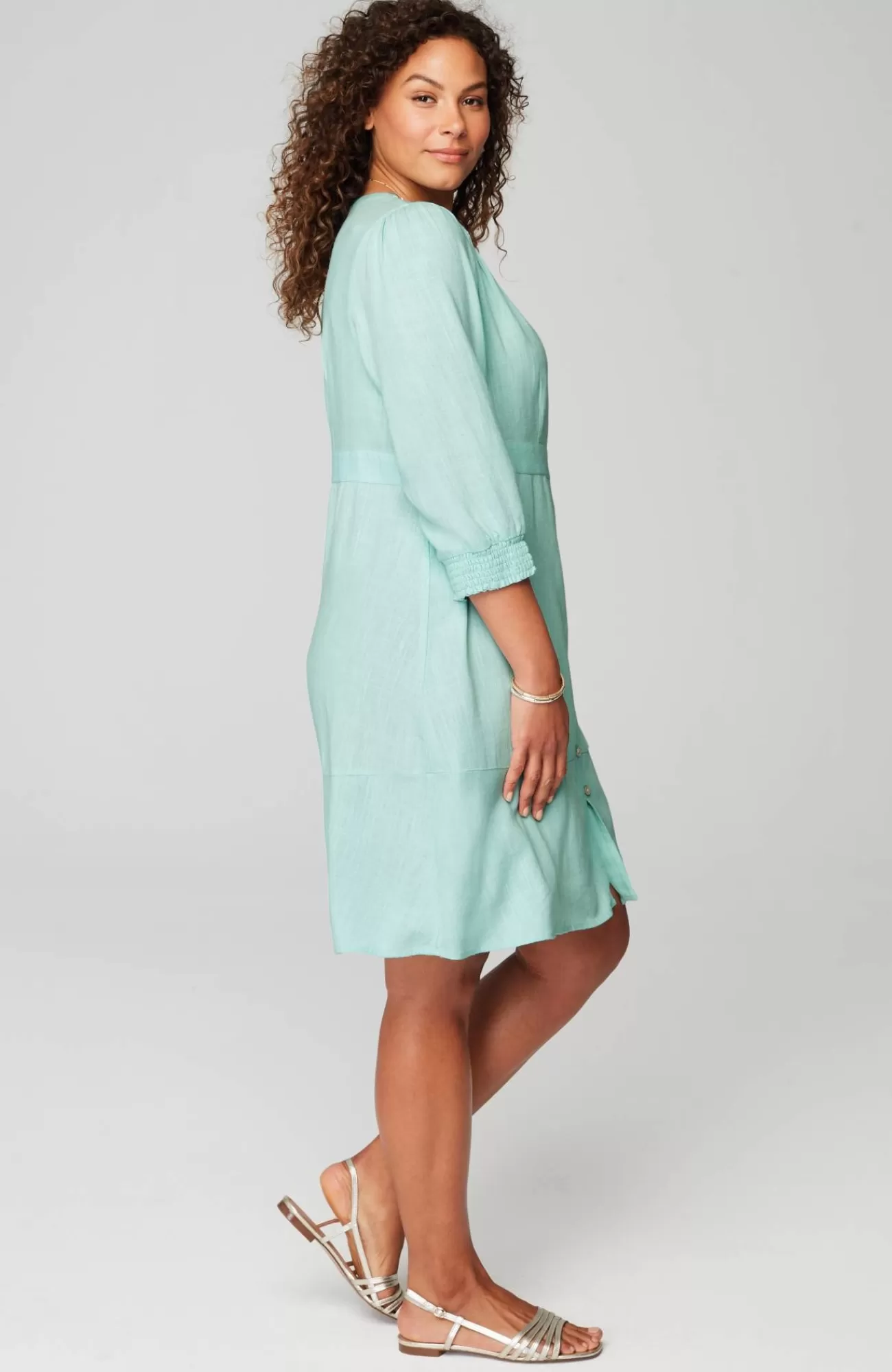 The button-front dress with extra personality: crafted from a breezy, lightweight linen blend, with a fun flounced hem and subtle smocking at the cuffs.