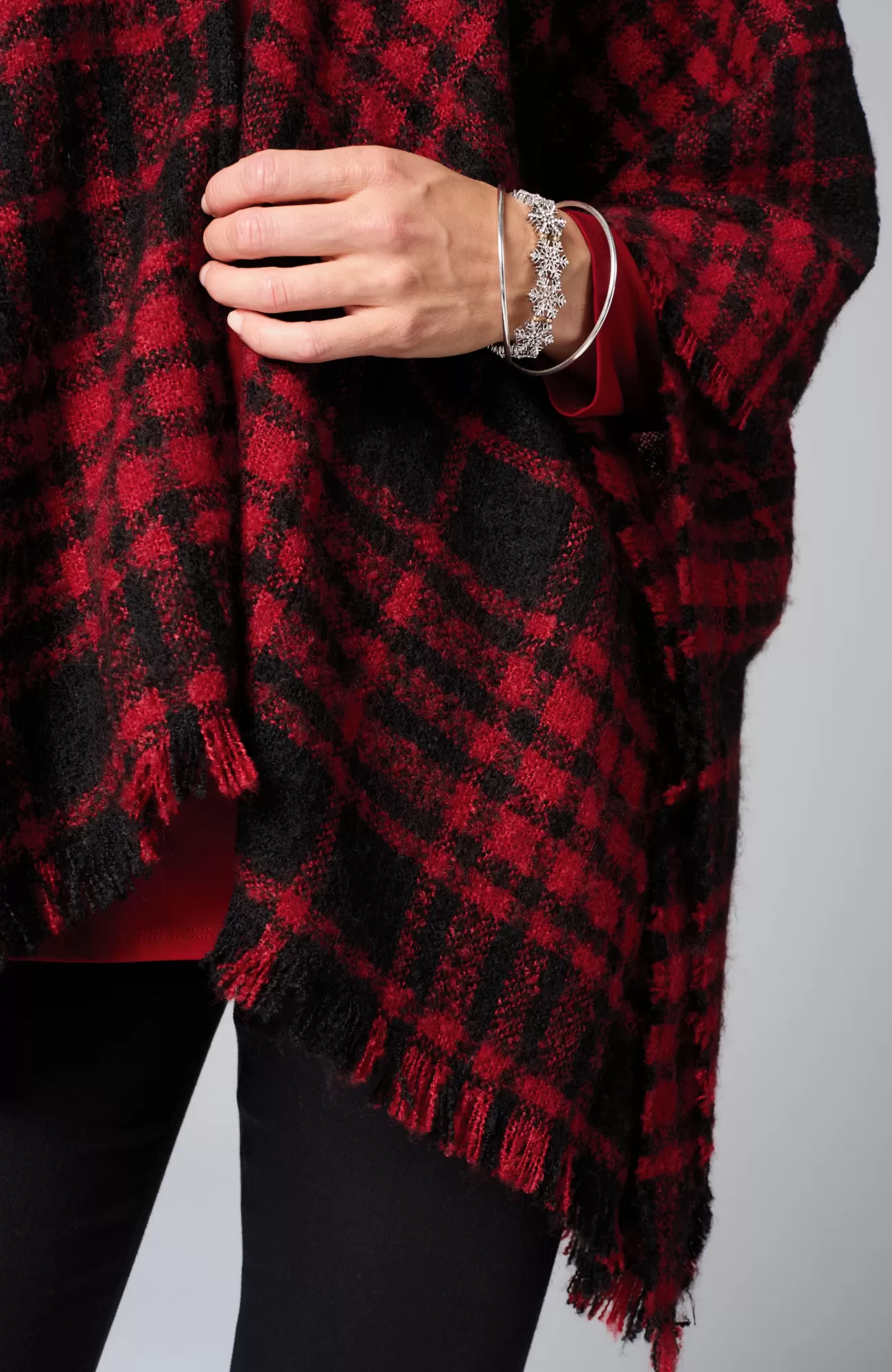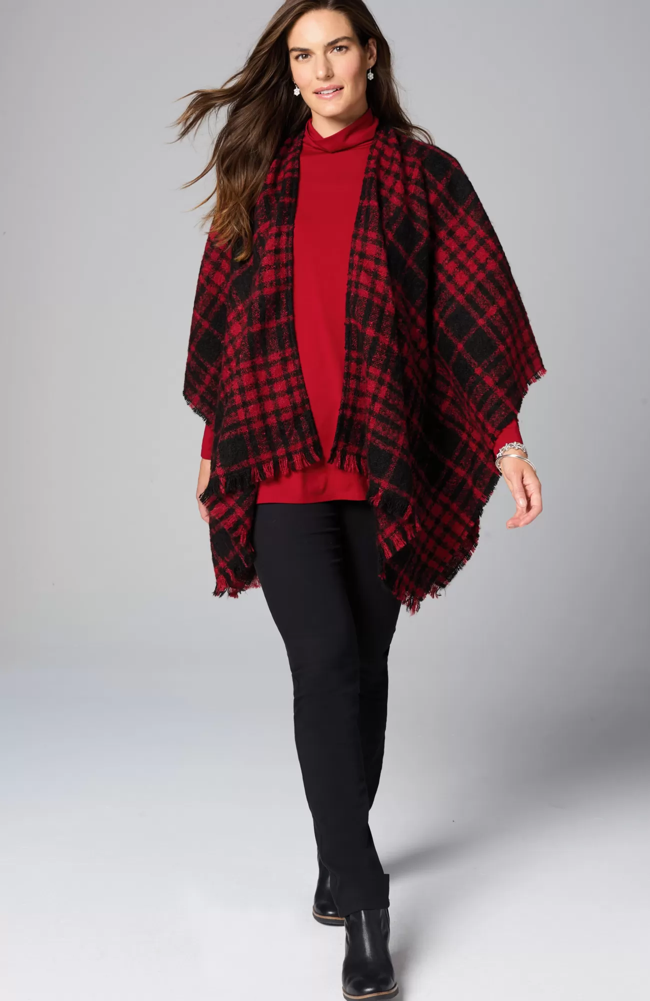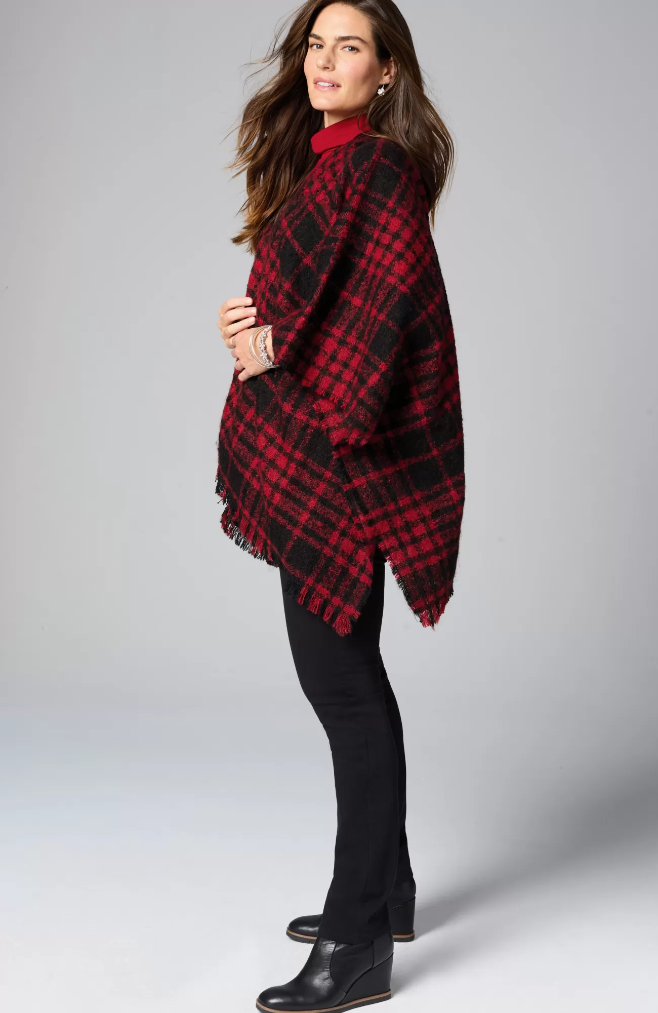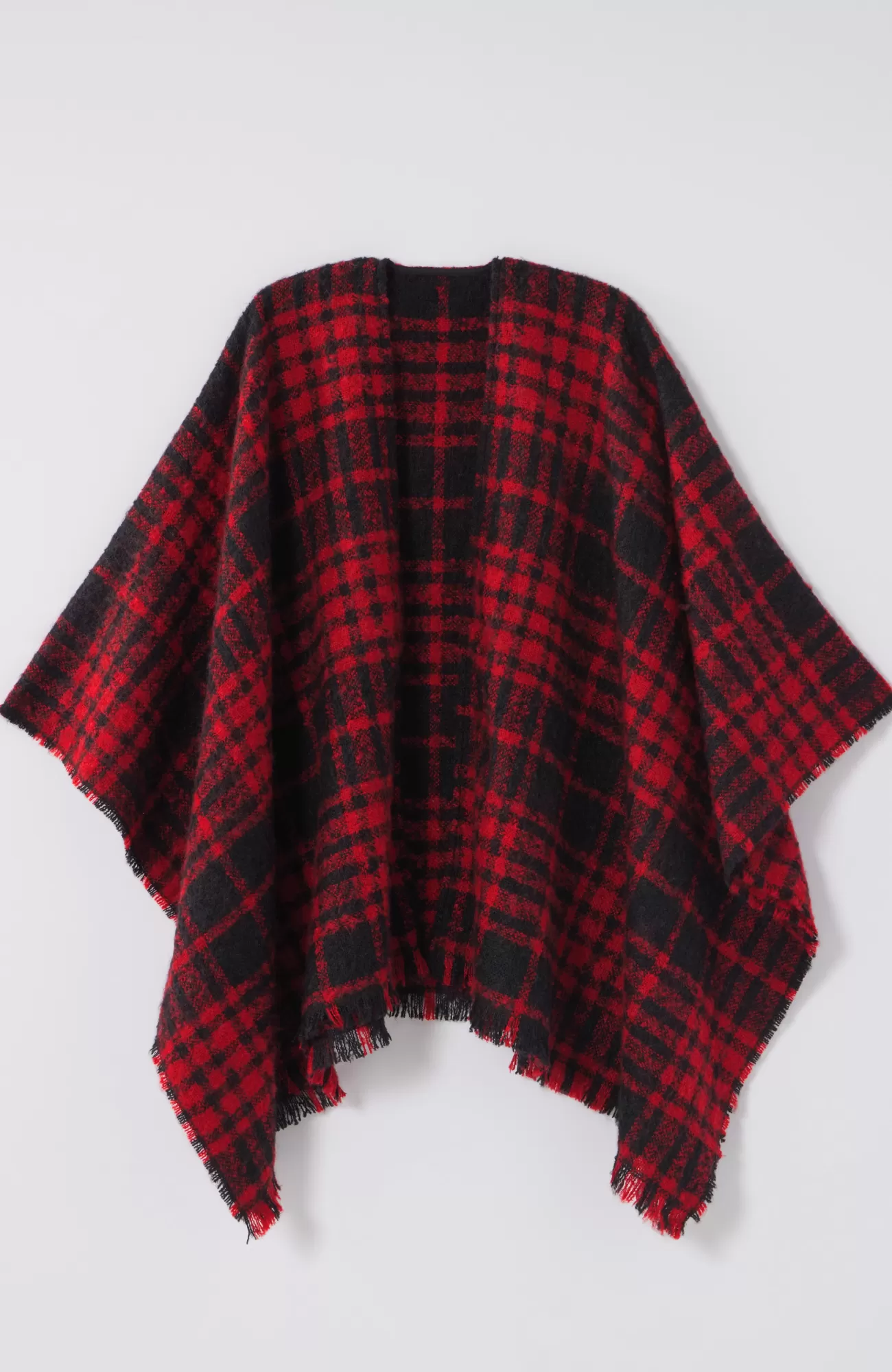 Meet your favorite festive poncho, refreshed as a ruana—we kept the classic oversized plaid and eyelash fringe, but the new open front makes this style easy to throw on and go. Designed in 100% recycled polyester, it's a look-good, feel-good layer for any day of the week. Tacked at the sides.