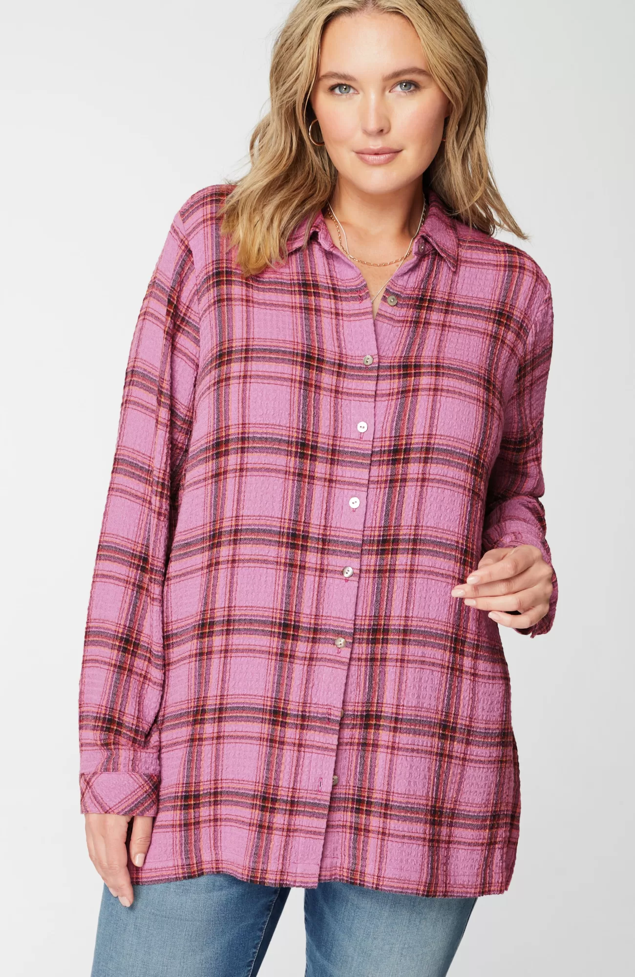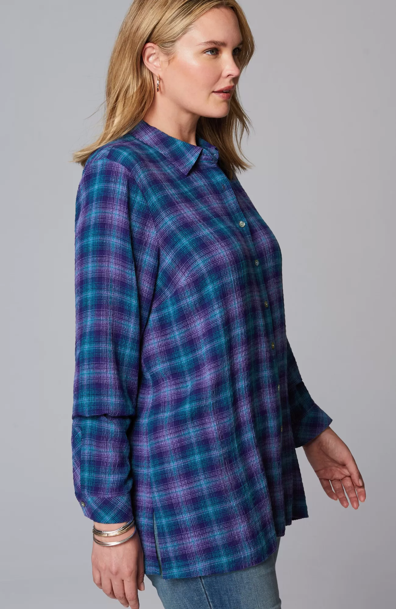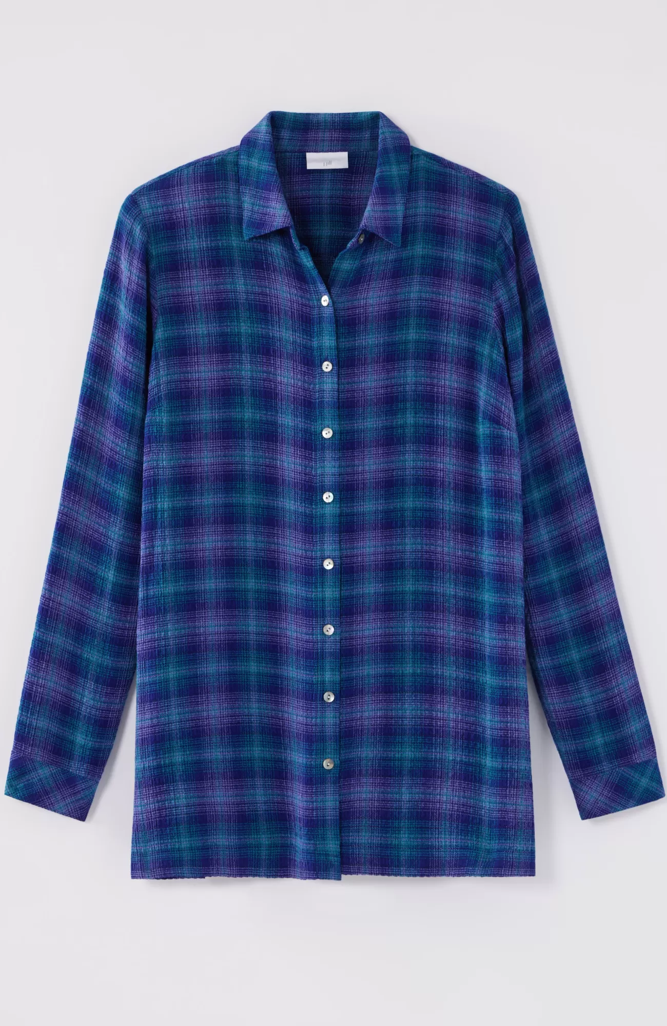 Our button-front tunic has an allover crinkle texture that complements the classic details you love, like a shirt collar, faux-horn buttoned placket and cuffs, pleated back, and side slits.