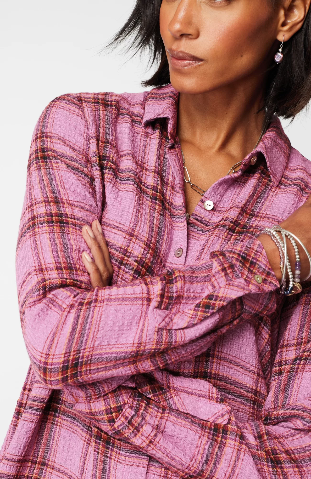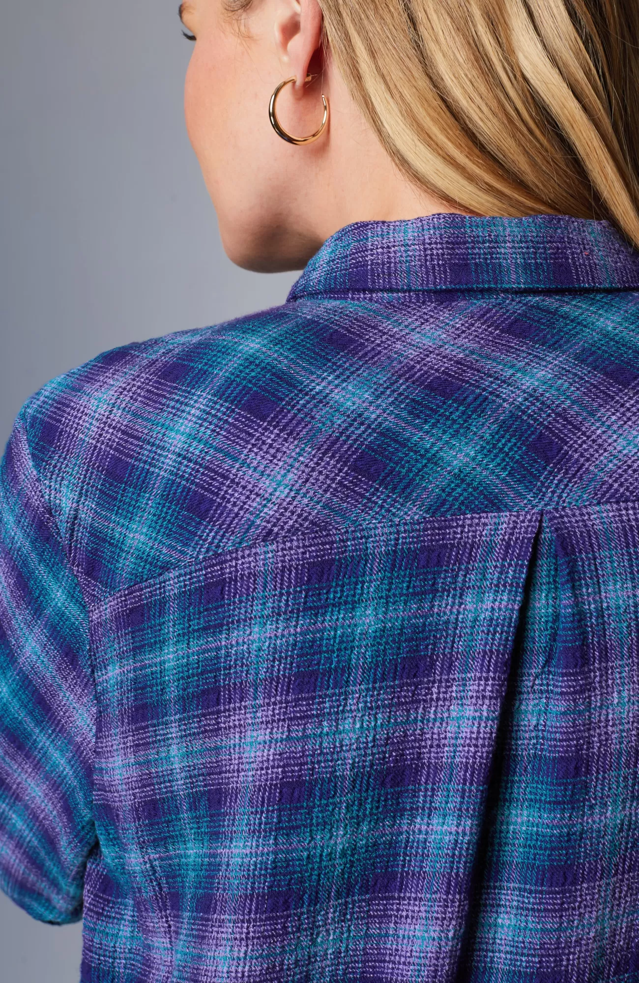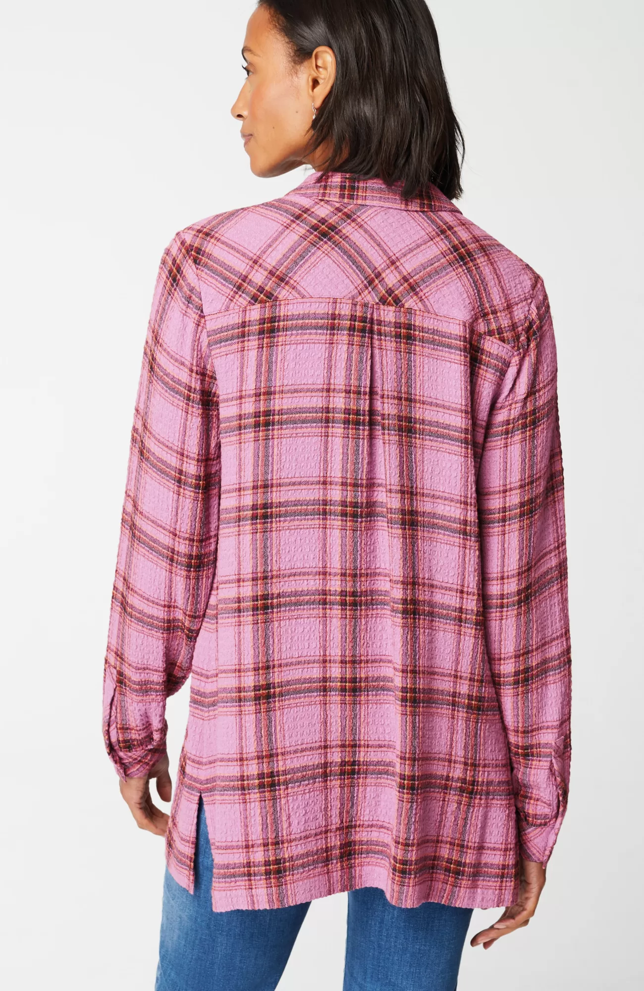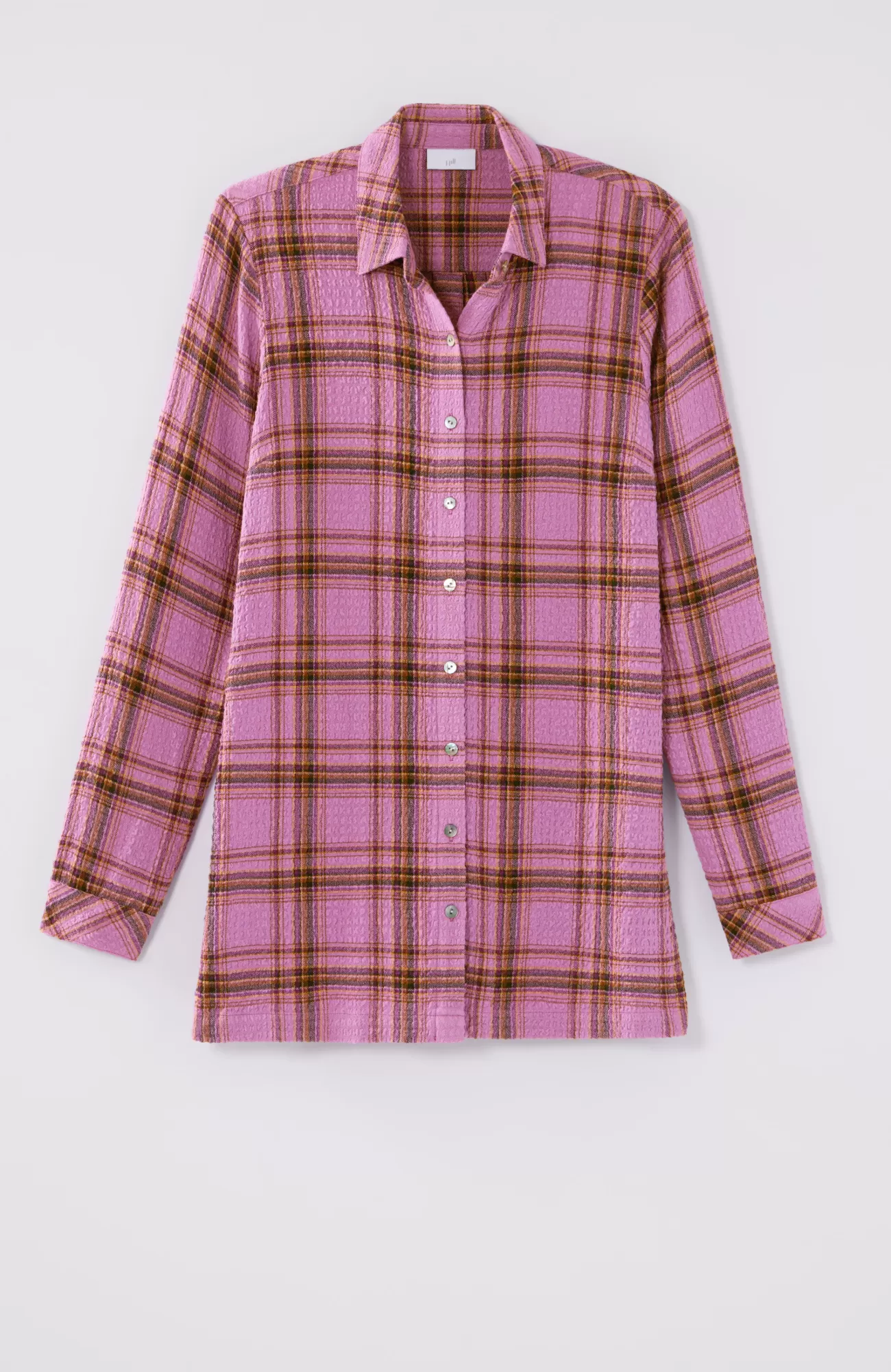 Our button-front tunic has an allover crinkle texture that complements the classic details you love, like a shirt collar, faux-horn buttoned placket and cuffs, pleated back, and side slits.
