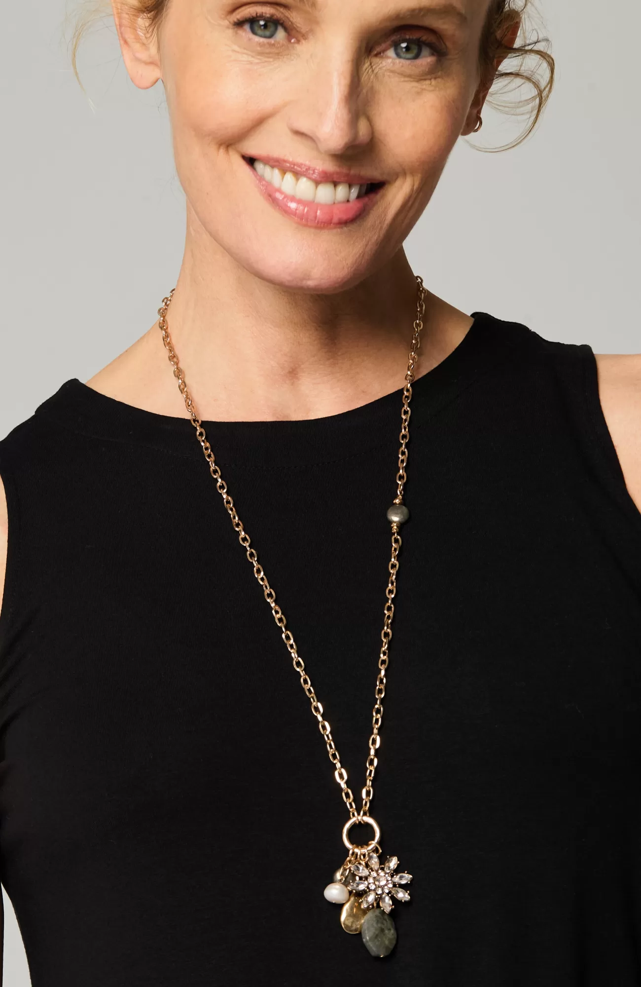 All the sparkle and shine of the holidays wrapped up in one garland chain necklace. Our cluster pendant features freshwater pearl, semiprecious pyrite, semiprecious labradorite, goldtone metal and a flower cast in crystal. Lobster-claw clasp.