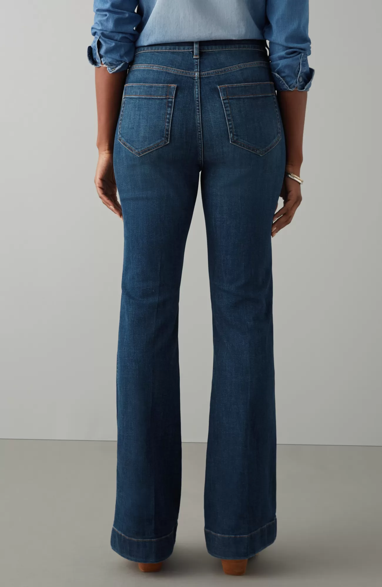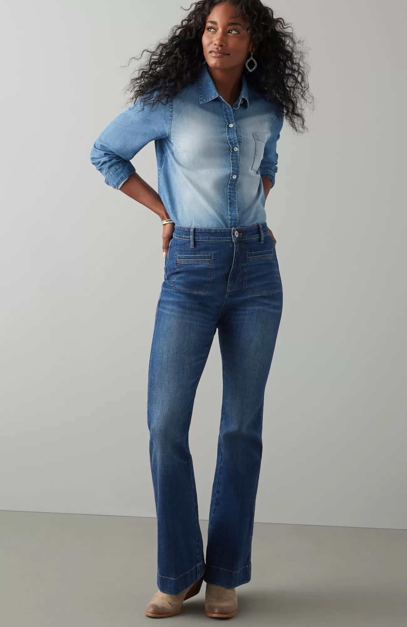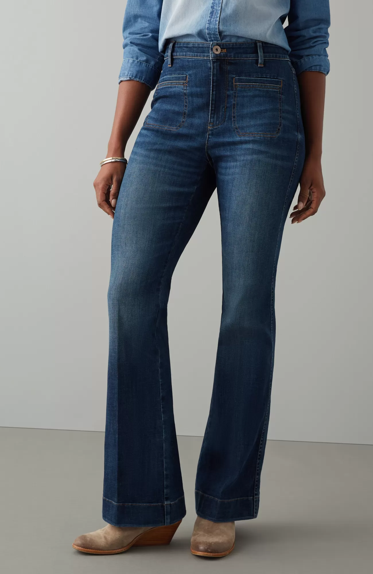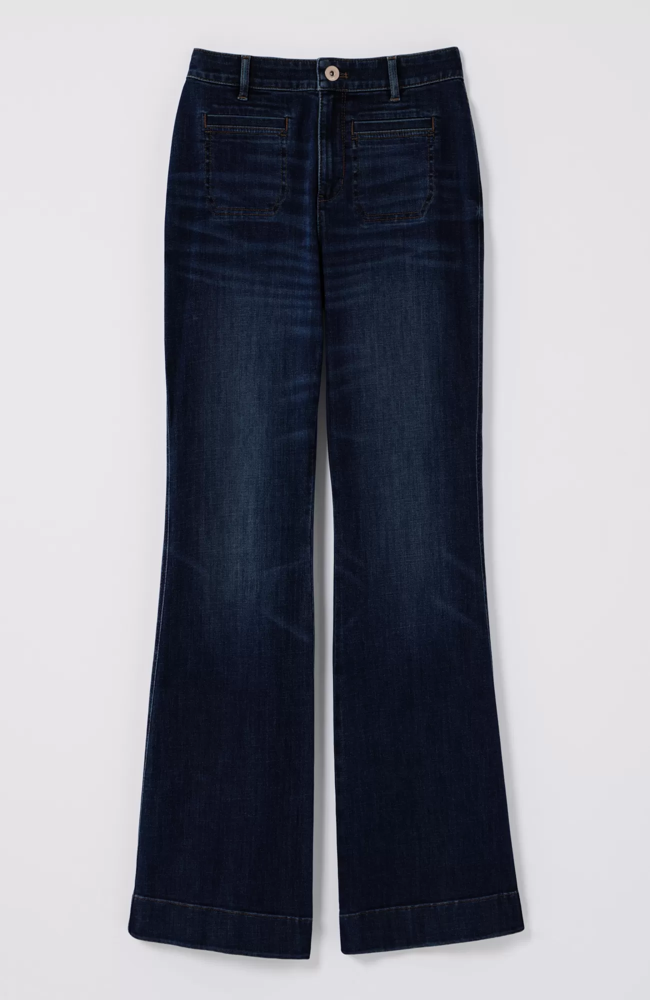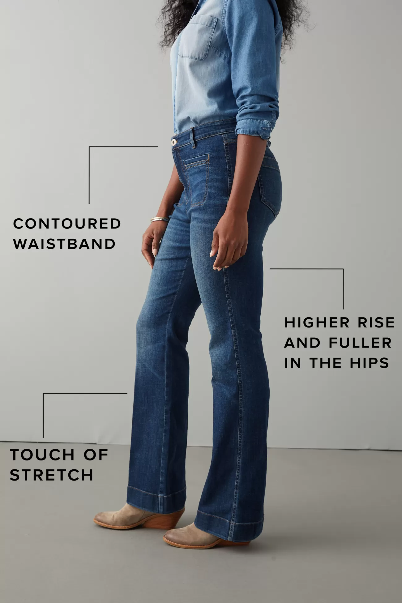 The curvy-fit jeans you love are here with an elevated flared leg. It's the fit that redefines proportions and resolves your struggle with the dreaded waist gap. This style features a waist-to-hip ratio engineered to suit a more hourglass figure. The higher rise and flattering fit feature a contoured waistband to minimize the waist gap while still offering the right amount of room in the hips to define curves. Plus, they have a touch of feel-good stretch to provide long-lasting comfort. Tried, tested and loved by multiple teams at our HQ. True to size. Front welt pockets. Back patch pockets. Belt loops. Available online only.