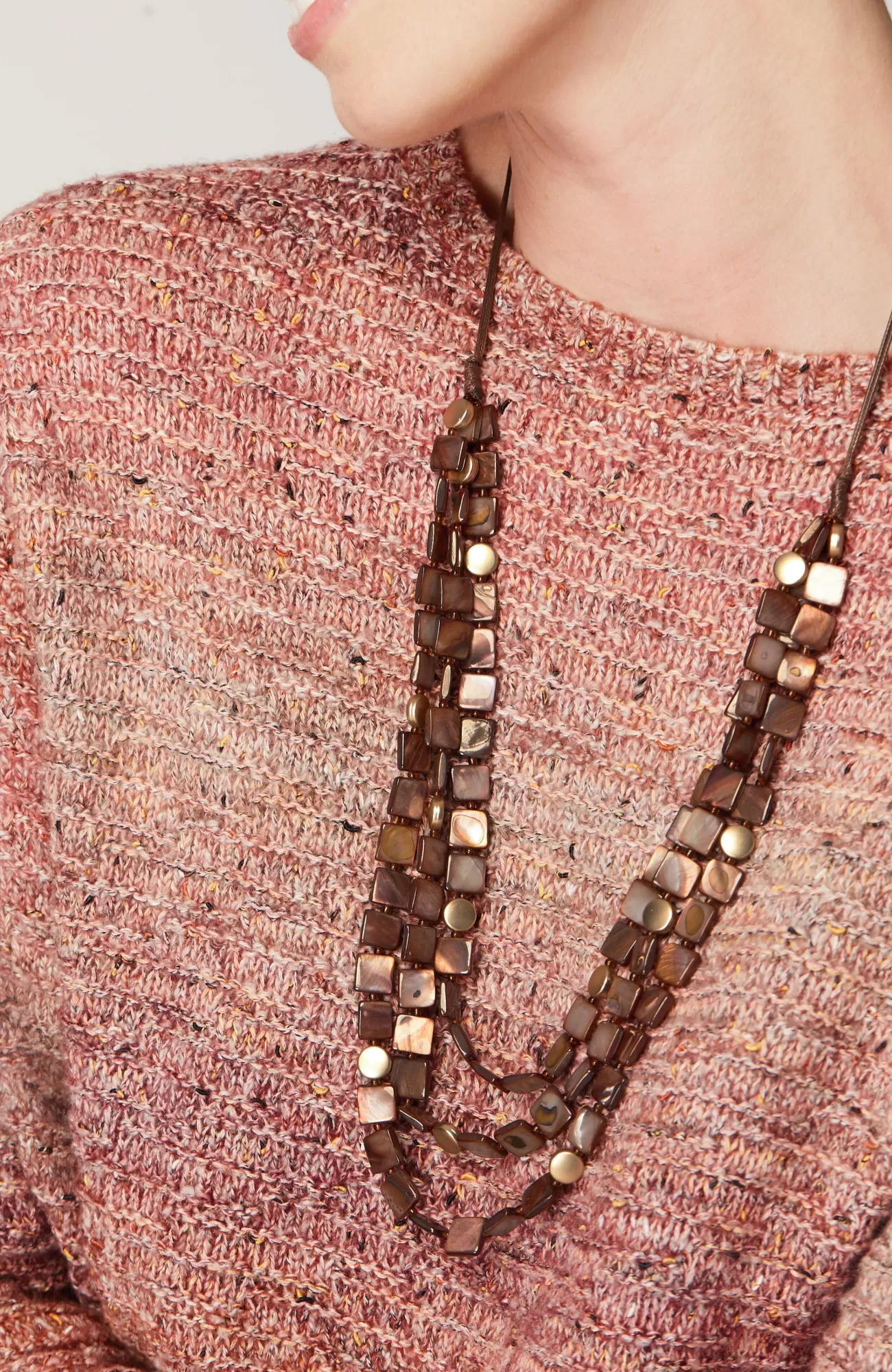 A necklace for all seasons: three strands of geometric beads in neutral shades of brown. It's the perfect coordinate to our dare-to-explore bracelet. Adjusts from 20½" to 39½".