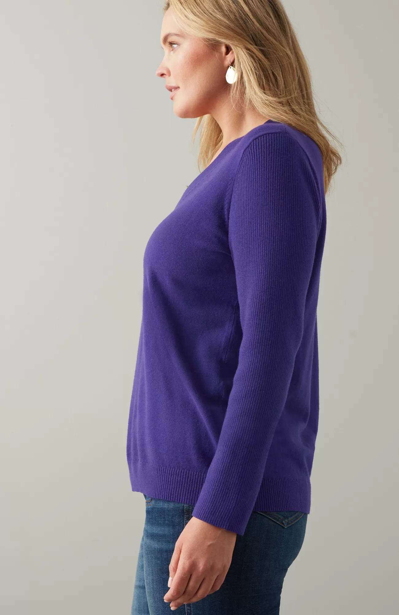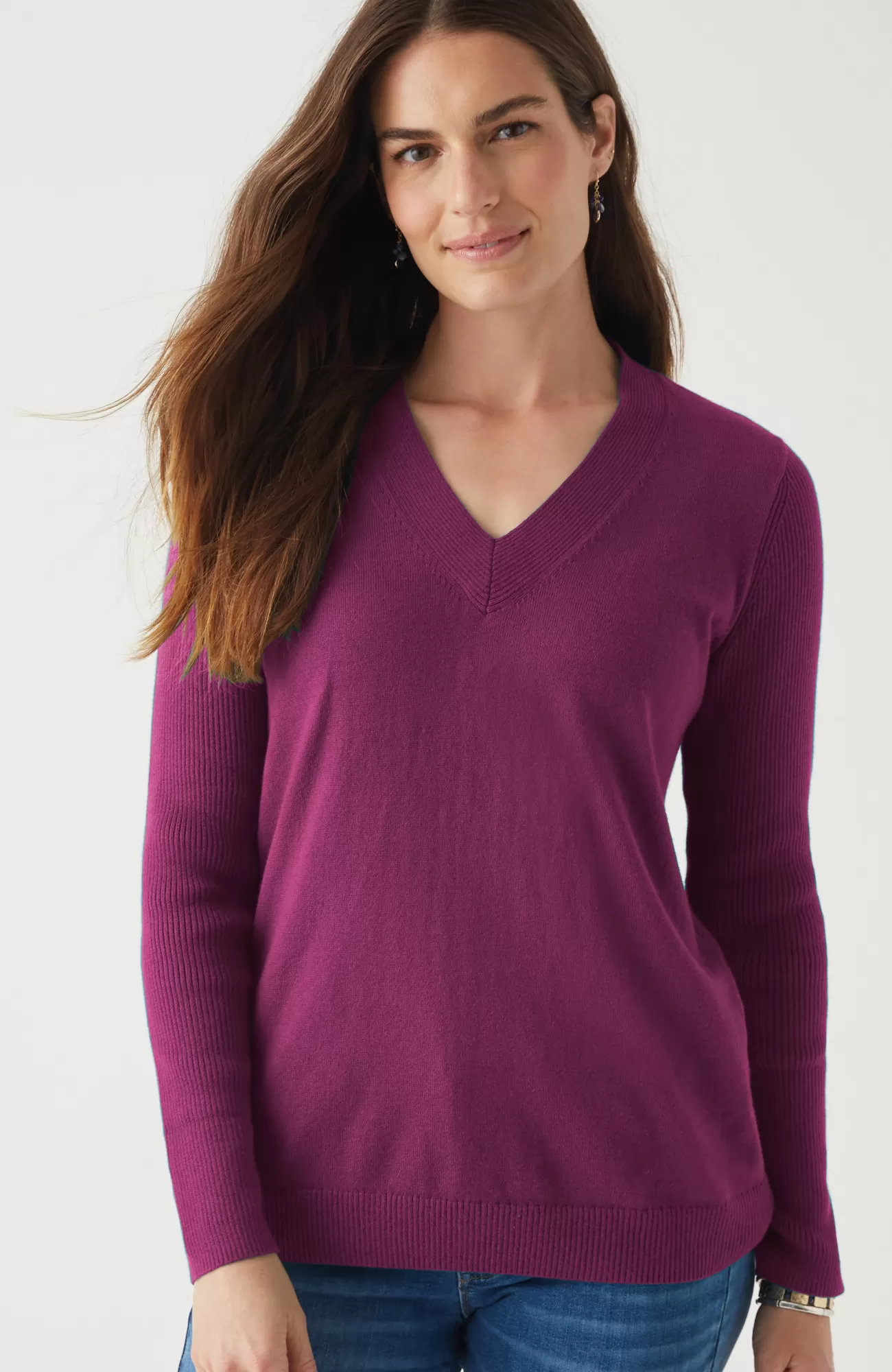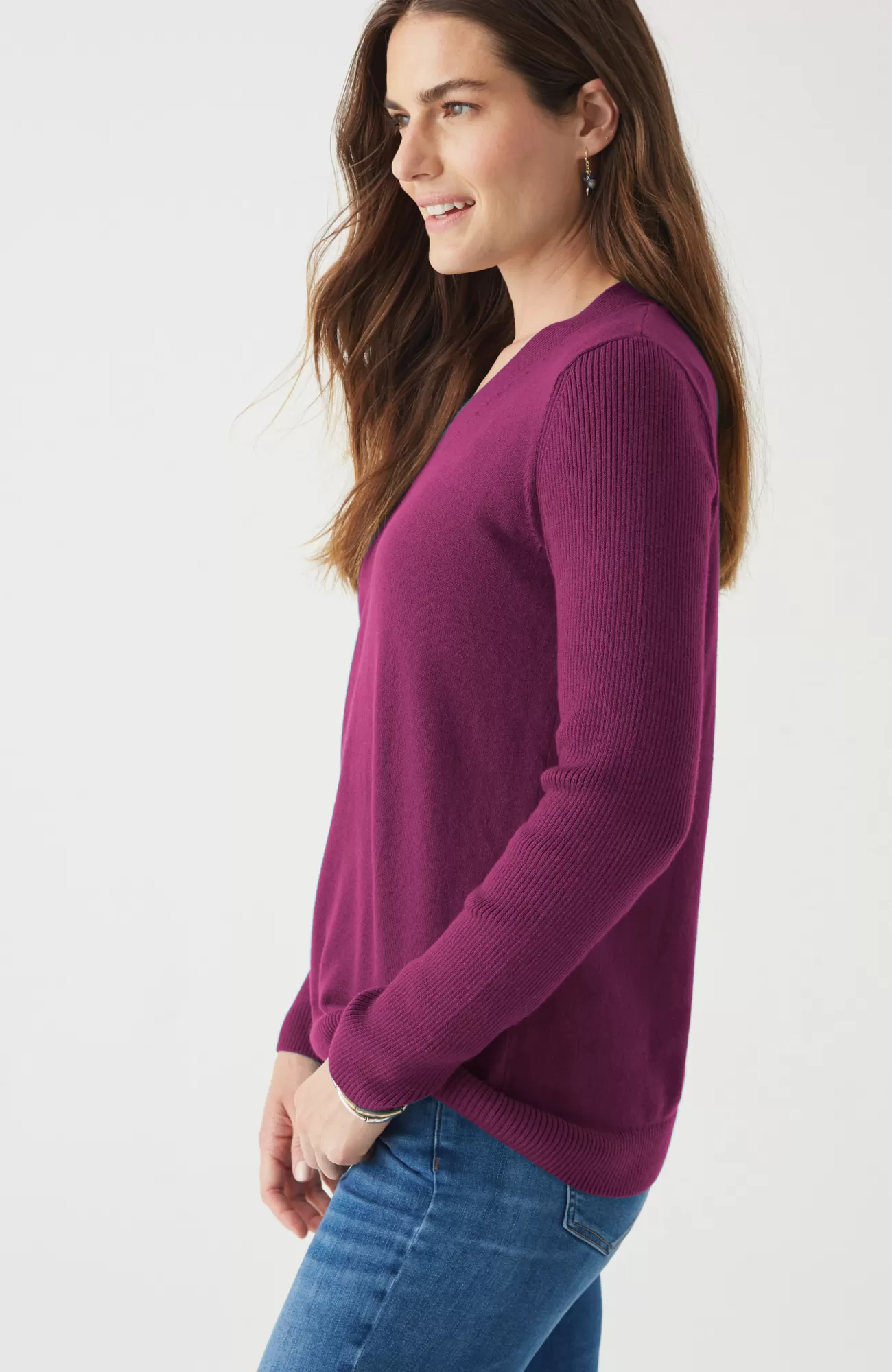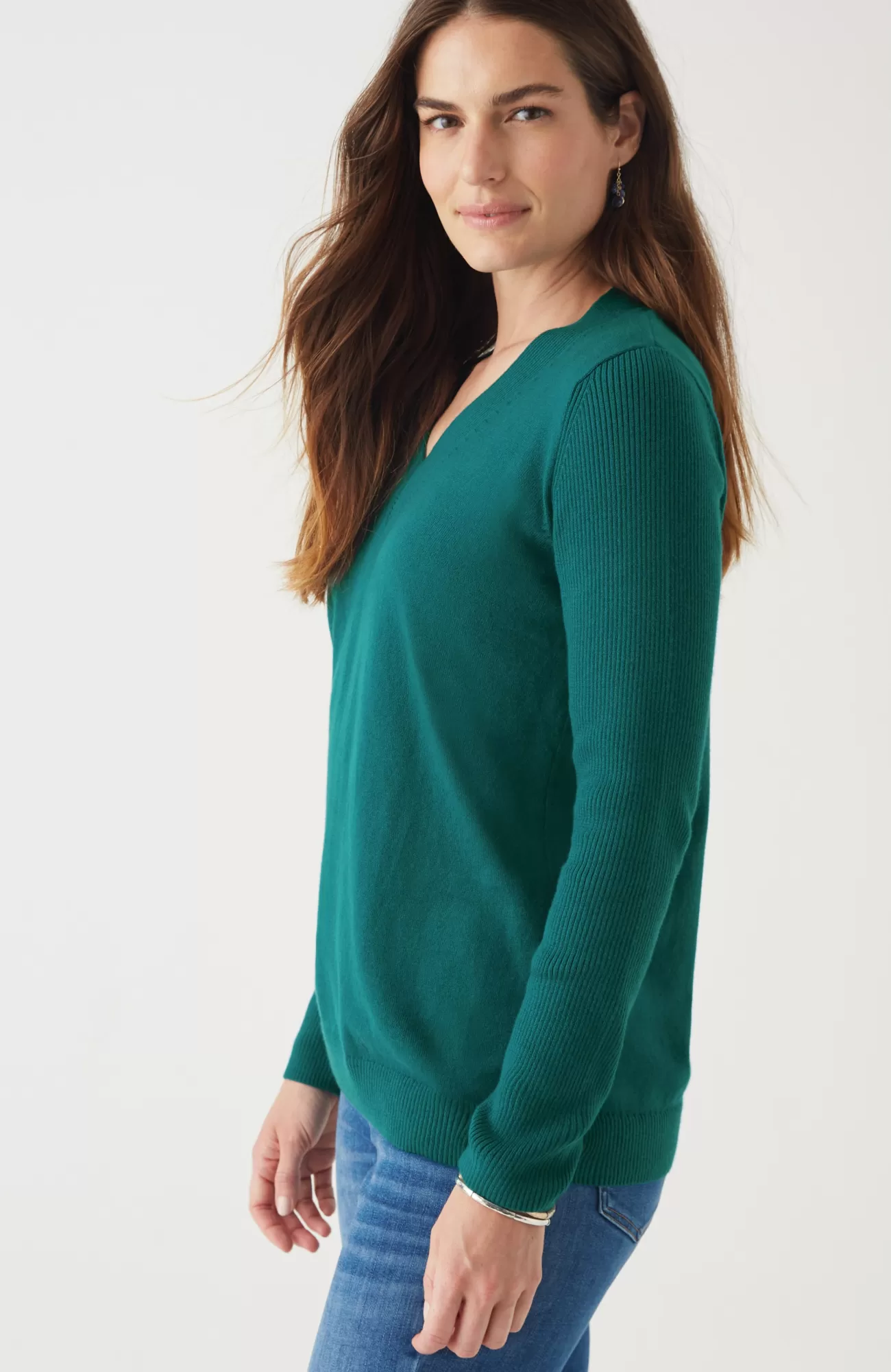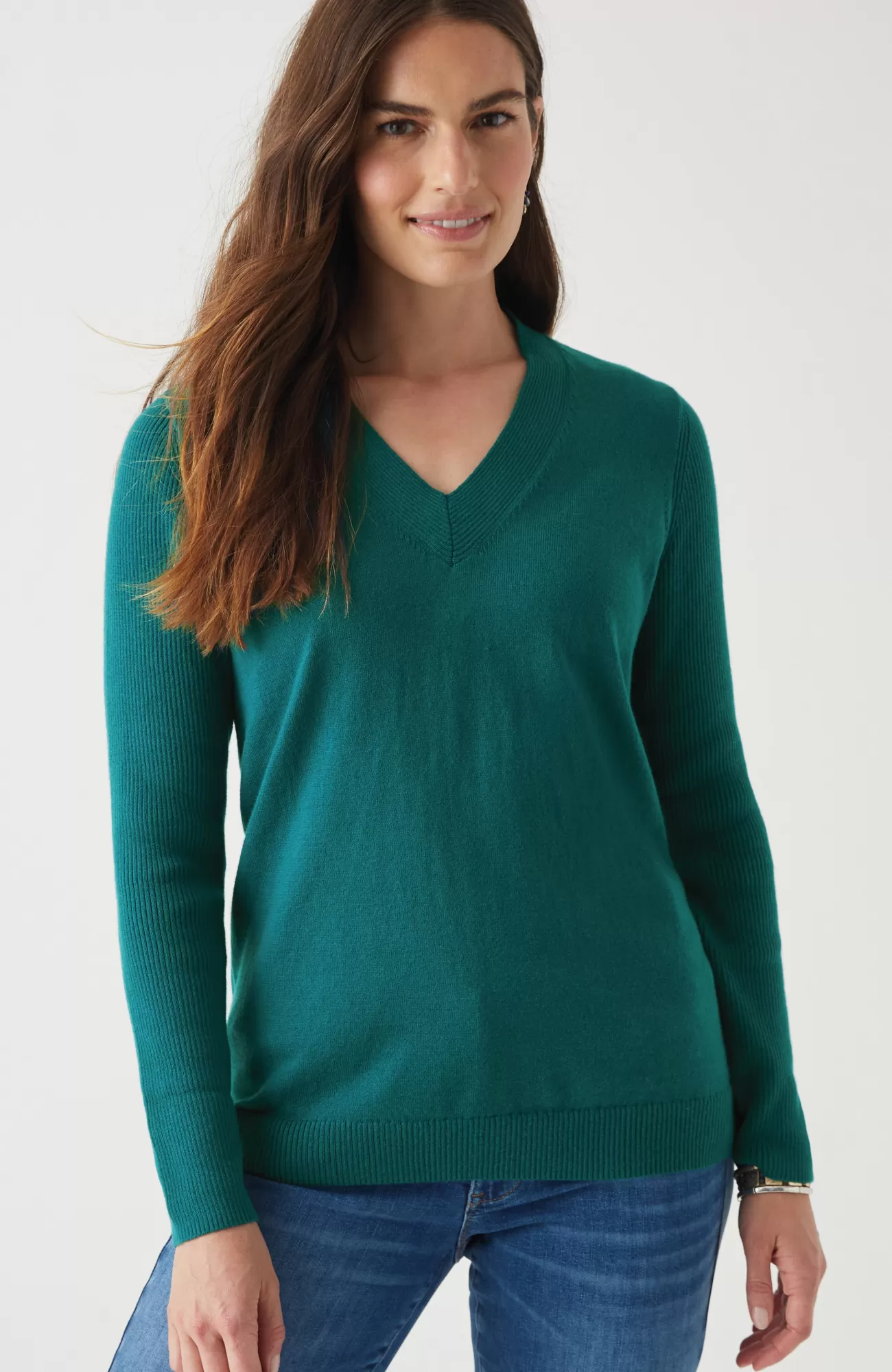 Just in time for sweater season—our V-neck pullover is soft, versatile and light enough to layer. Cozy ribbed texture at the neckline, hem and long sleeves.