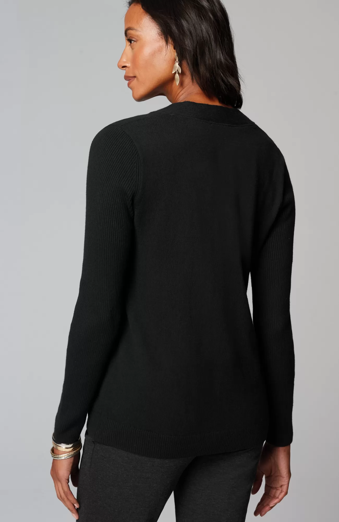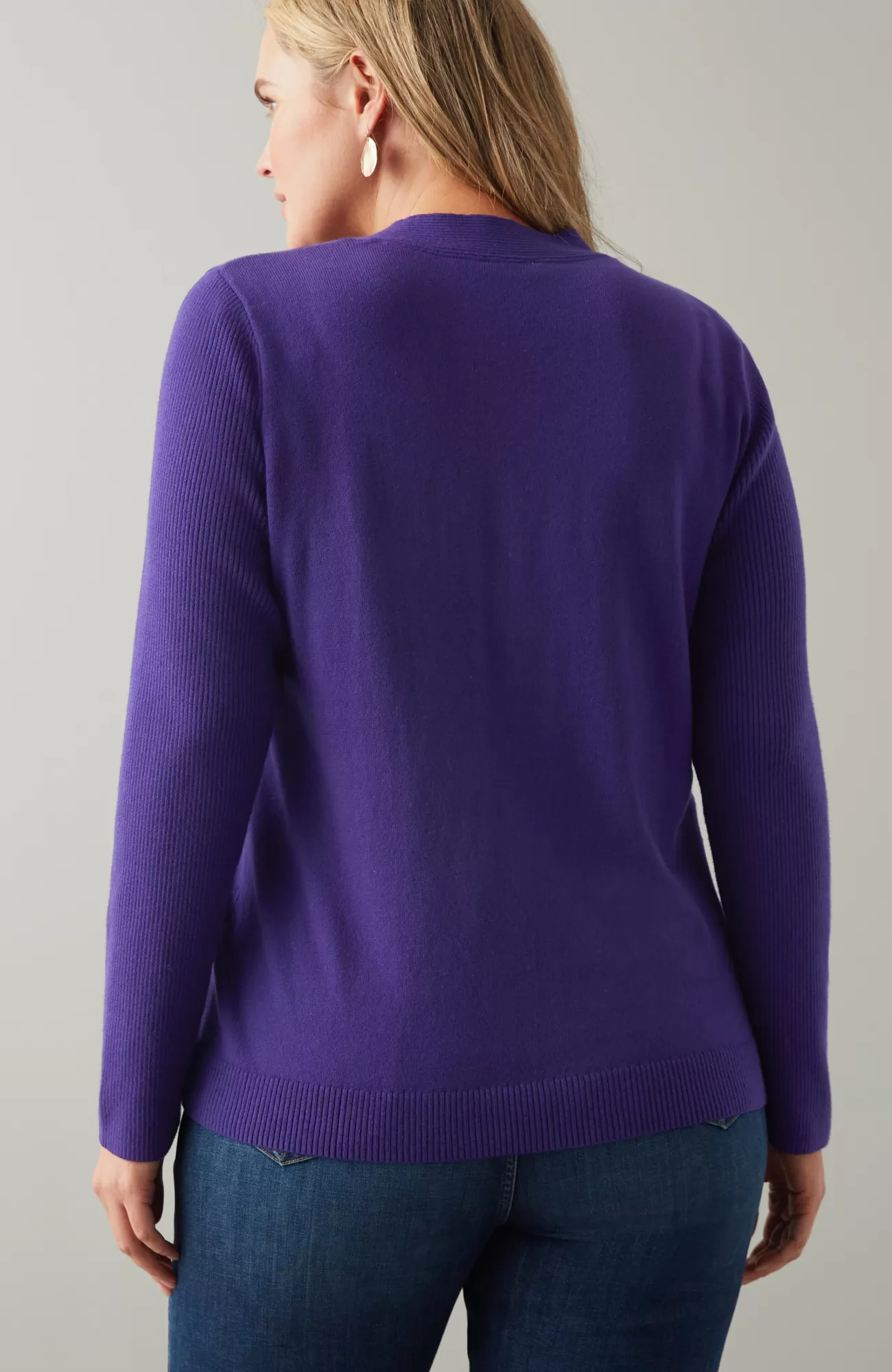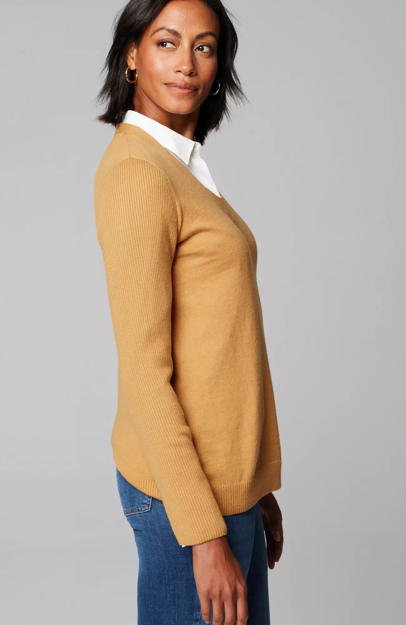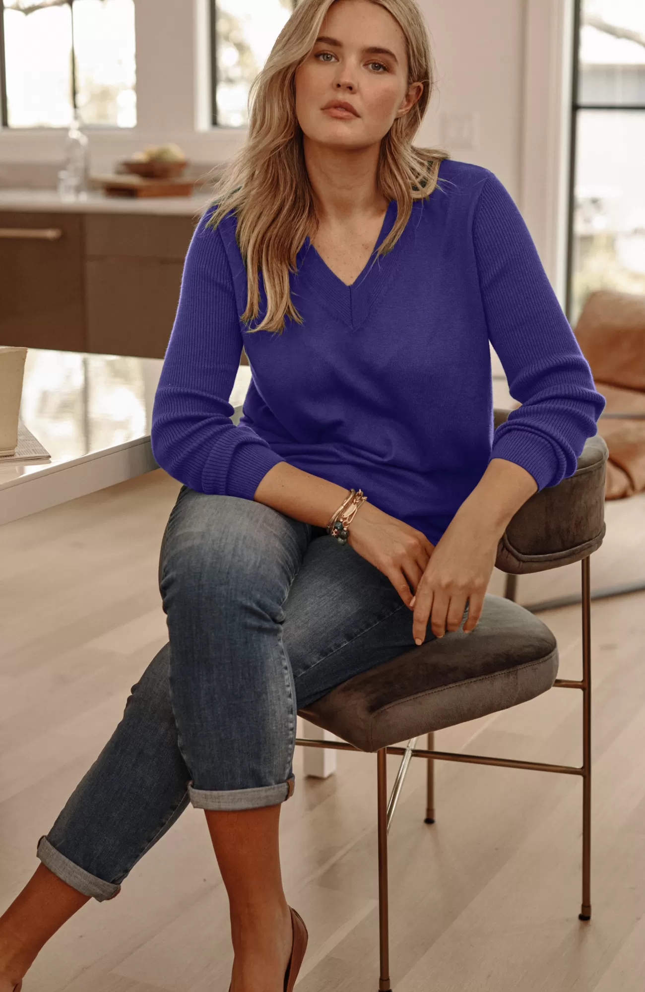 Just in time for sweater season—our V-neck pullover is soft, versatile and light enough to layer. Cozy ribbed texture at the neckline, hem and long sleeves.