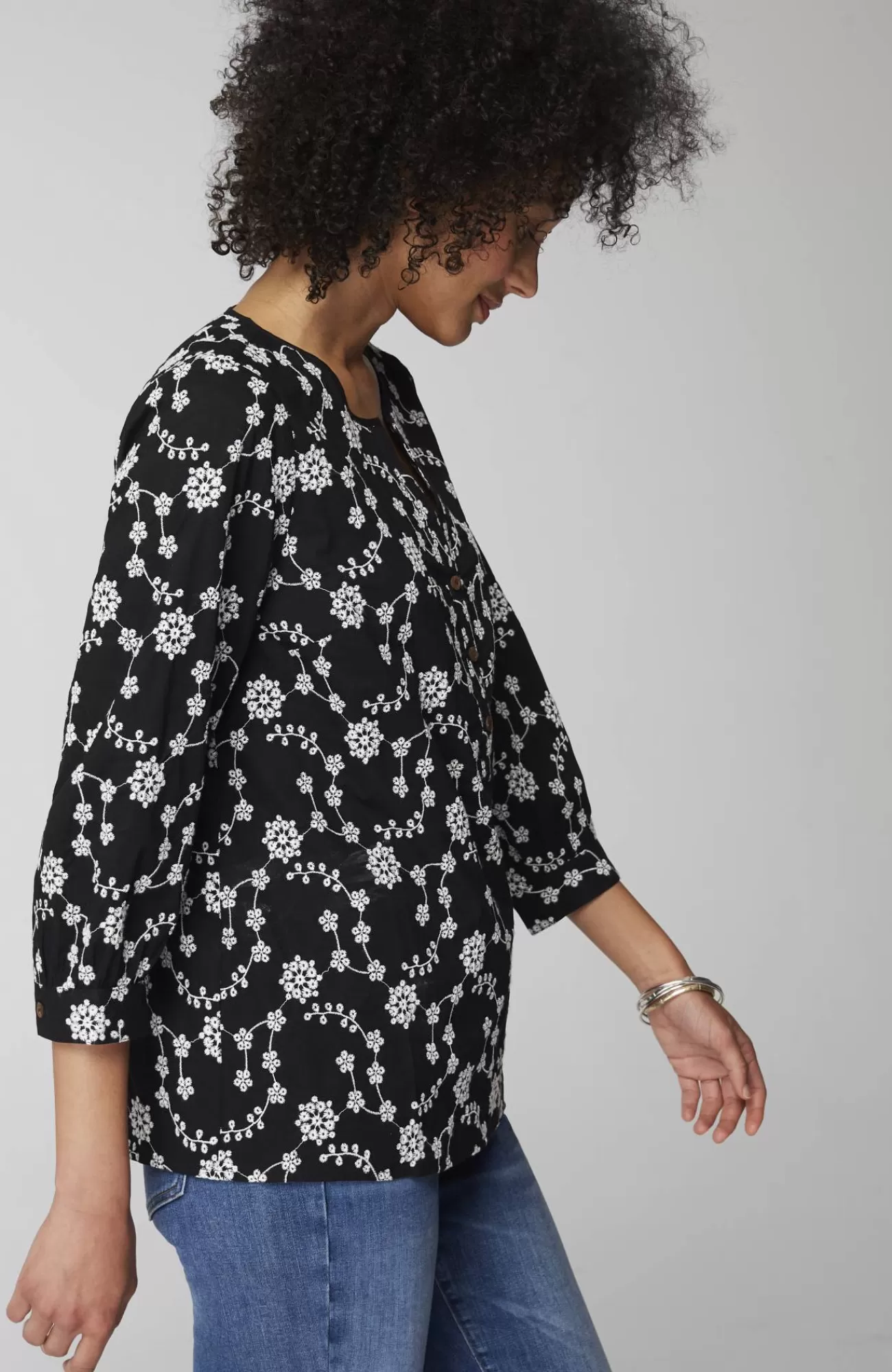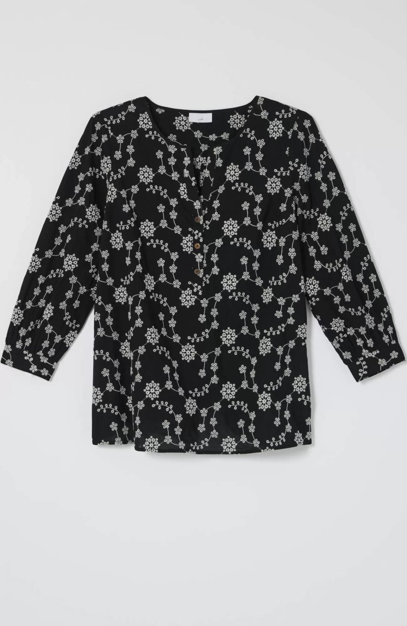 Floral eyelet embroidery elevates this everyday top. Designed with coconut buttons at the front neckline and shirred cuffs. Shirring at the back yoke.