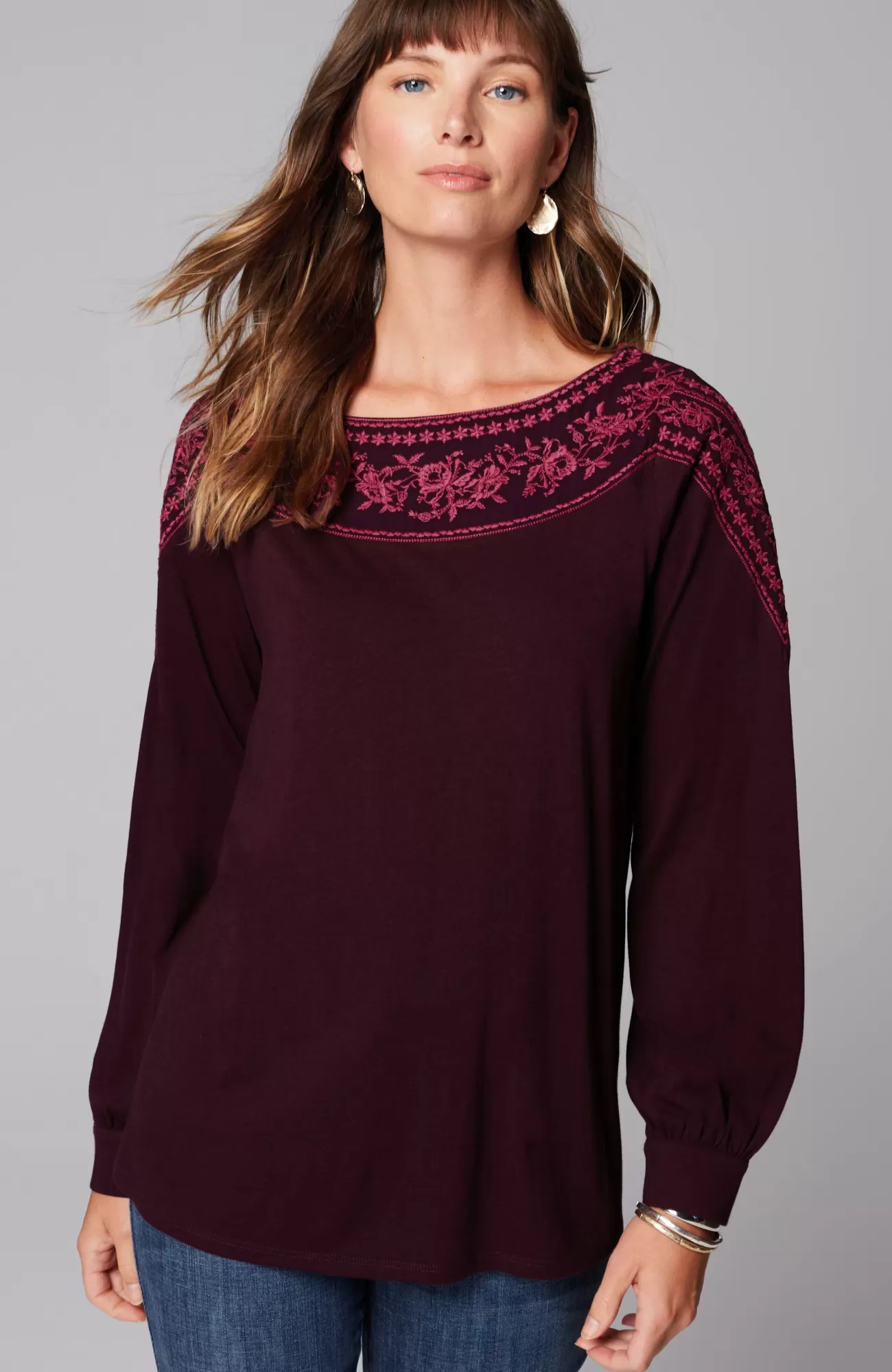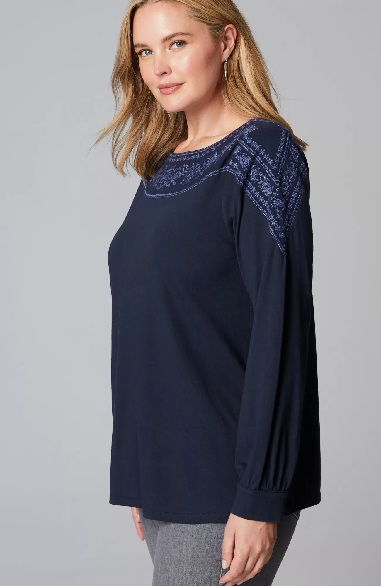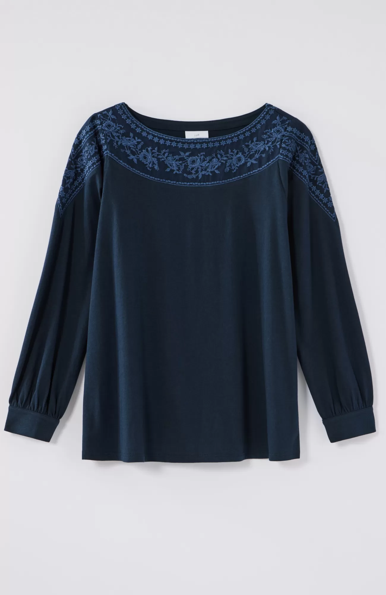 The everyday top, elevated with special details to discover. It's designed with a woven cotton-voile yoke that features intricate floral embroidery along the boat neckline and shoulders. The knit body is made of a soft blend of cotton and TENCEL™ Modal for feel-good style and all-day comfort.