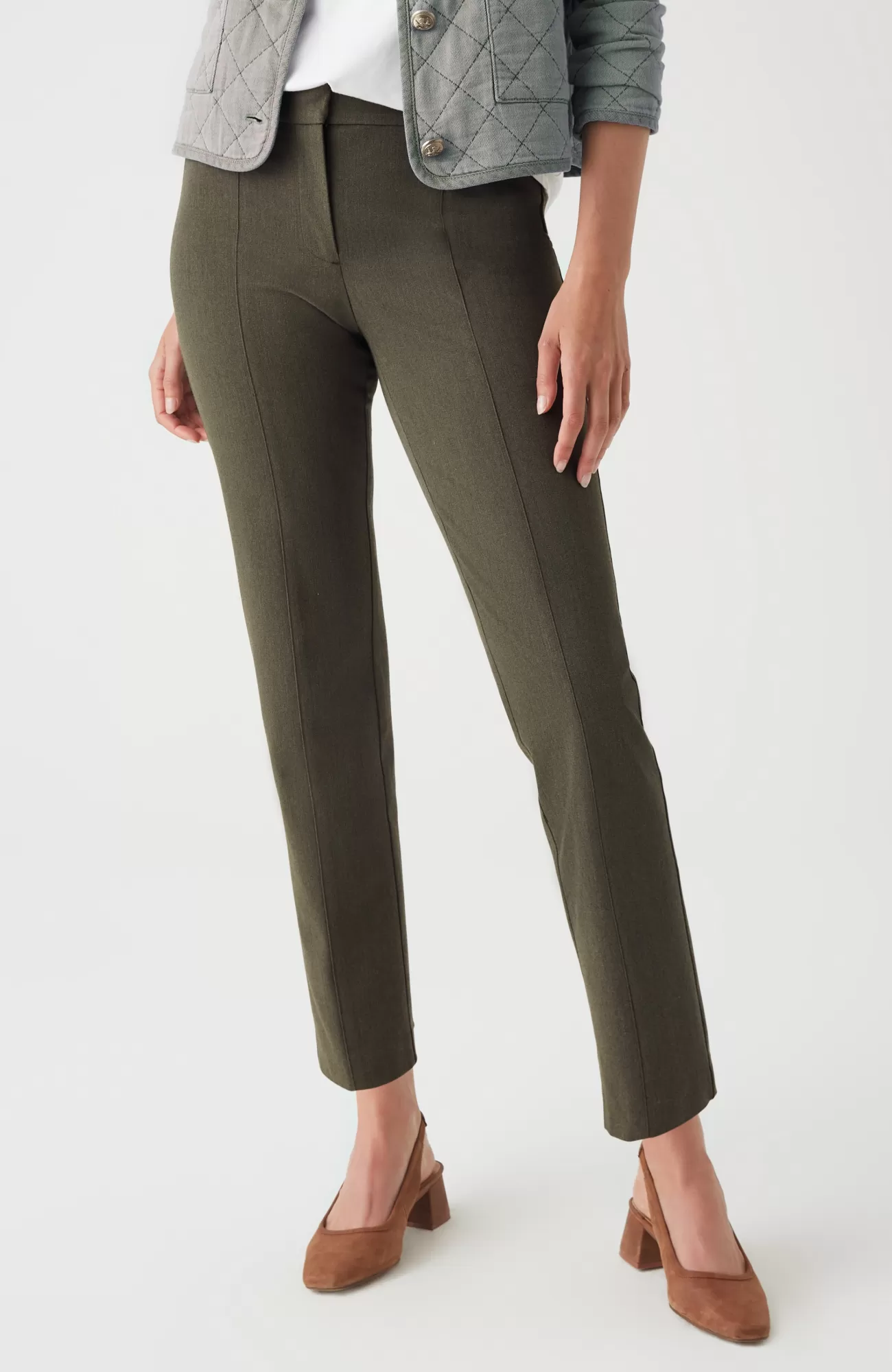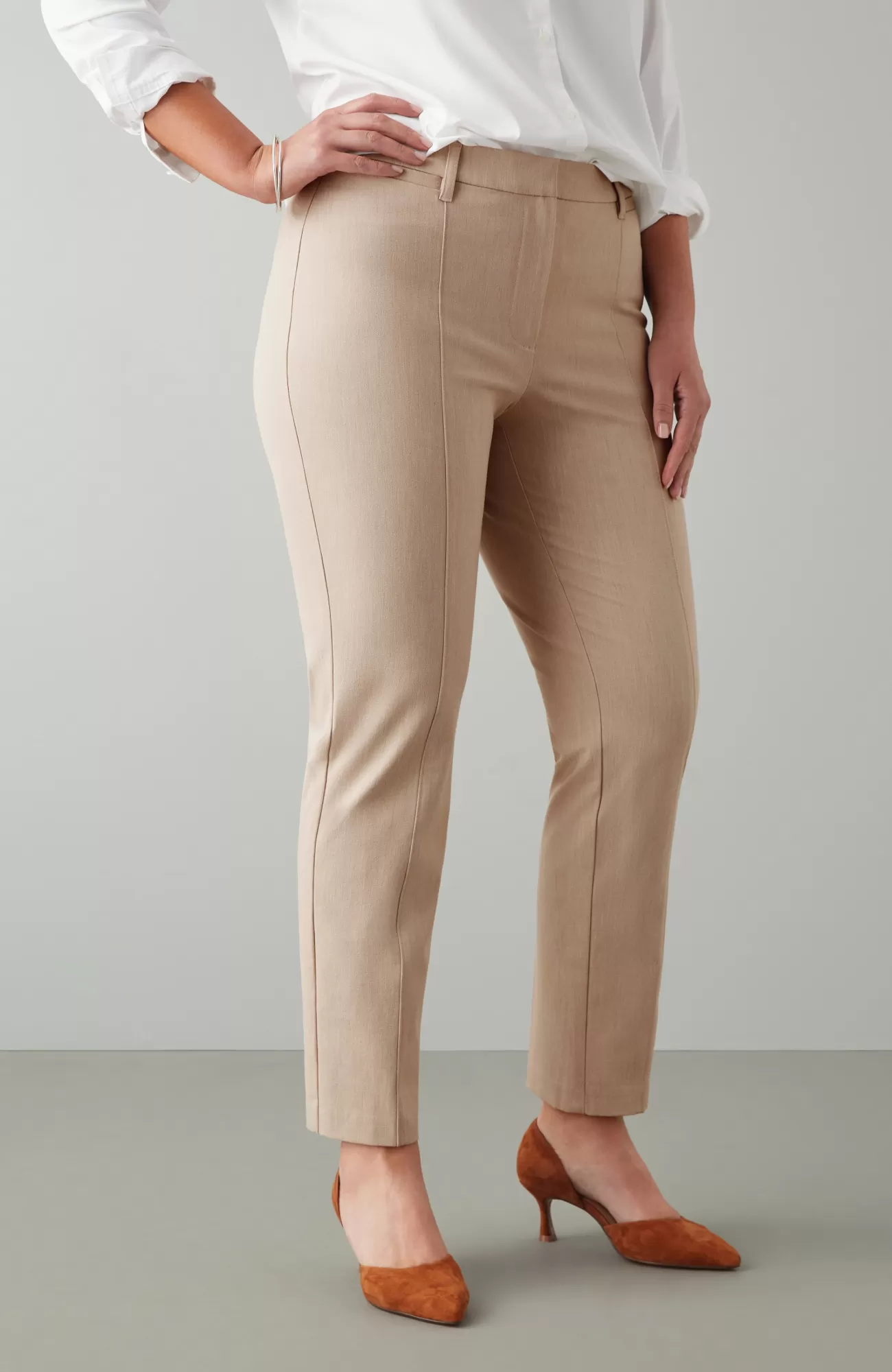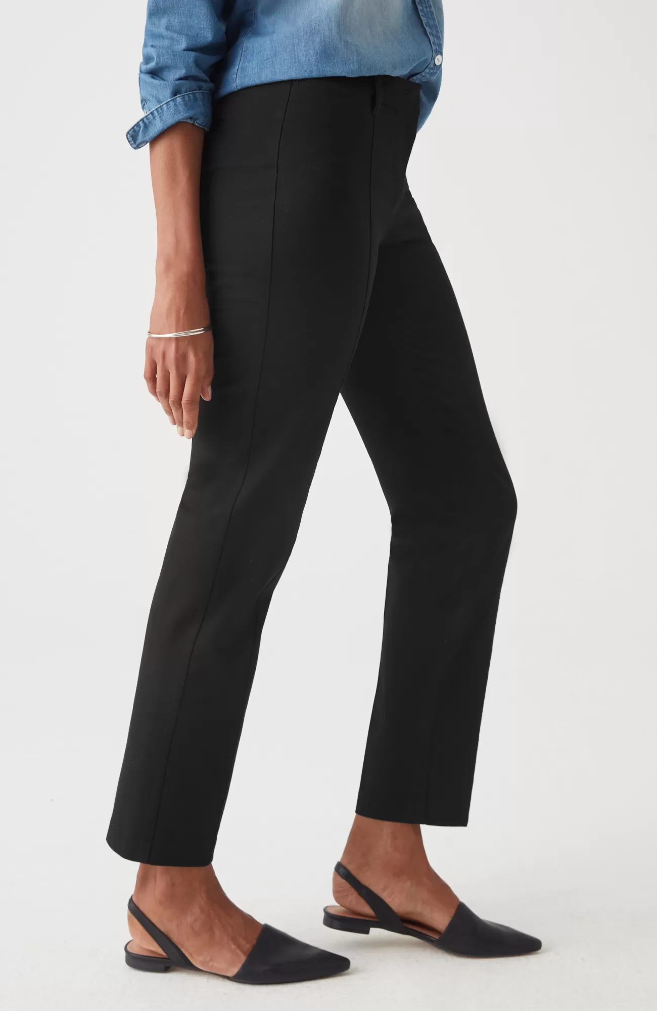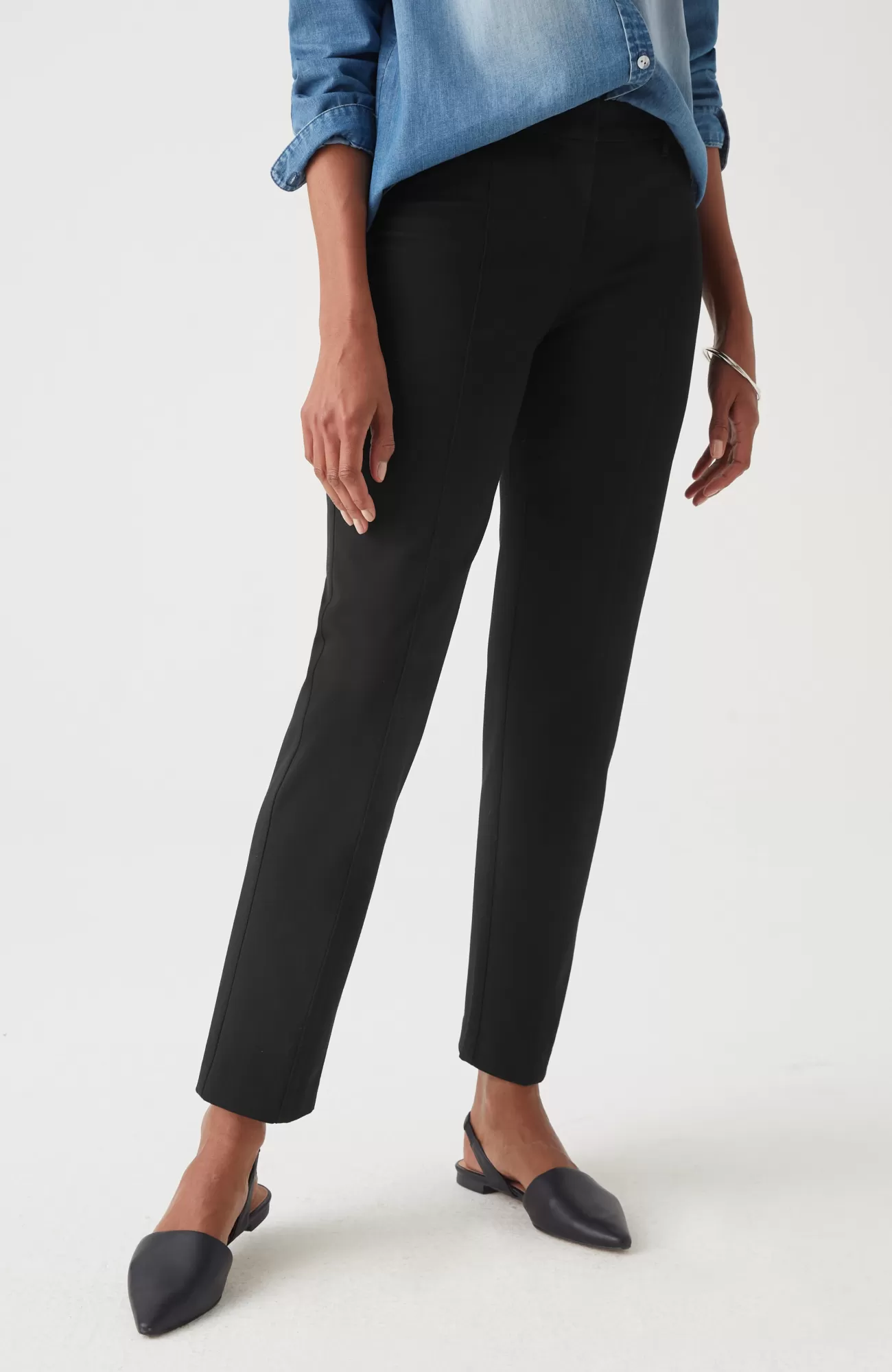 We designed our versatile slim-leg pants in our unique bi-stretch fabric, so they move every way you do and hold their shape to give you a perfectly comfortable fit that looks and feels good all day. Pressed front pintucks give them a polished look. Flat constructed front with elasticized back waist. Front and back welt pockets.