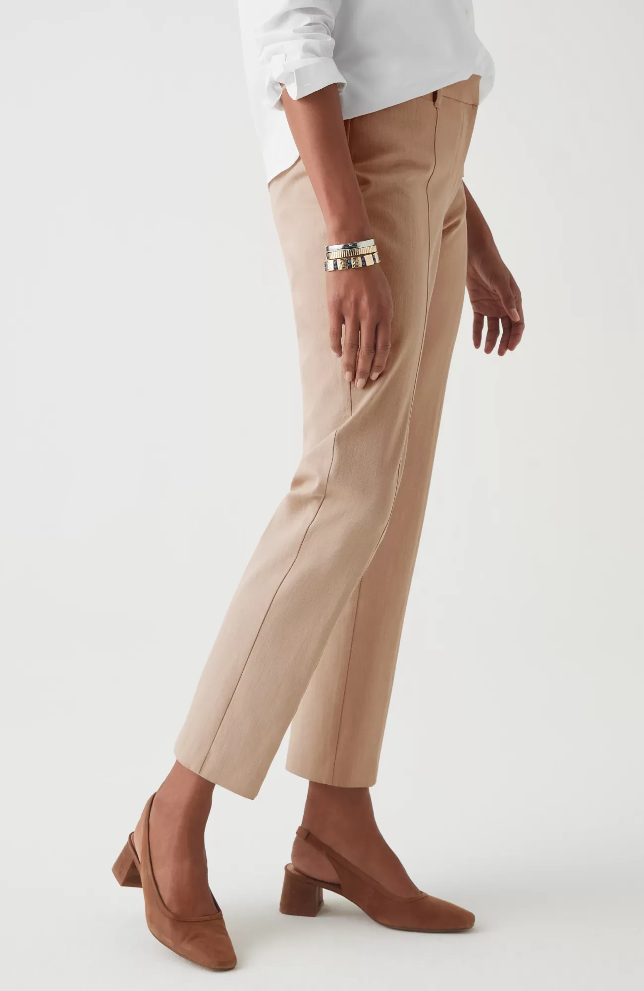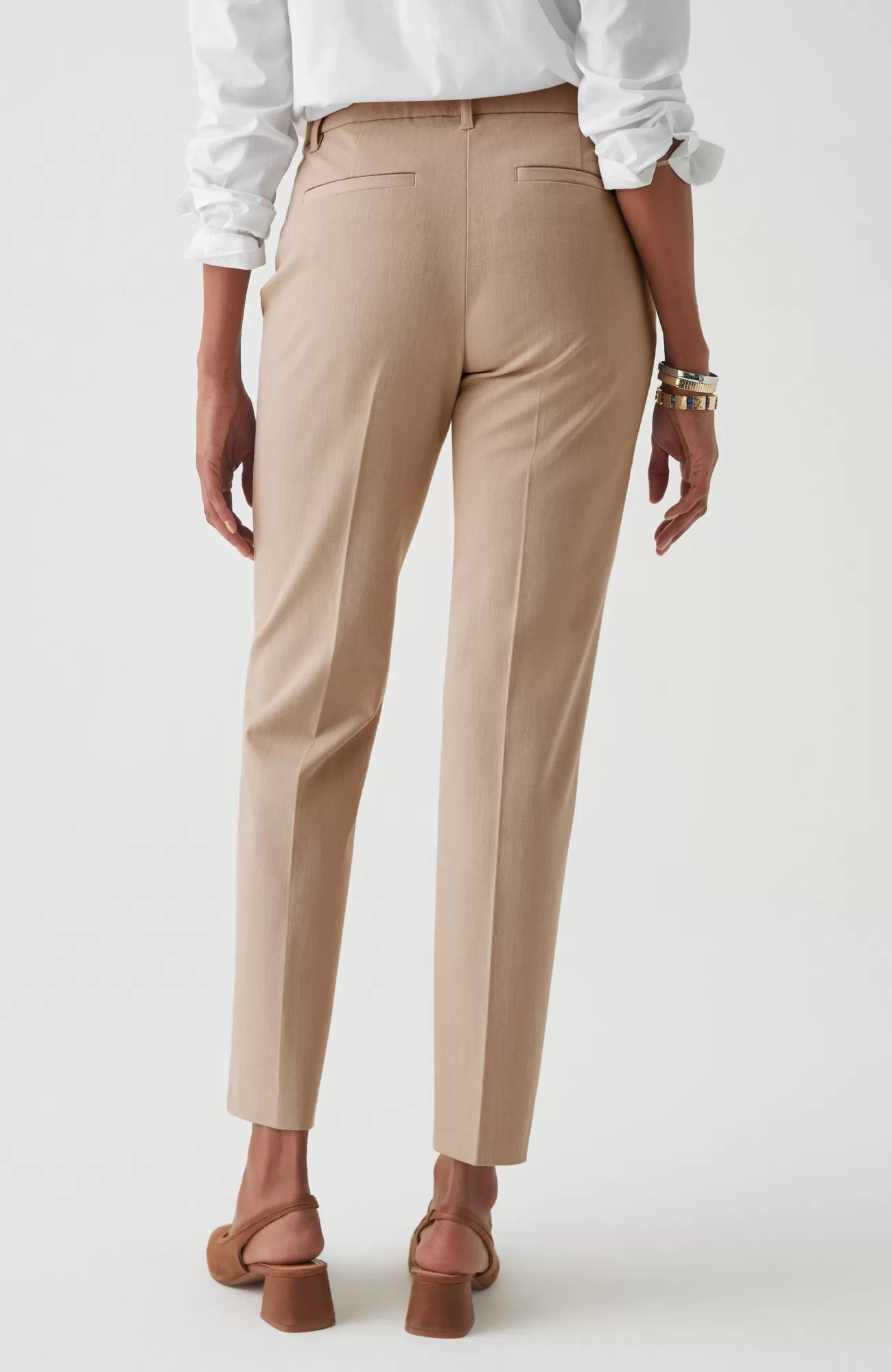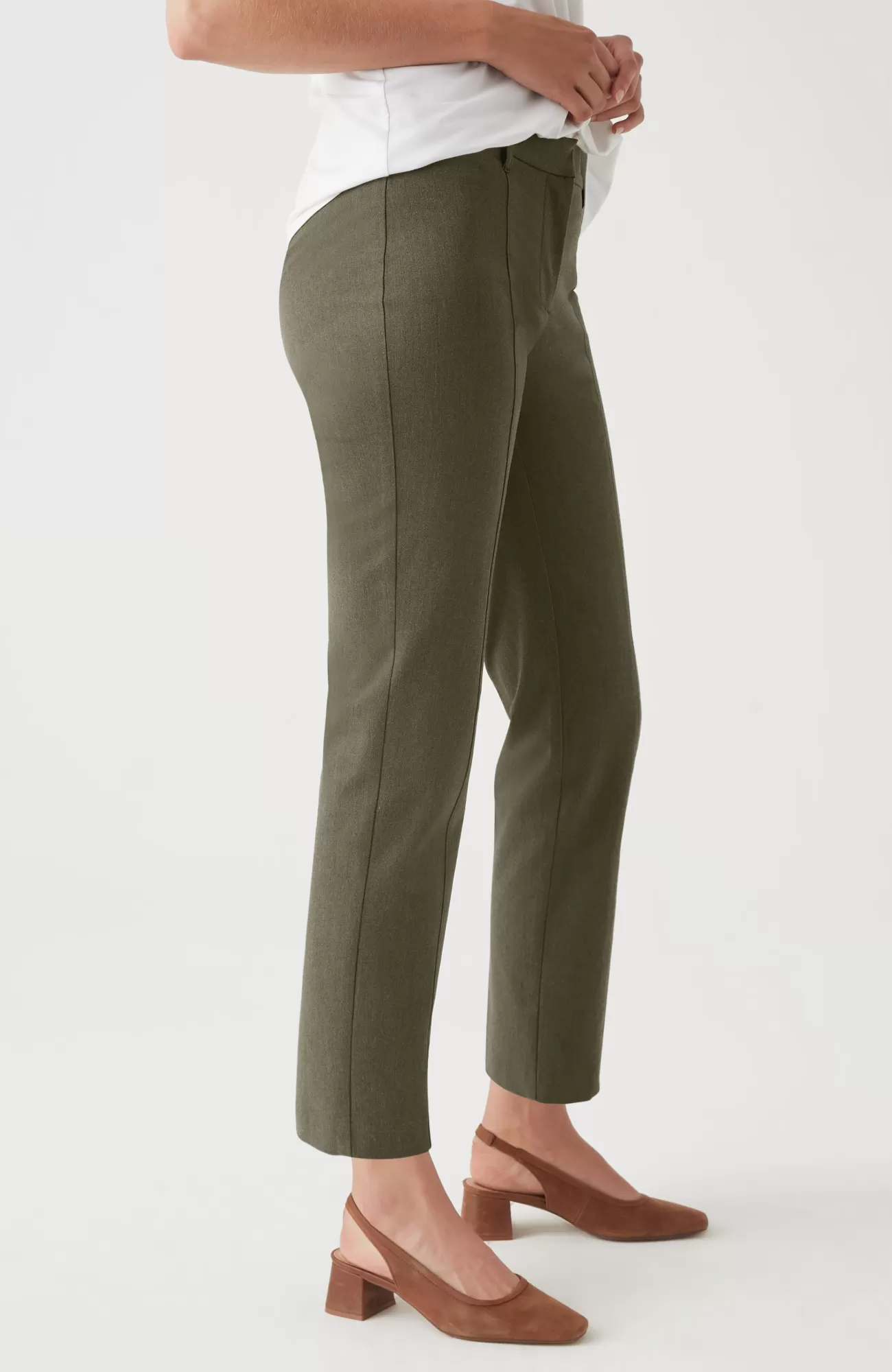 We designed our versatile slim-leg pants in our unique bi-stretch fabric, so they move every way you do and hold their shape to give you a perfectly comfortable fit that looks and feels good all day. Pressed front pintucks give them a polished look. Flat constructed front with elasticized back waist. Front and back welt pockets.