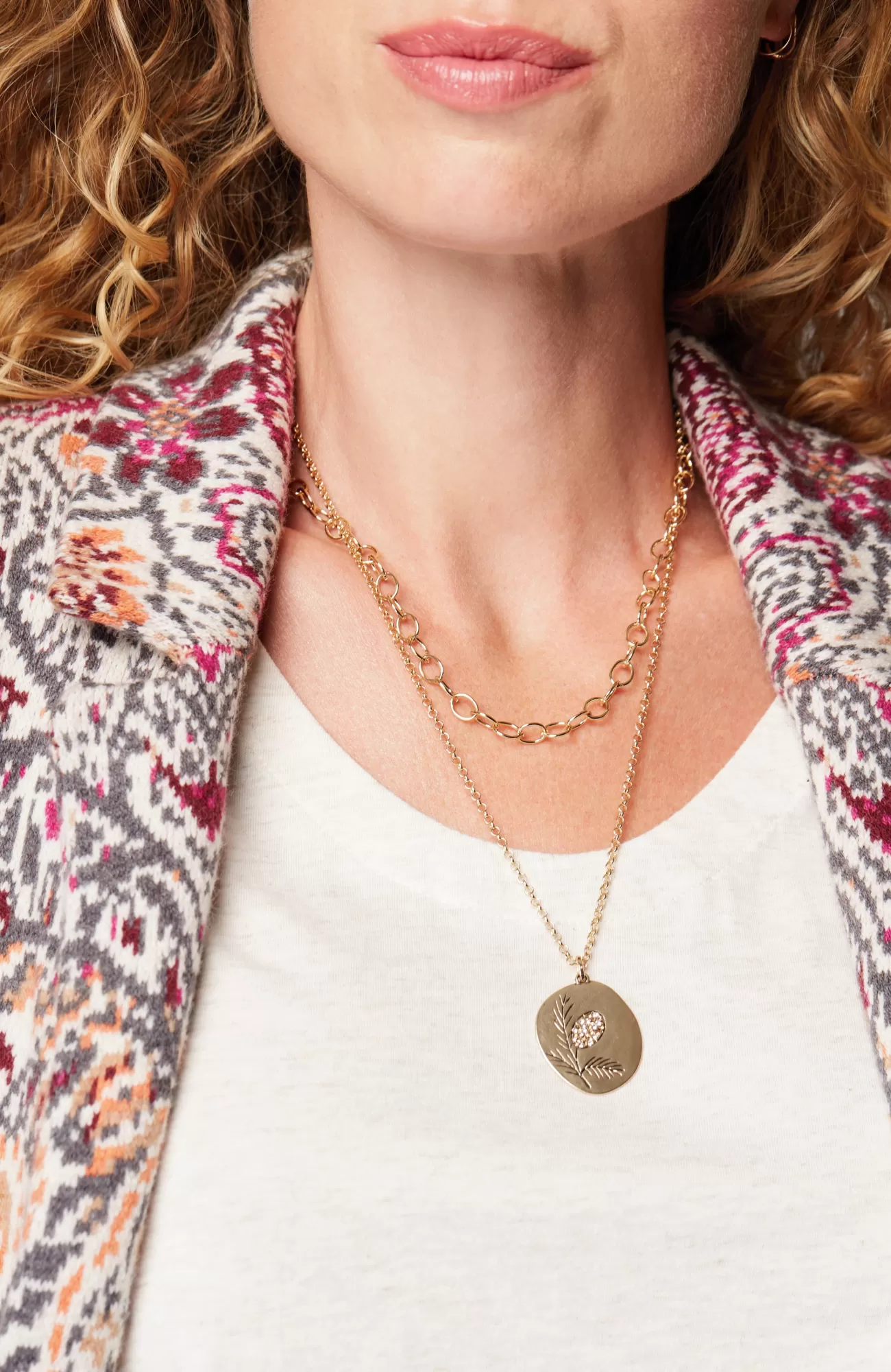 A versatile layered necklace that feels like fall. Features two types of chain and a pendant etched with an artful take …