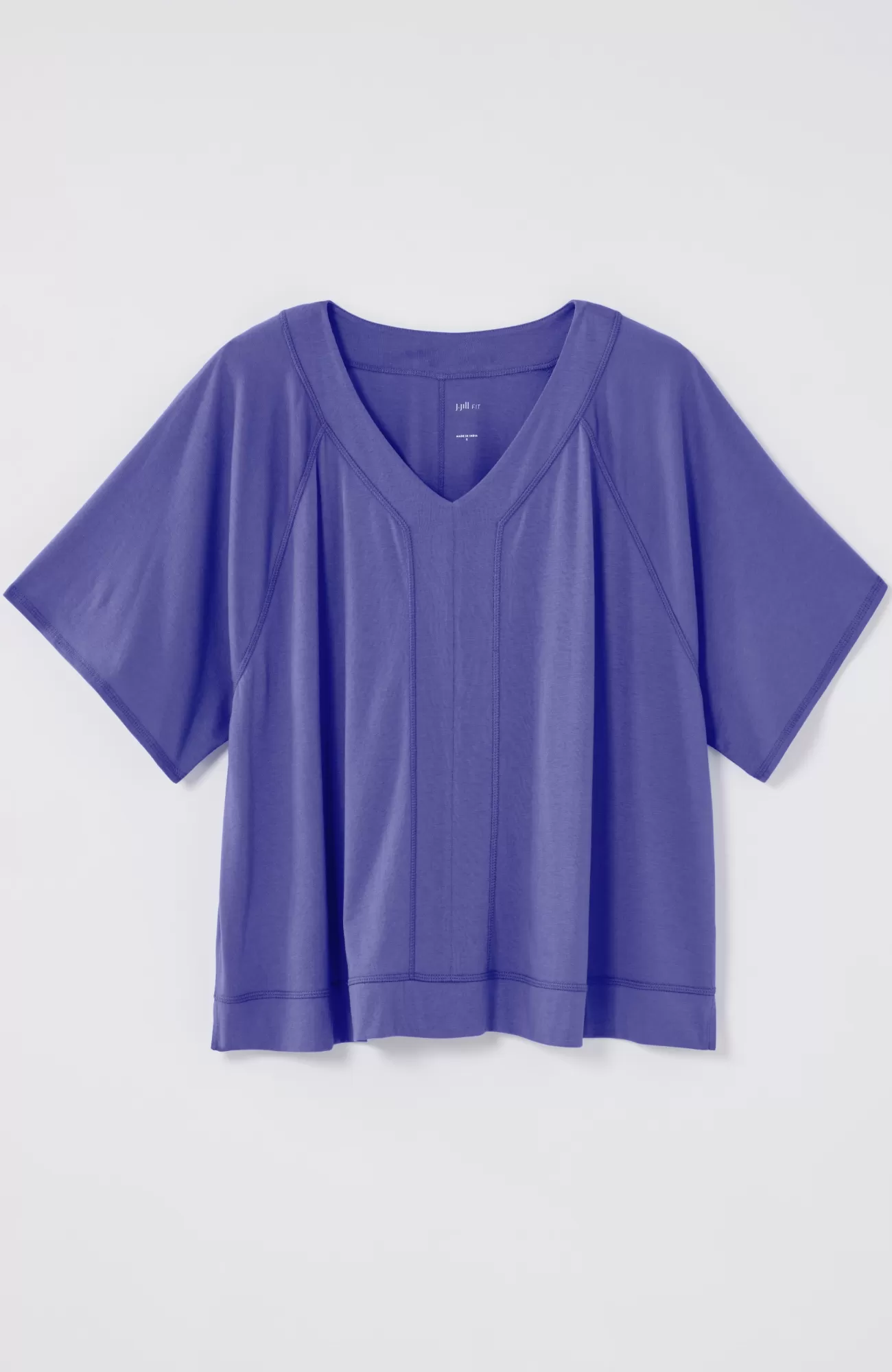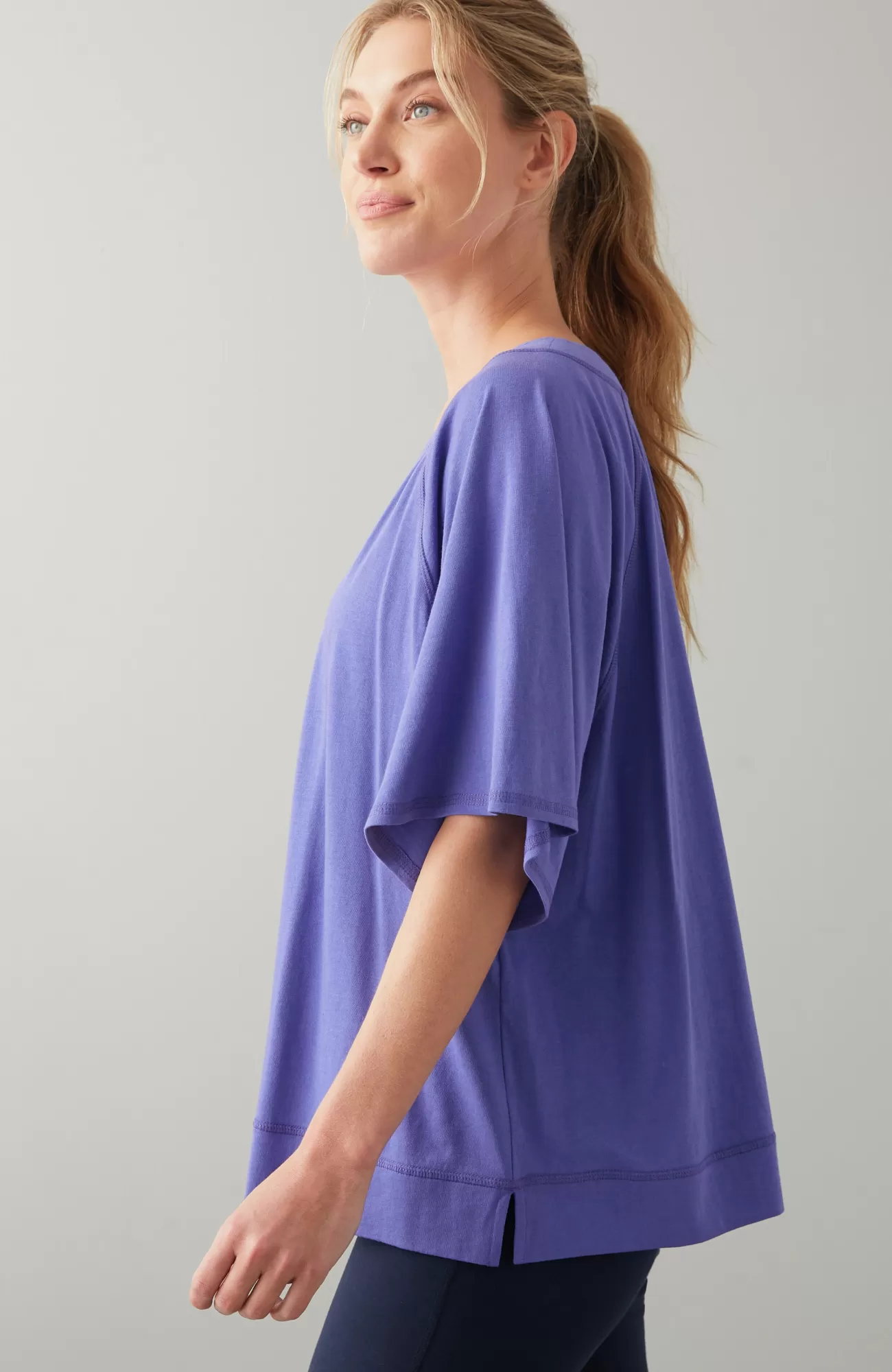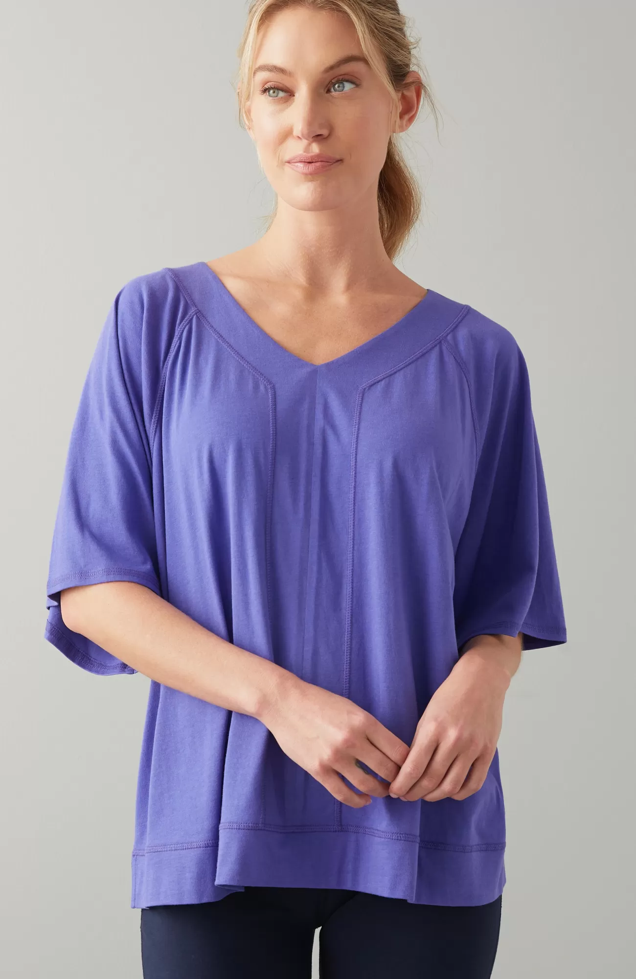 A fresh take on the everyday tee with an oversized fit and seamed accents. It's an ultrasoft, comfortable and easy option for your on-the-go days. Raglan sleeves. Side vents.