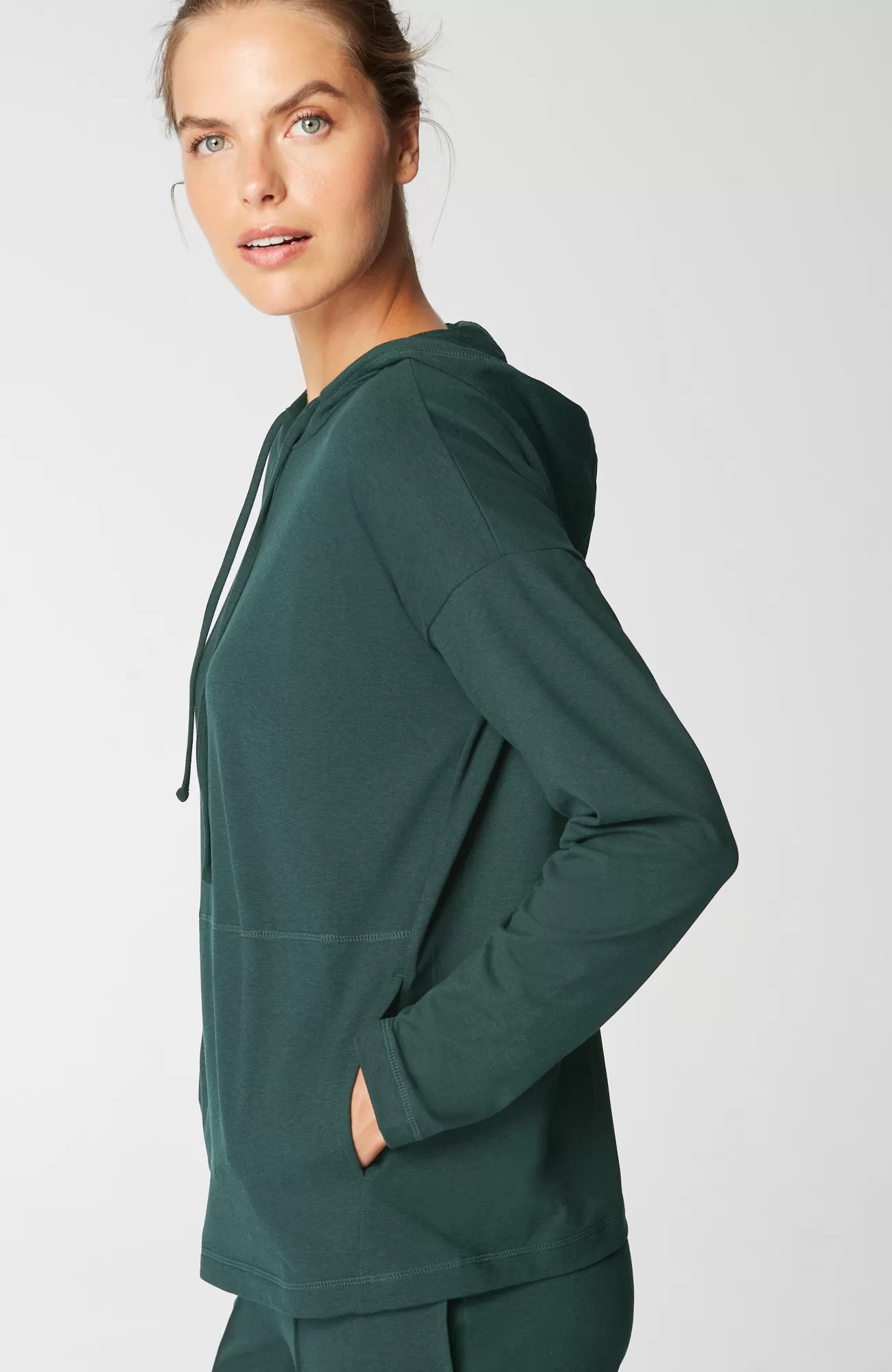 Our pullover is made to move with you—and your lifestyle. Created in our ultrasoft brushed fabric, it’s moisture wicking and infused with spandex, making it the most comfortable thing in your closet. Drawcords allow you to secure the hood. Kangaroo pocket.