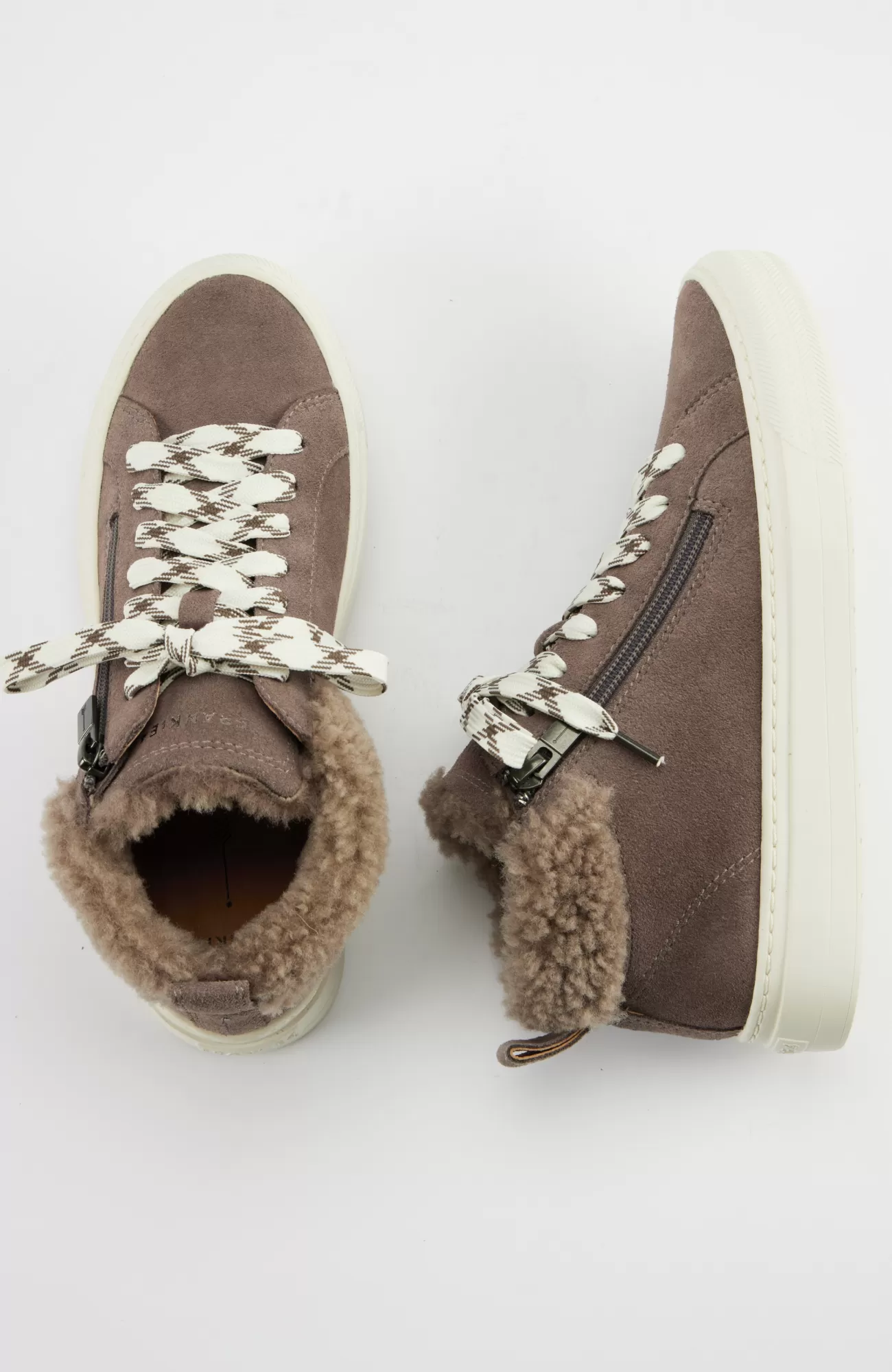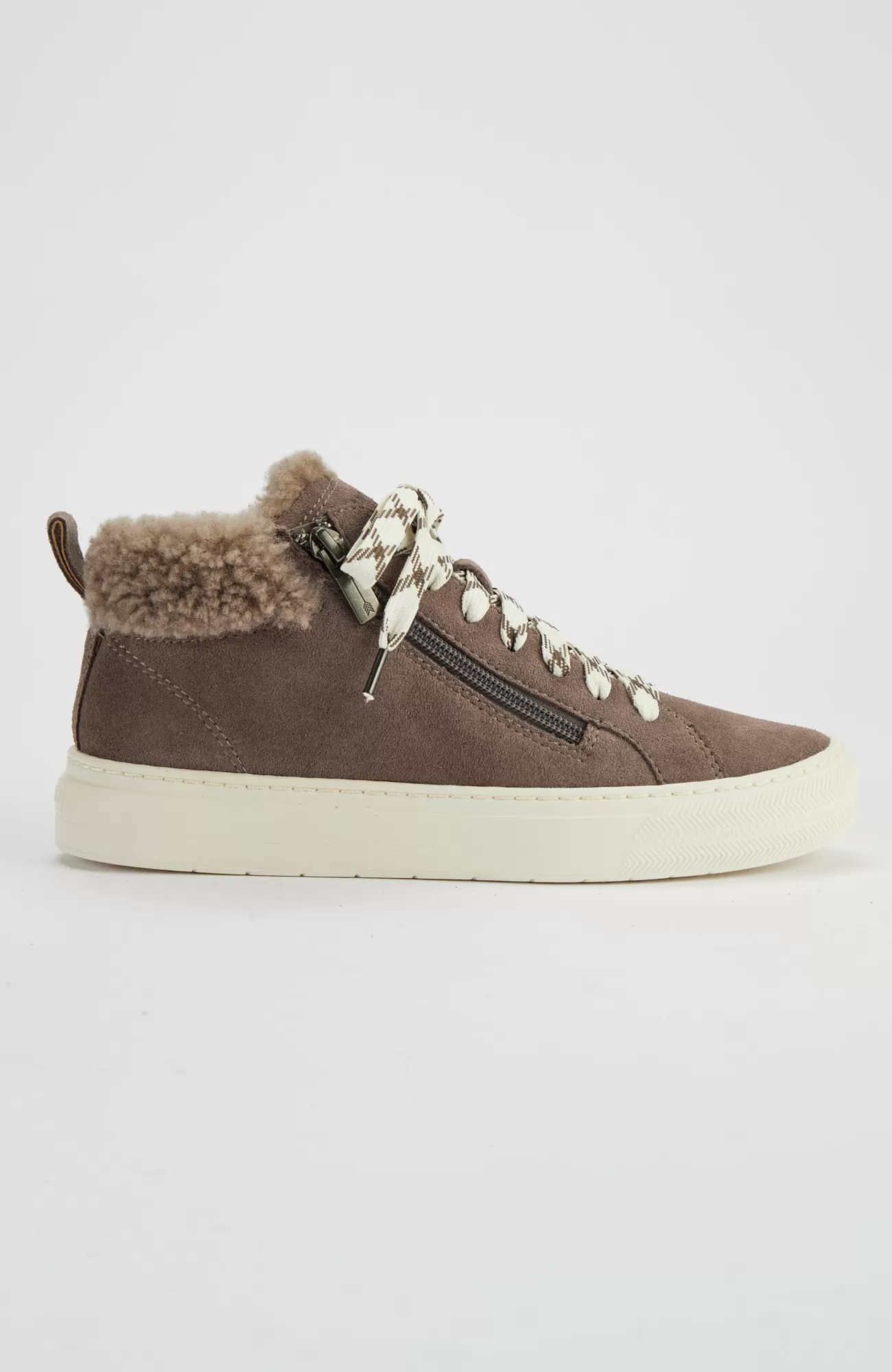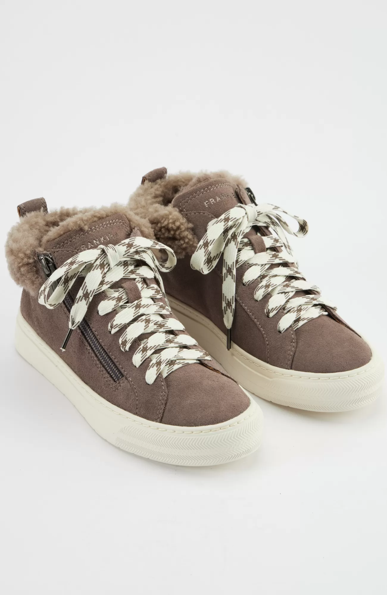 These everyday lace-up sneakers have on-trend appeal, thanks to a luxe shearling trim. The side zip and pull tab make these easy to slip on and off, but what we love most is the podiatrist-designed triple-layered cushion and support system built to keep arches happy and improve lower-limb alignment. Comes with FRANKIE4’s customizable Sole Saver Pack™ with components that can be adjusted for a standard, narrow or wide fit. Dark taupe suede treated to be waterproof. Catalog & Online Exclusive.