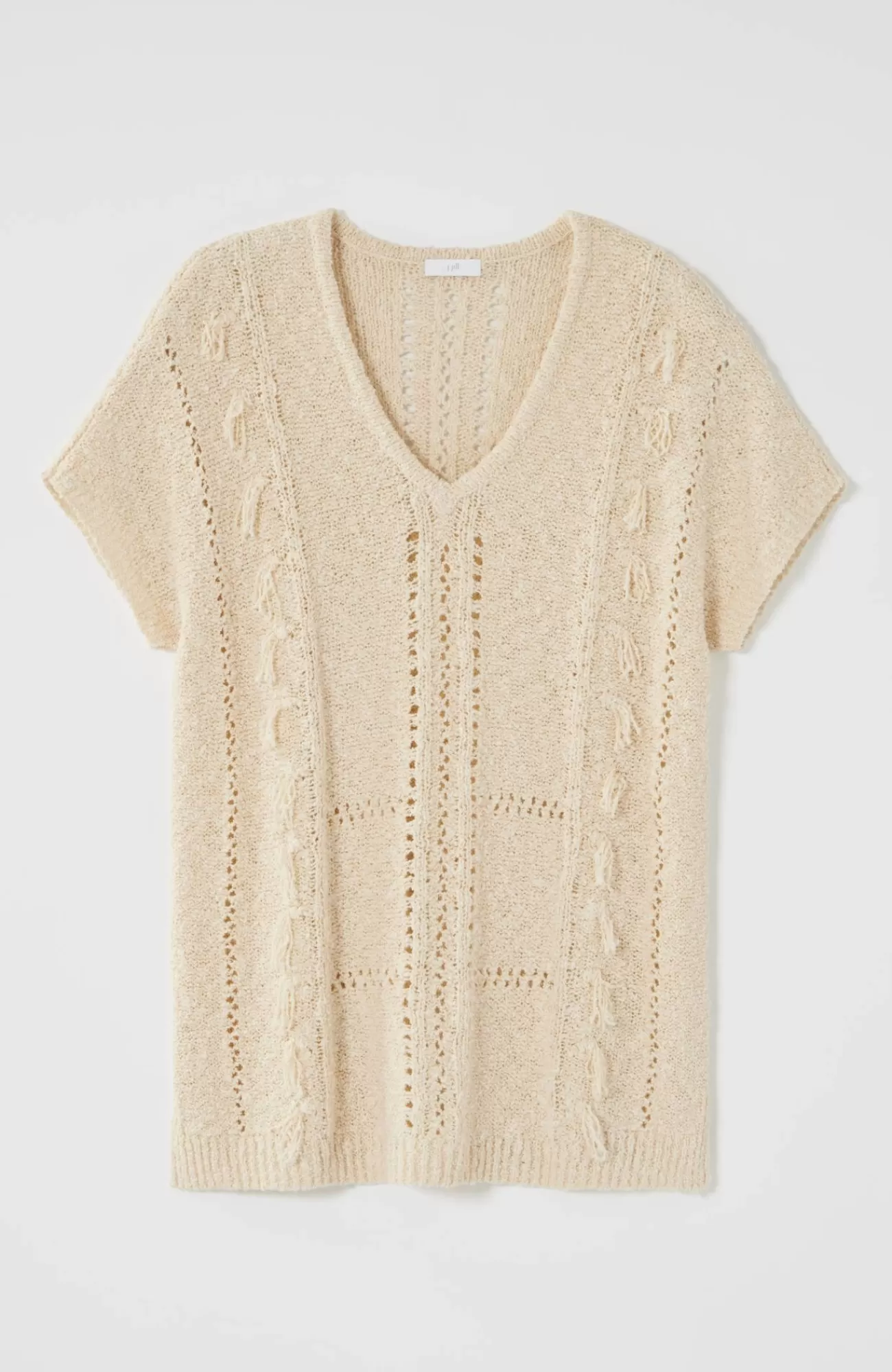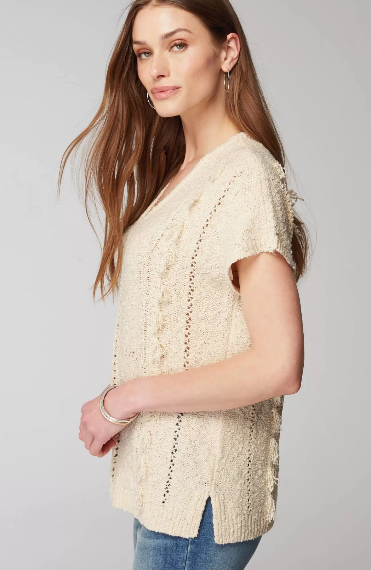 The most effortless sweater, made in a soft cotton blend with open-knit accents and a touch of fringe for feel-good texture. Side vents.
