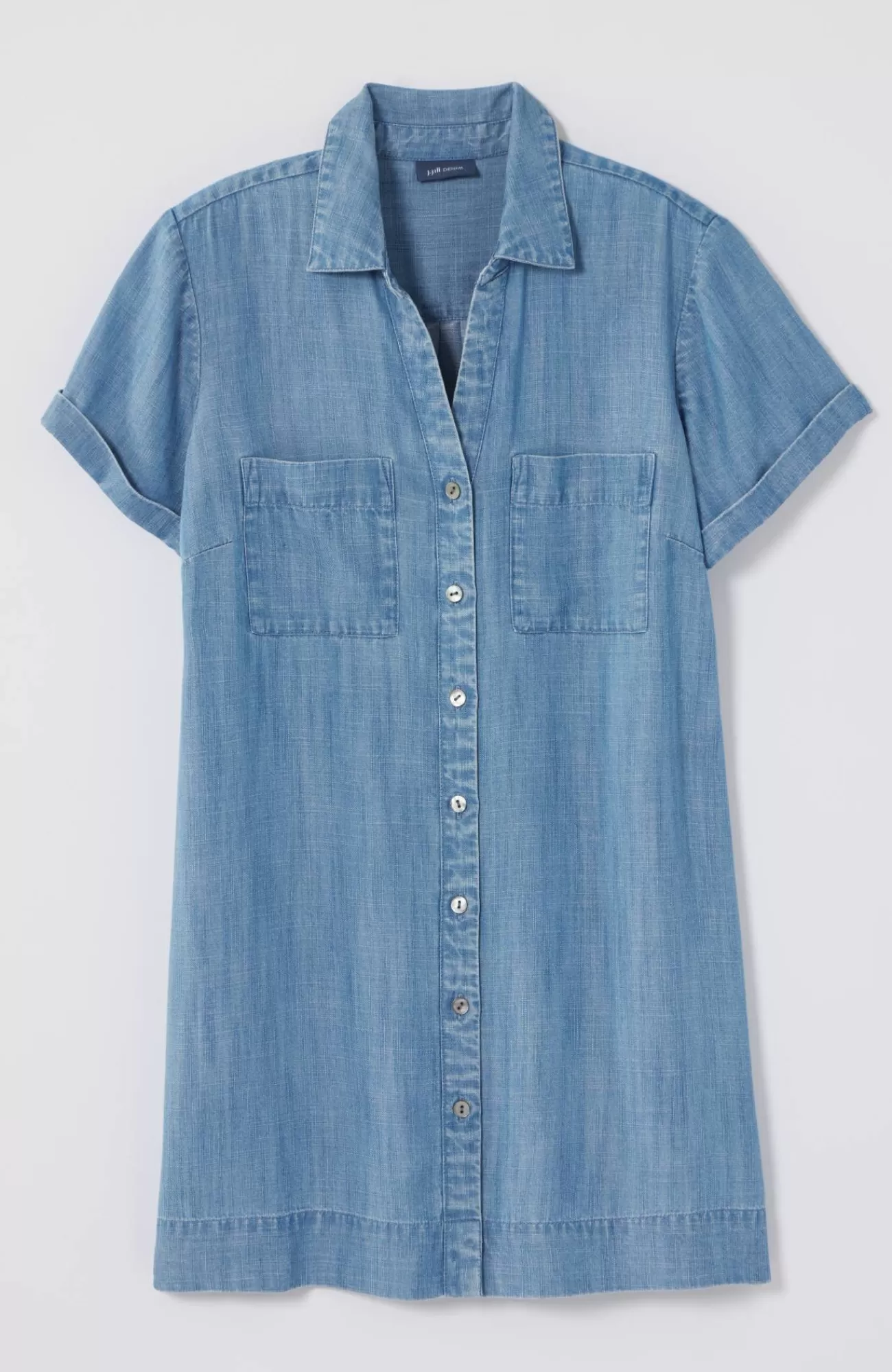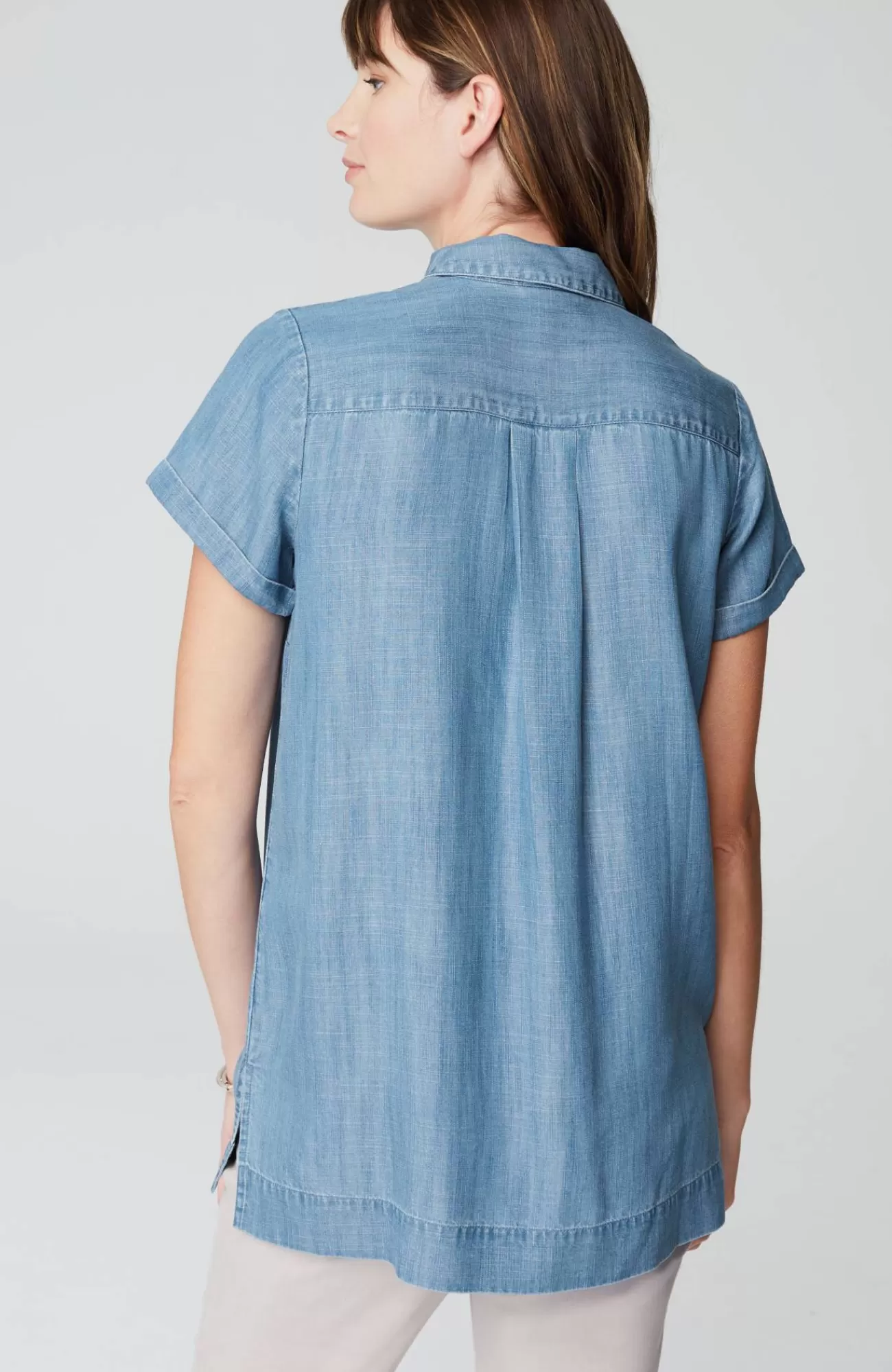 Inspired indigo, in a soft, lightweight tunic designed with a graceful, flattering drape. Accented with classic details—tailored button front, shirt collar and patch pockets at the chest—finished with rolled sleeves and a swingy hem.