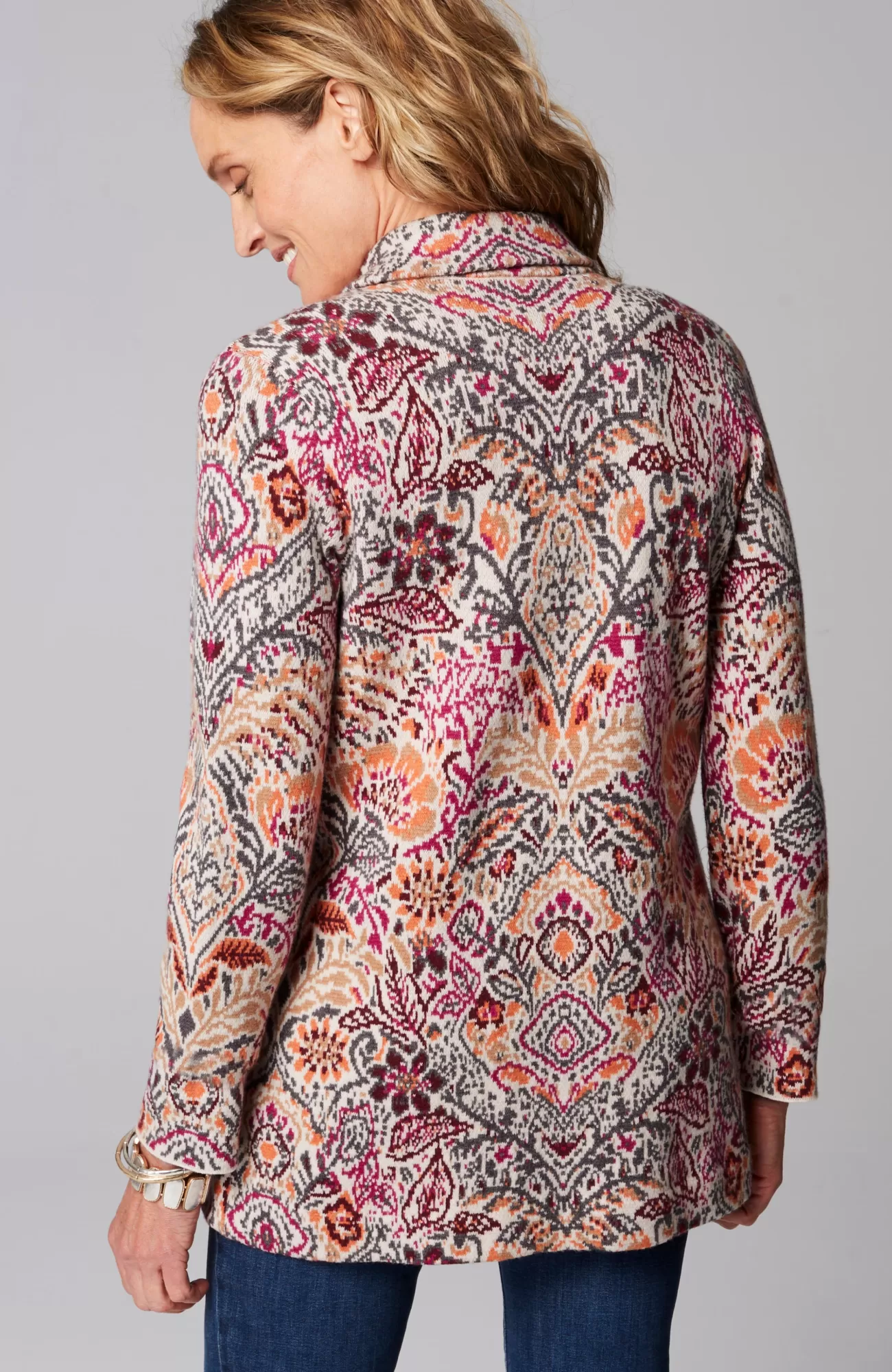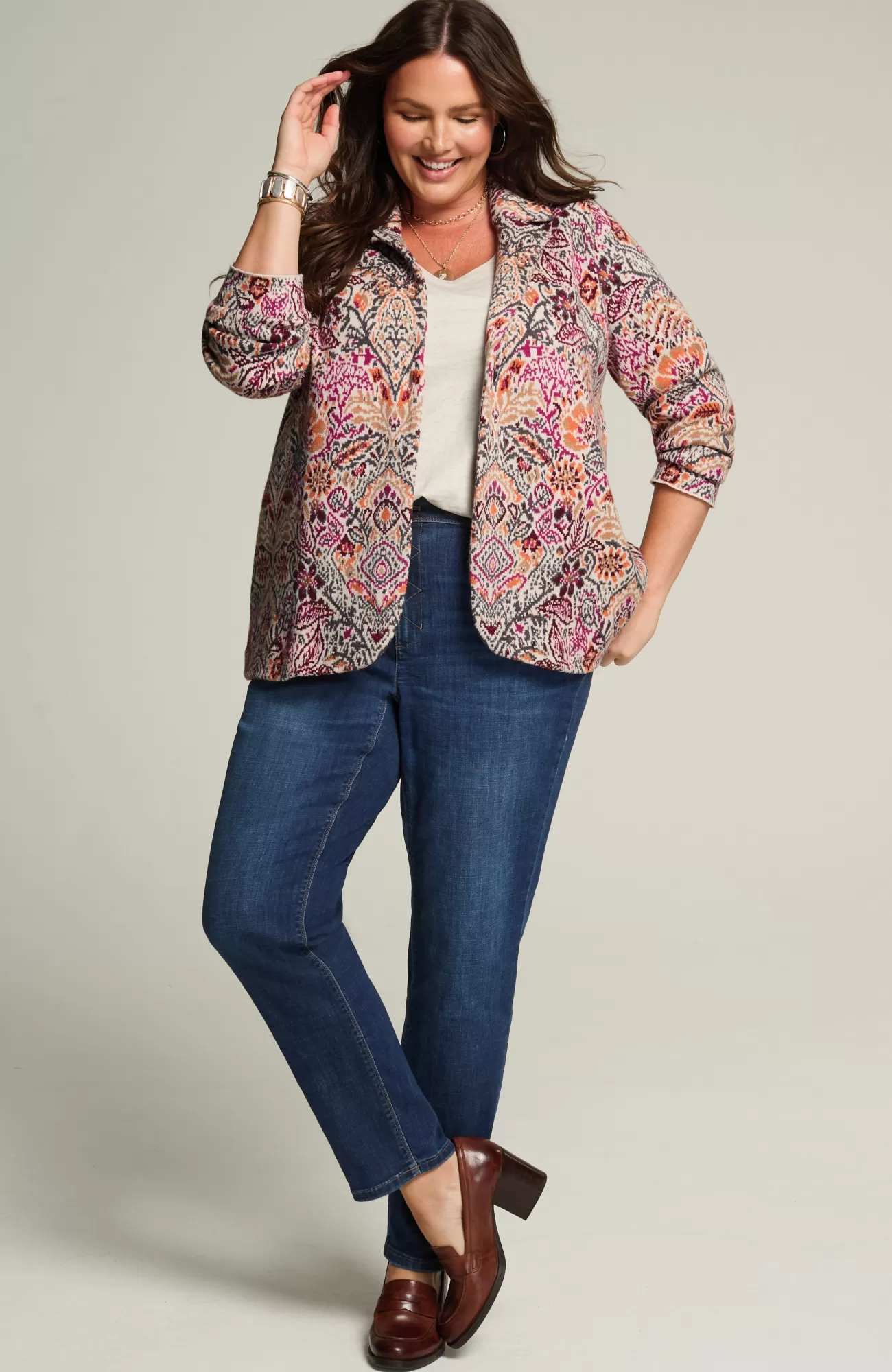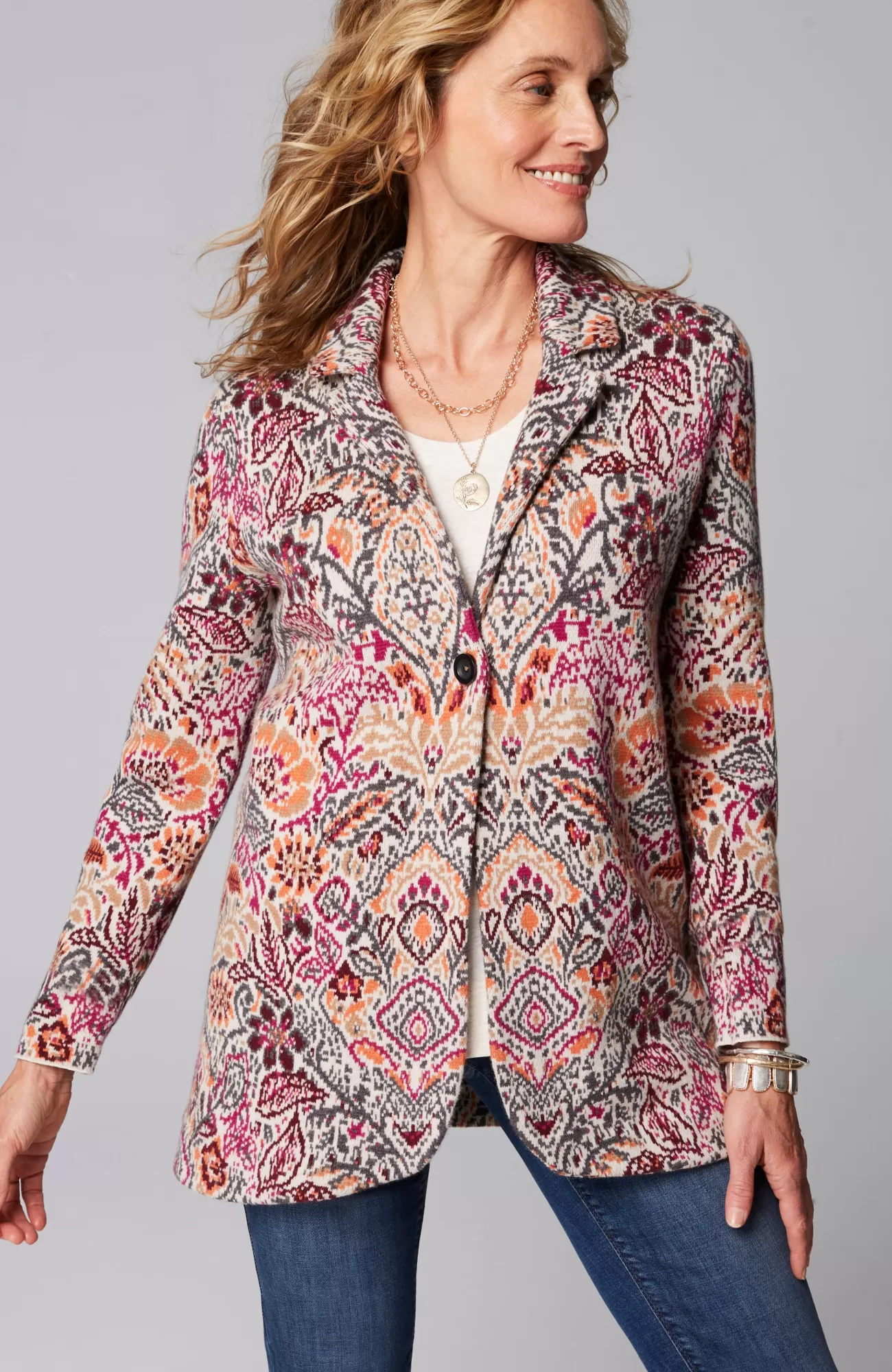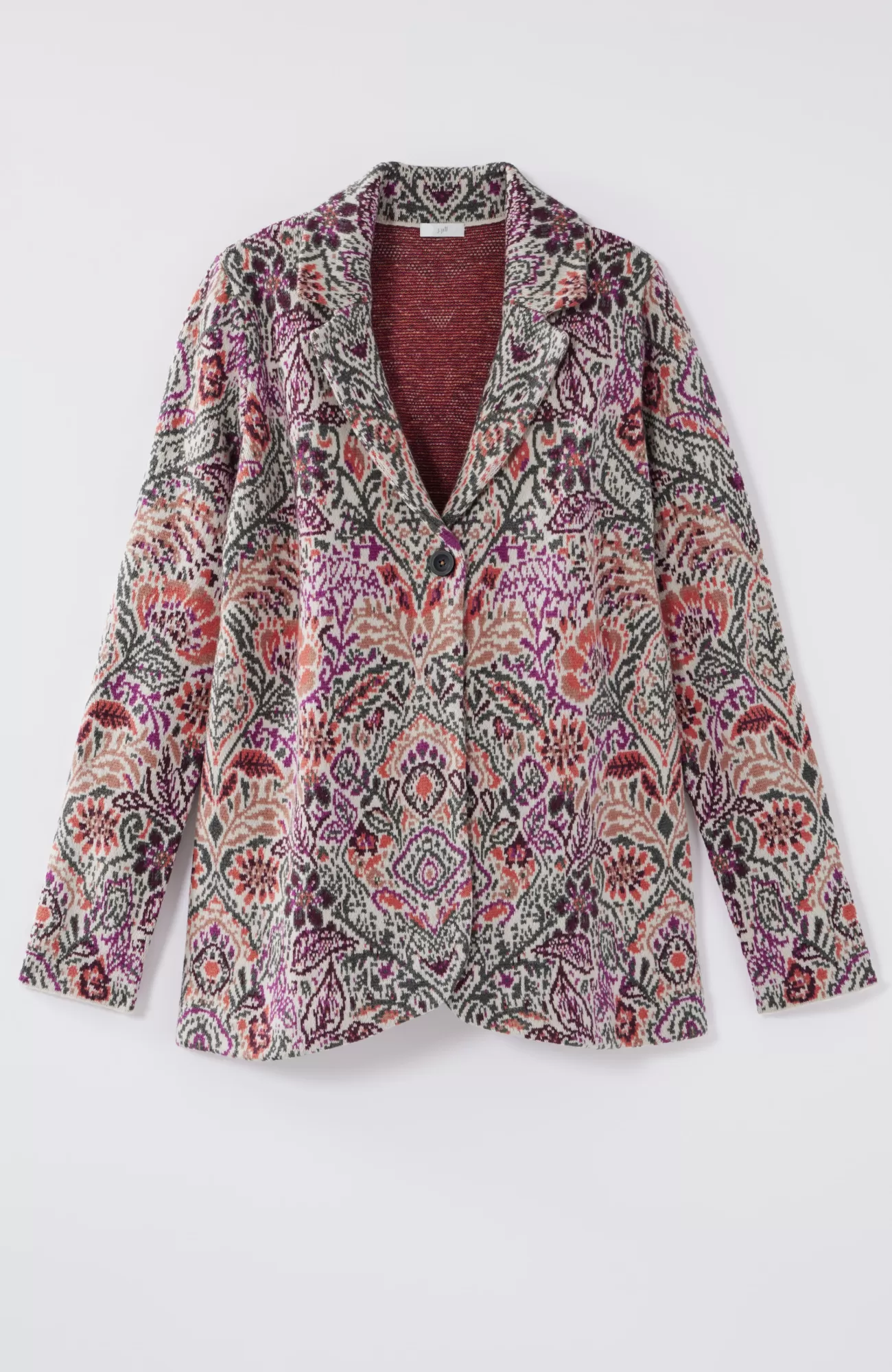 Embrace the romance of fall in our beautifully detailed sweater blazer. The pattern takes its inspiration from William Morris, a renowned printmaker during the nineteenth century Arts & Crafts movement. Style it as a statement-making alternative to your go-to jacket or cardi. Notch collar. Single-button closure at front. Curved front hem.