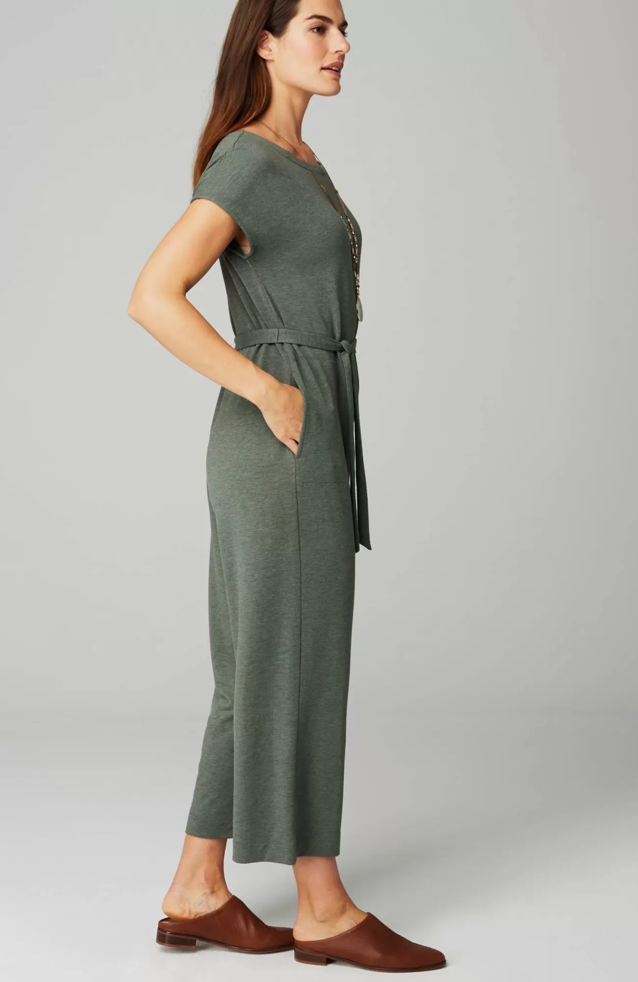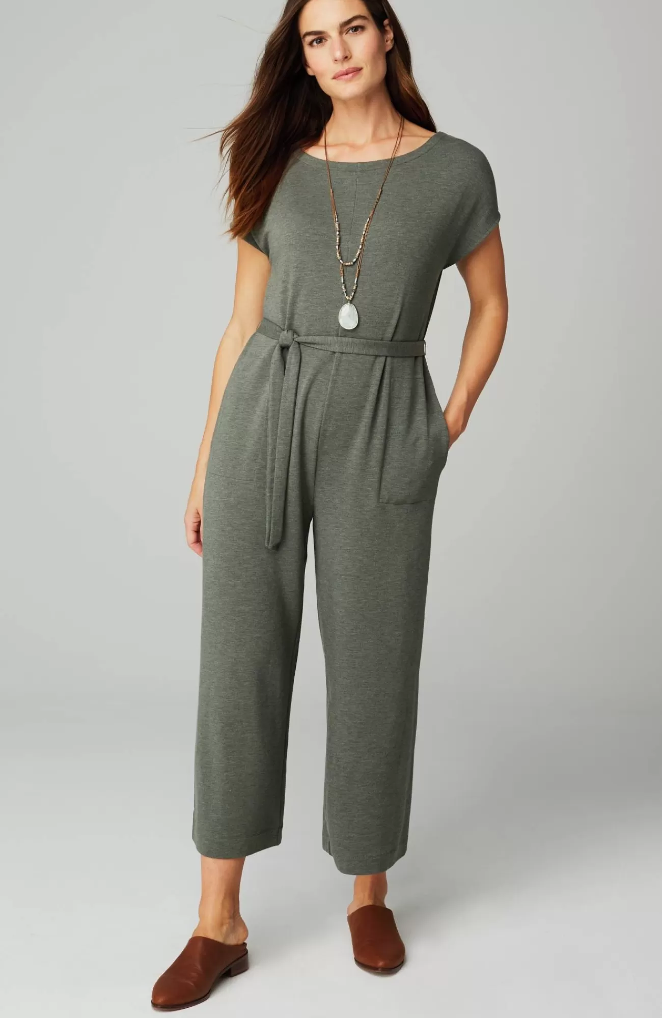 One-piece wonderful: our soft French terry knit jumpsuit. With perfectly placed pockets, designed to be worn with or without the belt.