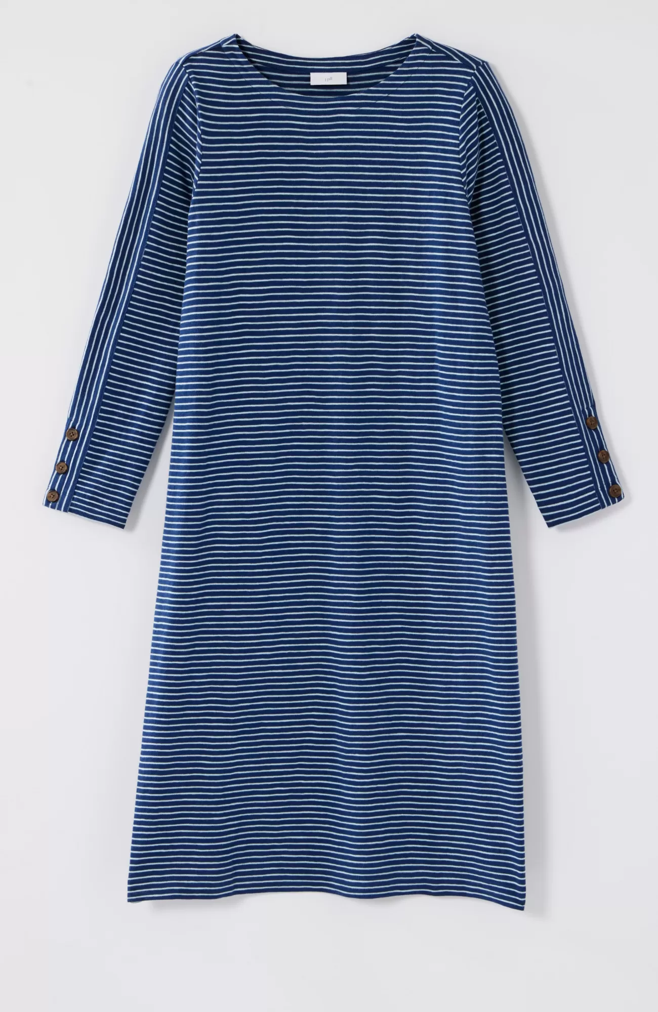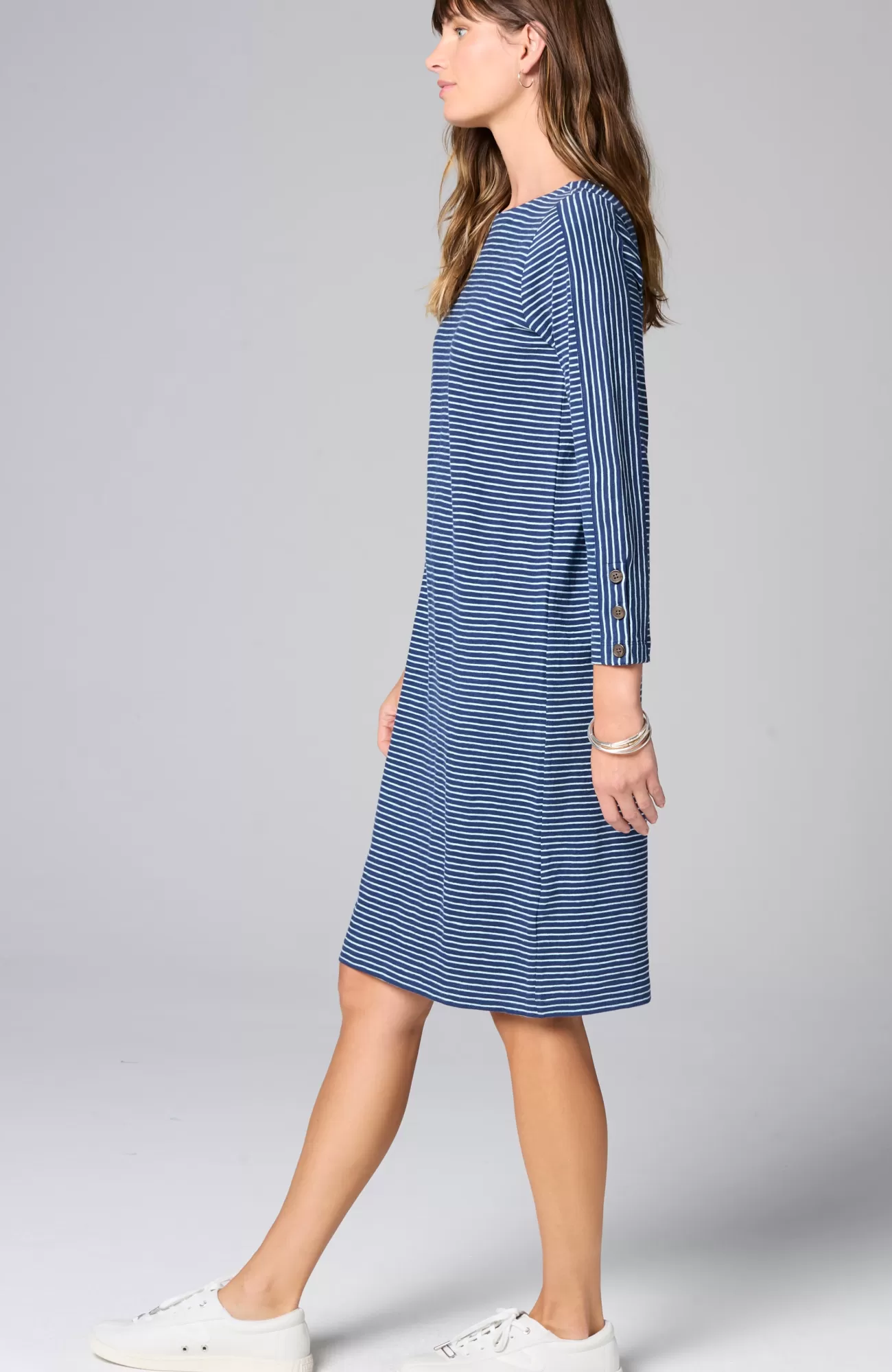Our nautical knit dress takes pattern play in a new direction, thanks to the mix of horizontal stripes on the body and vertical and horizontal stripes on the sleeves. The cotton-slub fabric is supremely soft. Plus, we love the detail of the functional faux-horn buttons on the sleeve cuffs. Unlined.