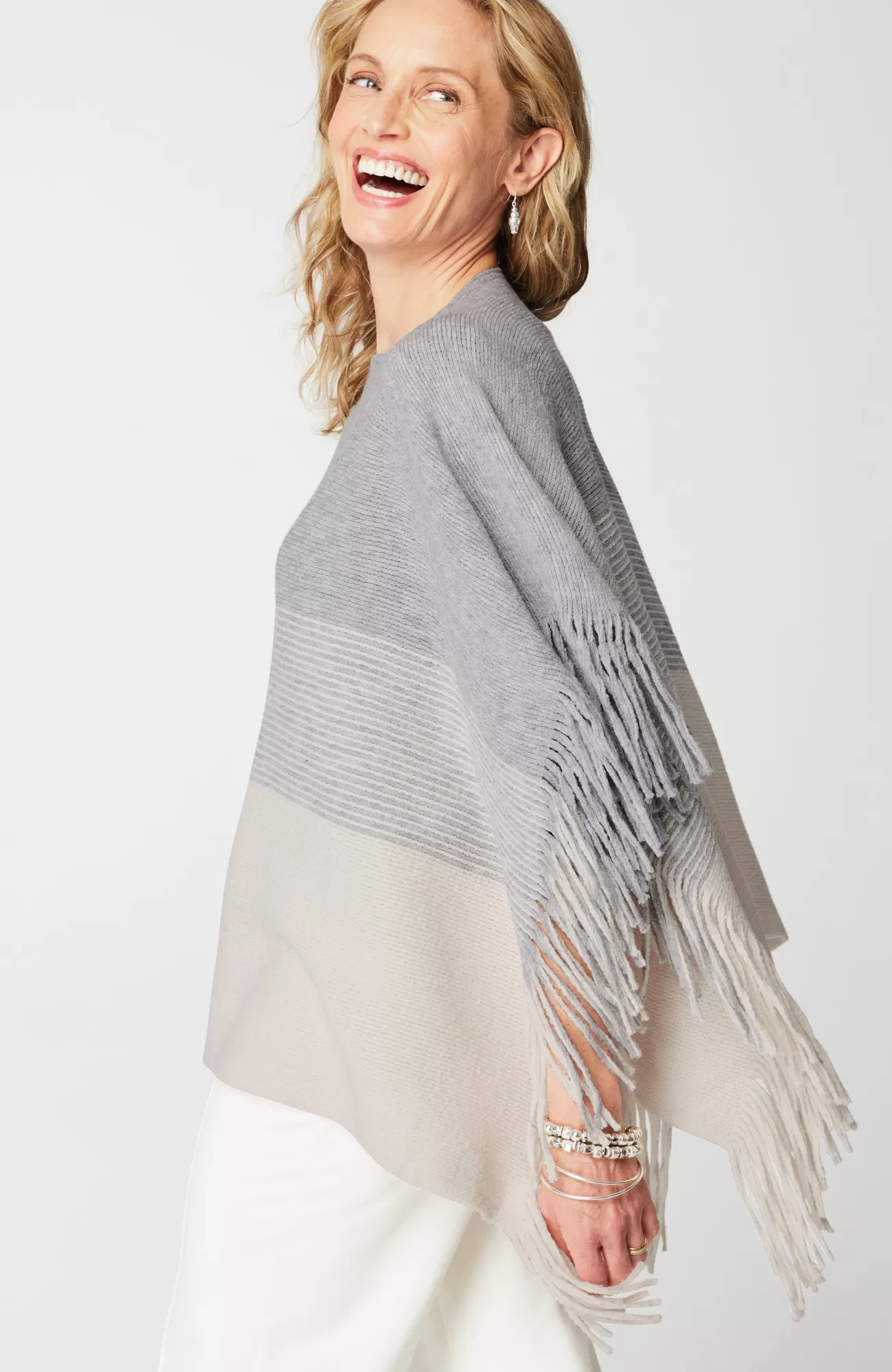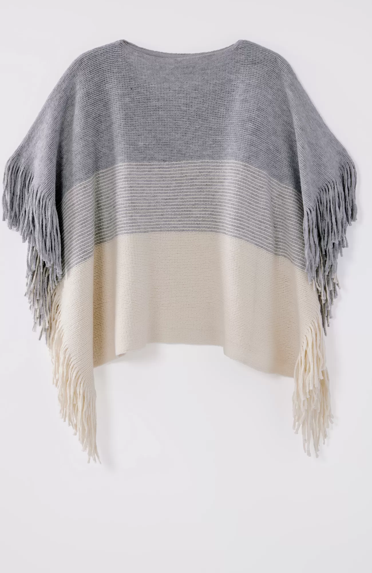 Nothing says "fun" like fringe—we added it on each side of this knit poncho for a playful touch. Cozy and oh-so soft, this piece is a heavier weight, ideal for cooler days and nights. Closed at the sides.