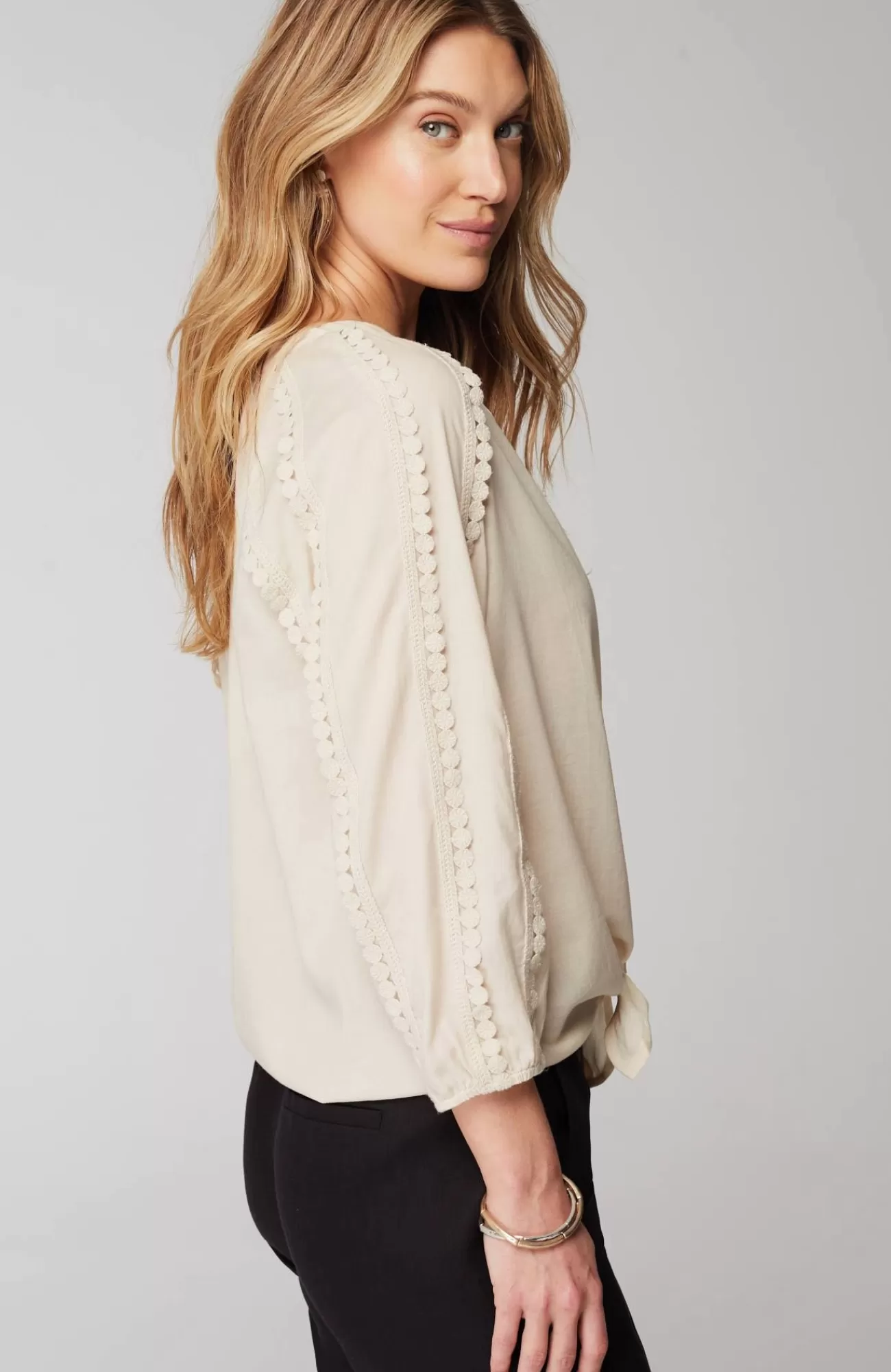 Meet the everyday button-up with a little something extra. We added delicate lace embroidery at the sleeves and shirring at the neckline, with a casual tie-front design for an unexpected update.