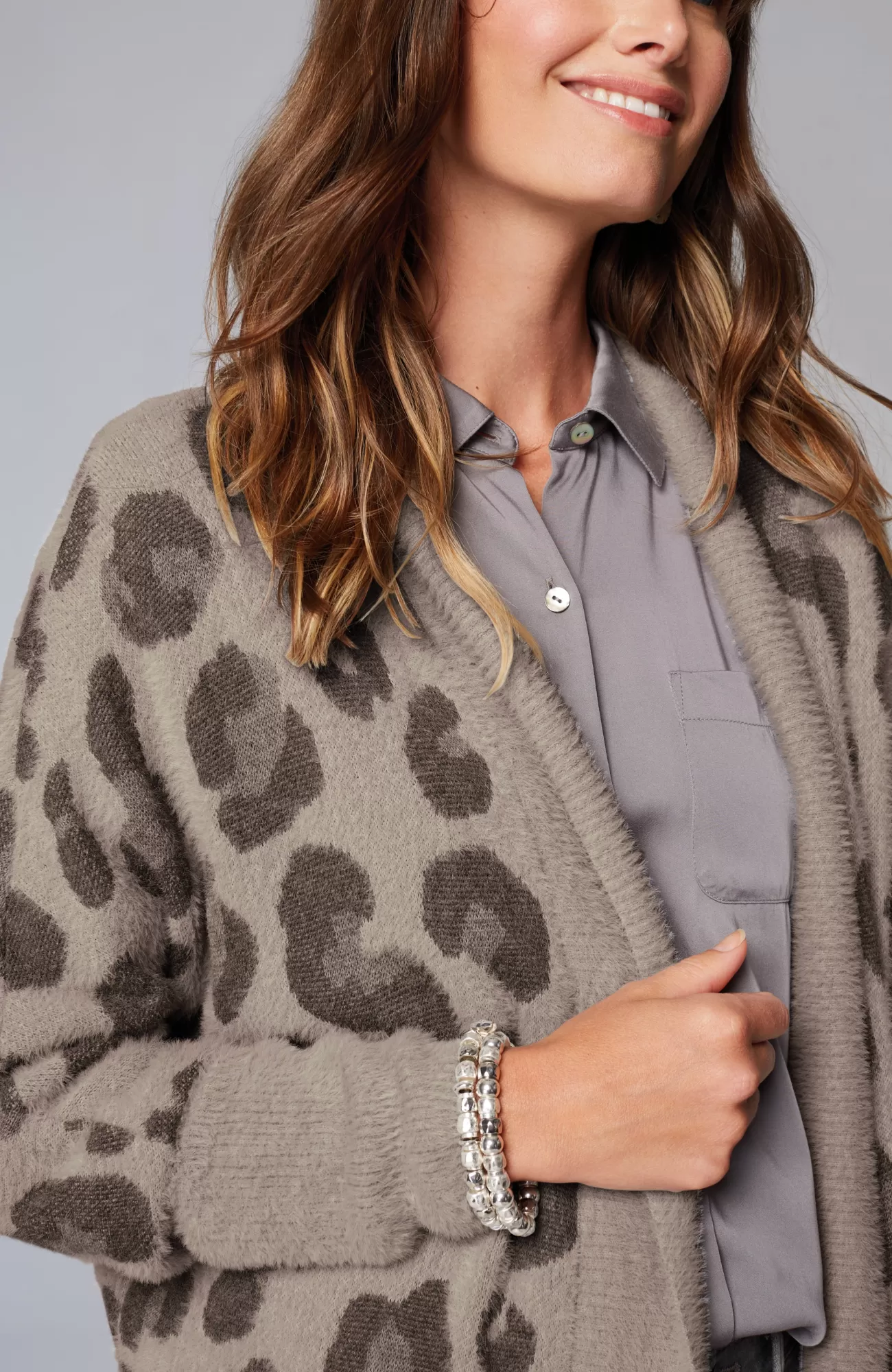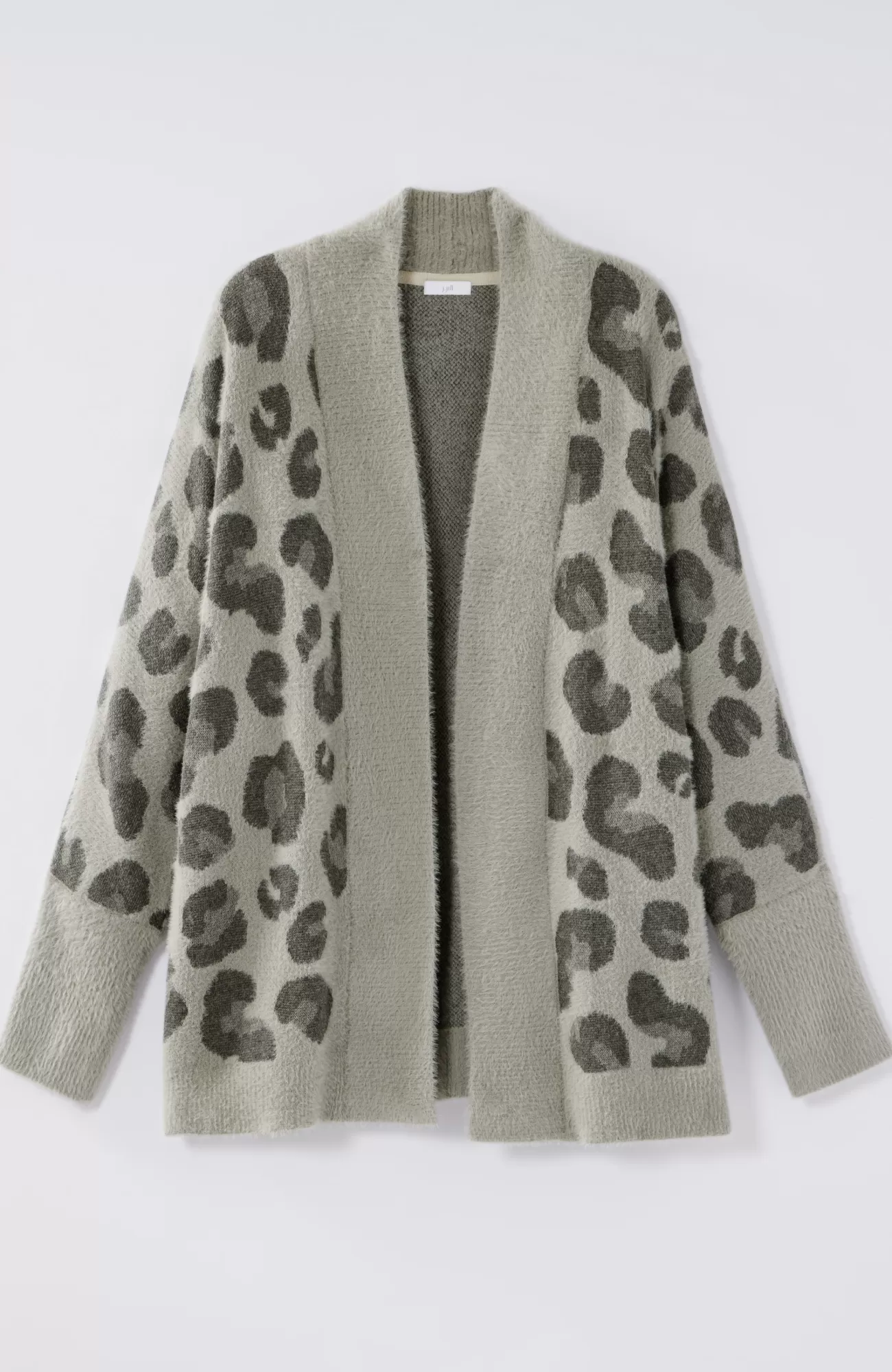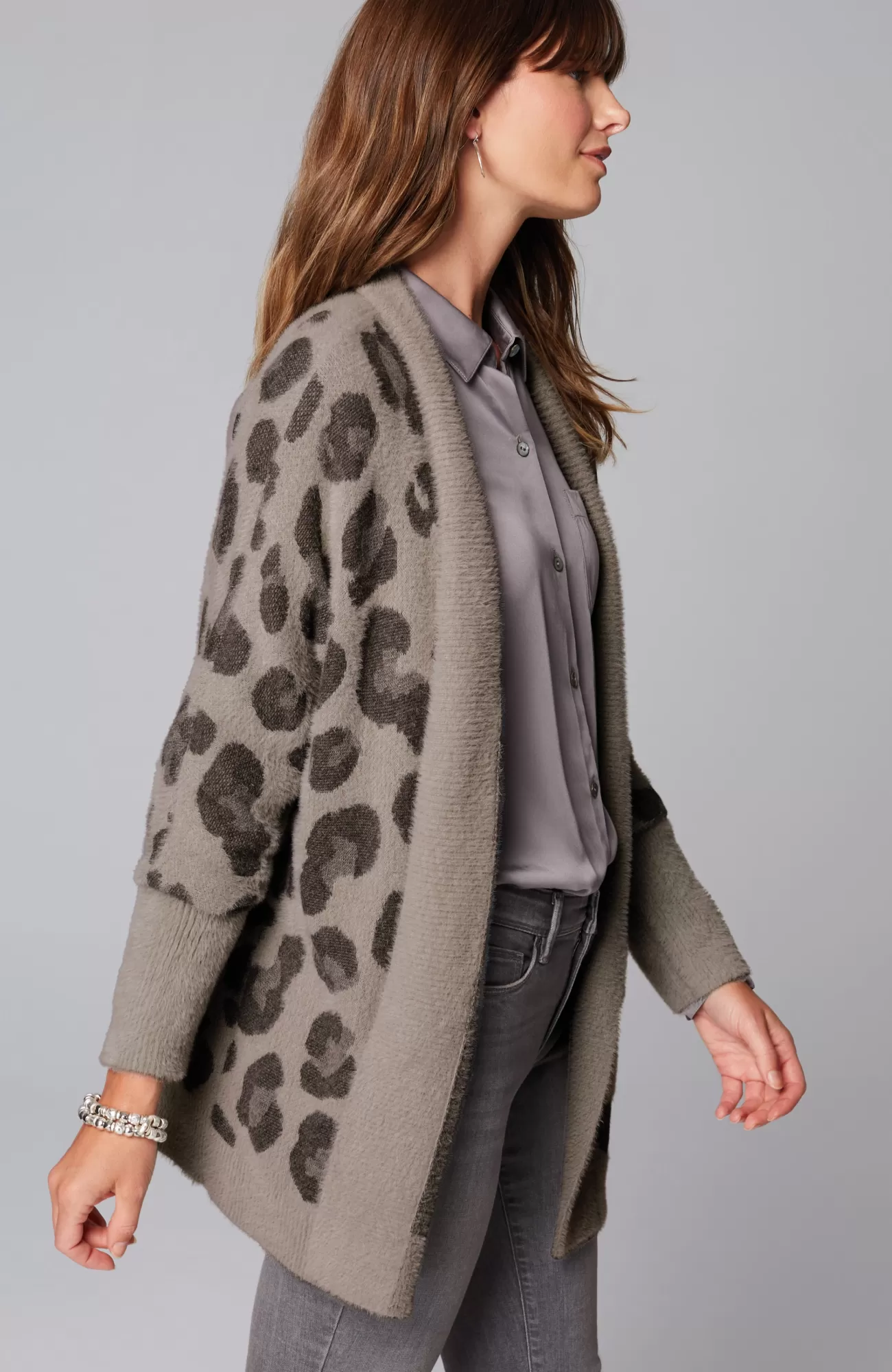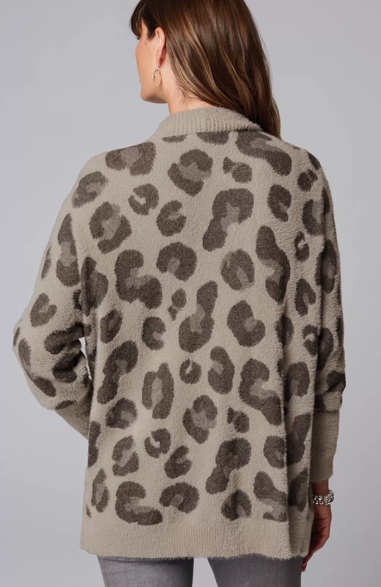 Leopard is having a major moment, and we love this fresh take on the classic motif in shades of grey. Our open-front, dolman-sleeve cardi is crafted in the plushest yarn, for an extra soft and cozy feel. Finished with a ribbed placket and hem as well as elongated ribbed cuffs.