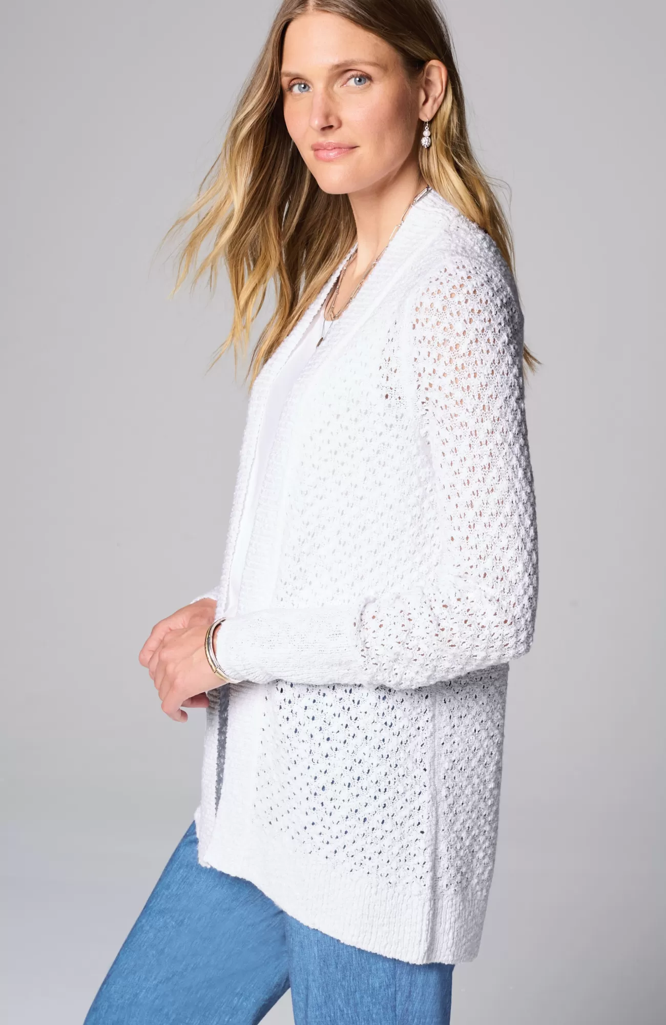 This breezy sweater features an open front and a flattering high-low hemline that makes layering a cinch. We crafted the unique wavey pattern using lightweight cotton-blend yarns with a soft slub texture. Finished with a ribbed front placket, elongated cuffs and hem.