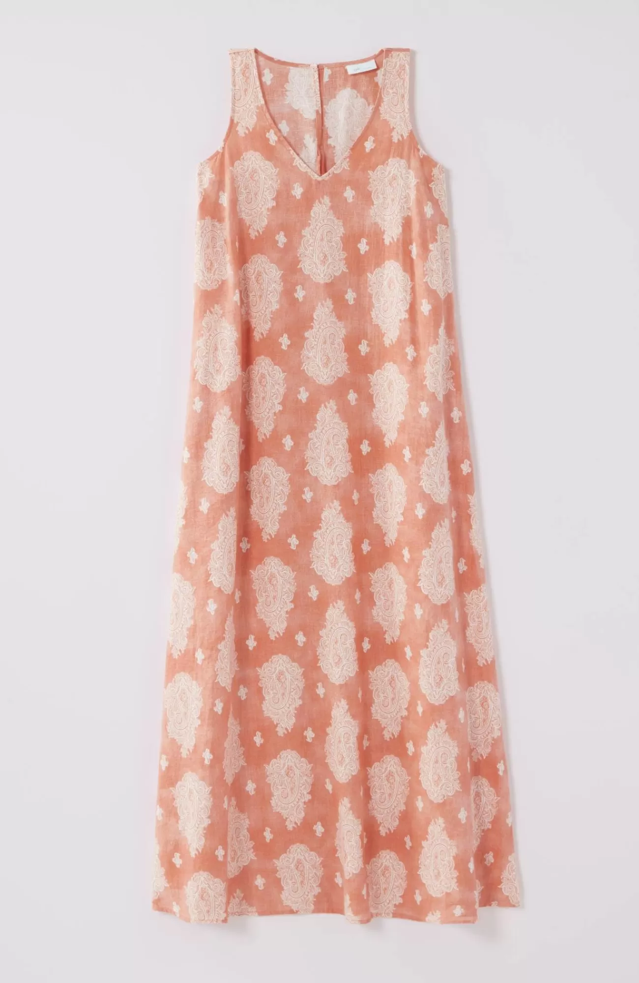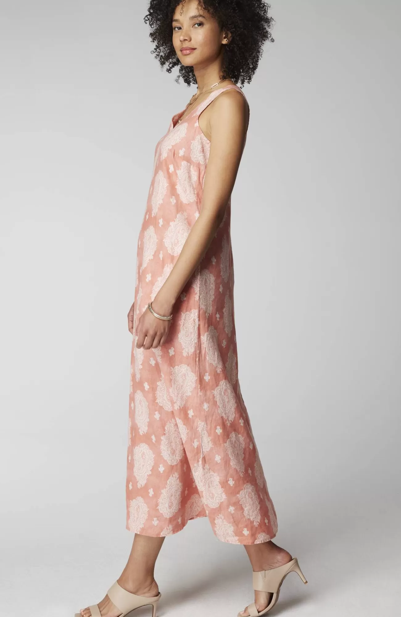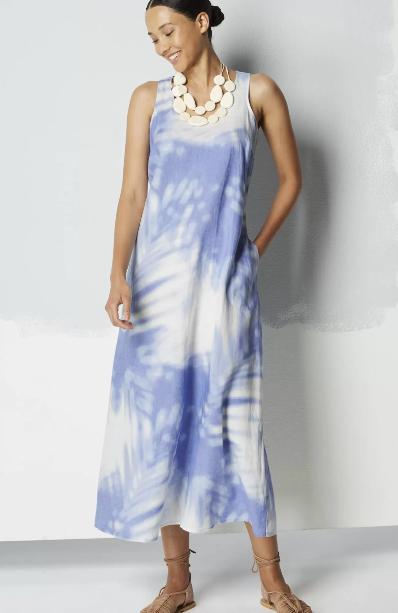 Designed with an abstract oversized palm print, our light and airy linen maxi makes every day feel like a vacation. V-neckline. On-seam pockets hold small essentials. Back keyhole with button and loop.
