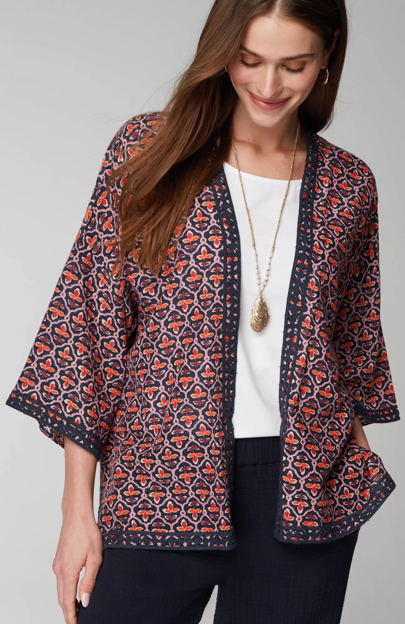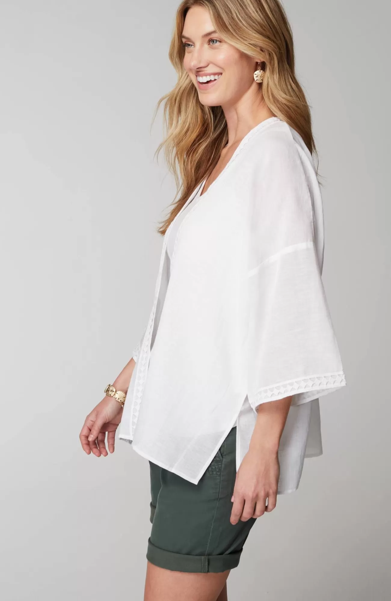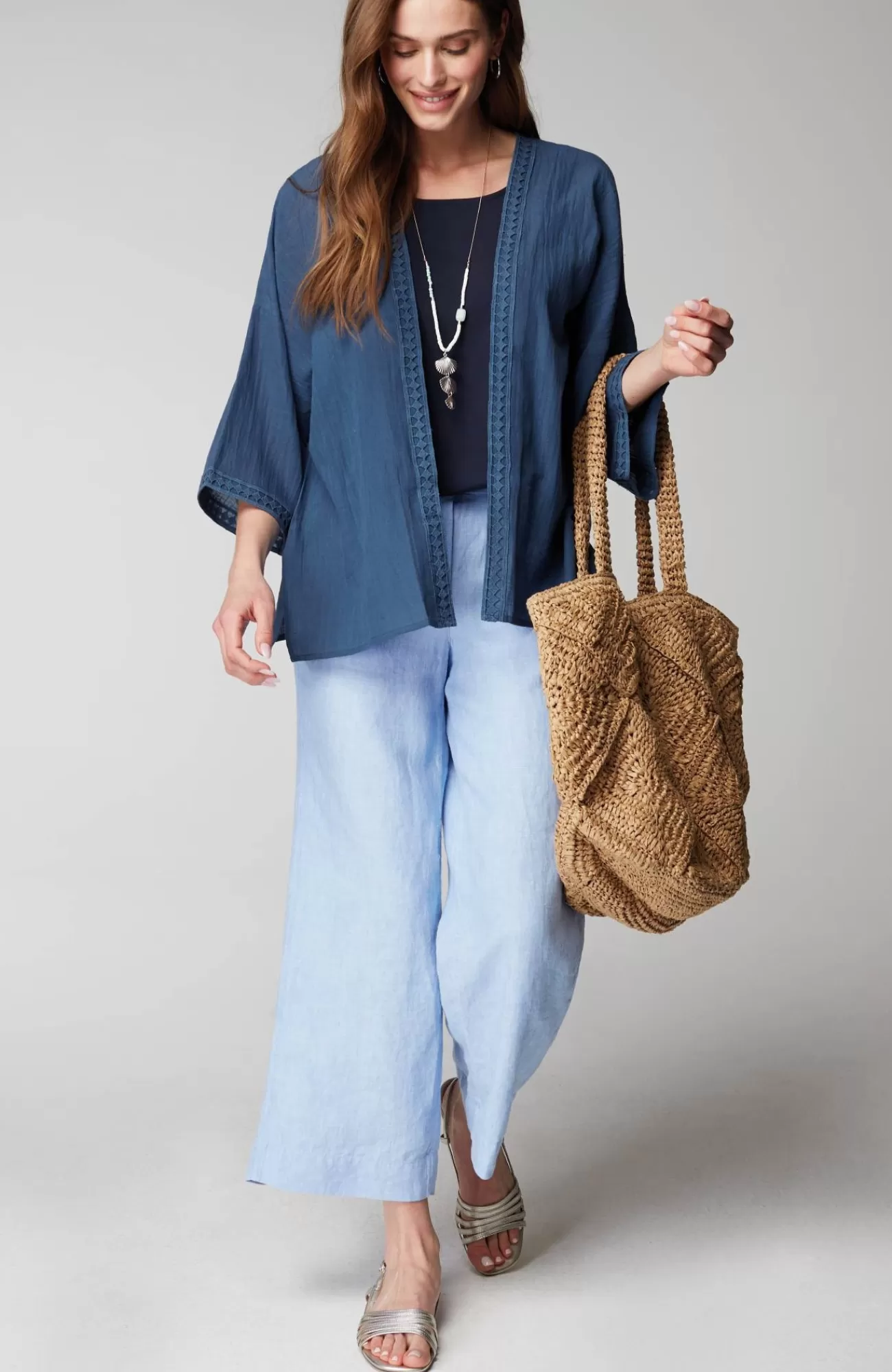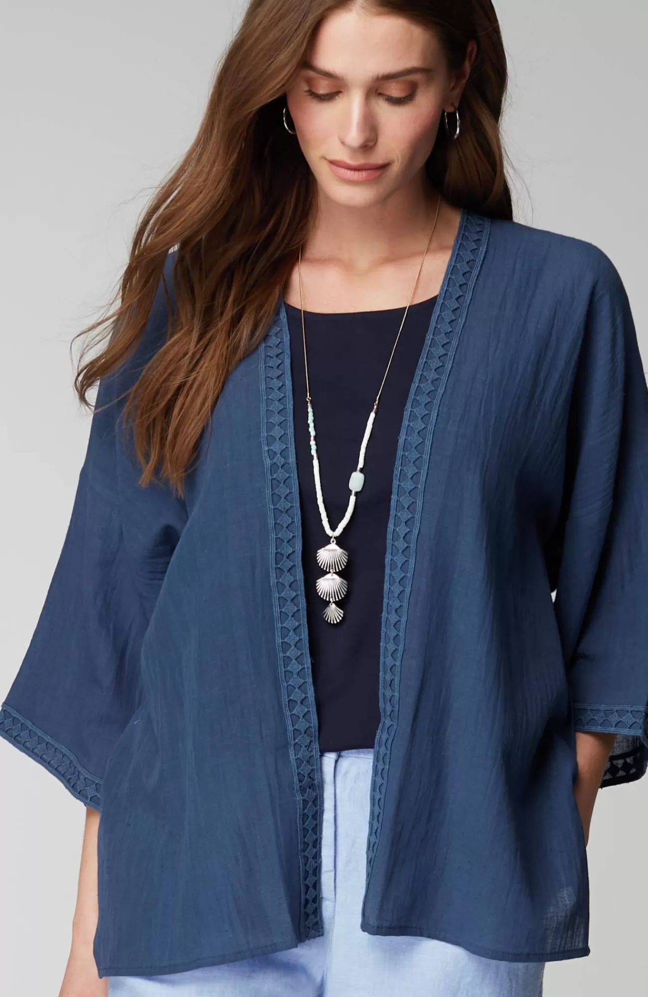 The lightest layer in your closet—this open-front jacket feels like a breeze, whether you're headed to the beach,the office or a summer celebration. We love how the border trim at the center and sleeves adds just-right detail.