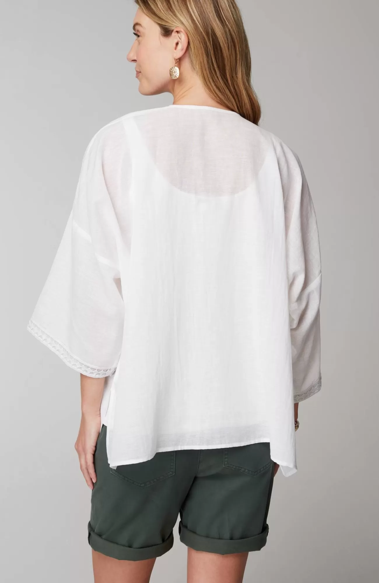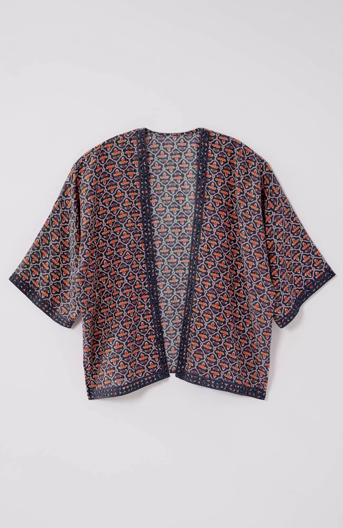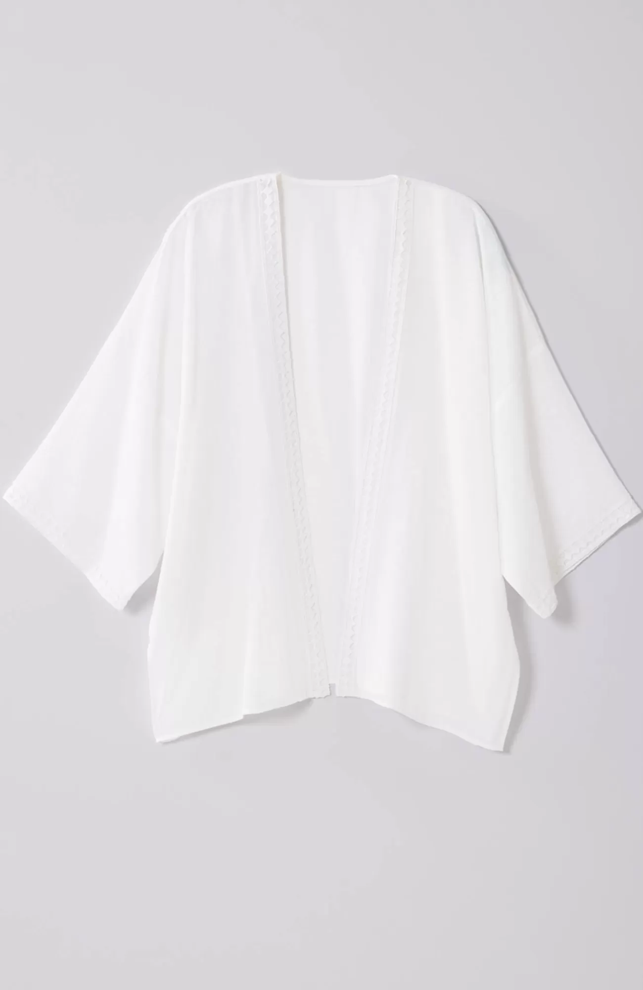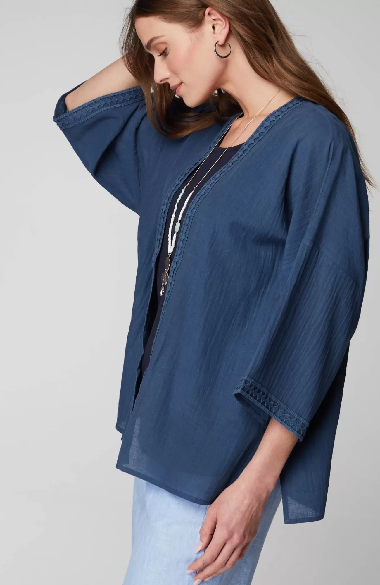 The lightest layer in your closet—this open-front jacket feels like a breeze, whether you're headed to the beach,the office or a summer celebration. We love how the border trim at the center and sleeves adds just-right detail.