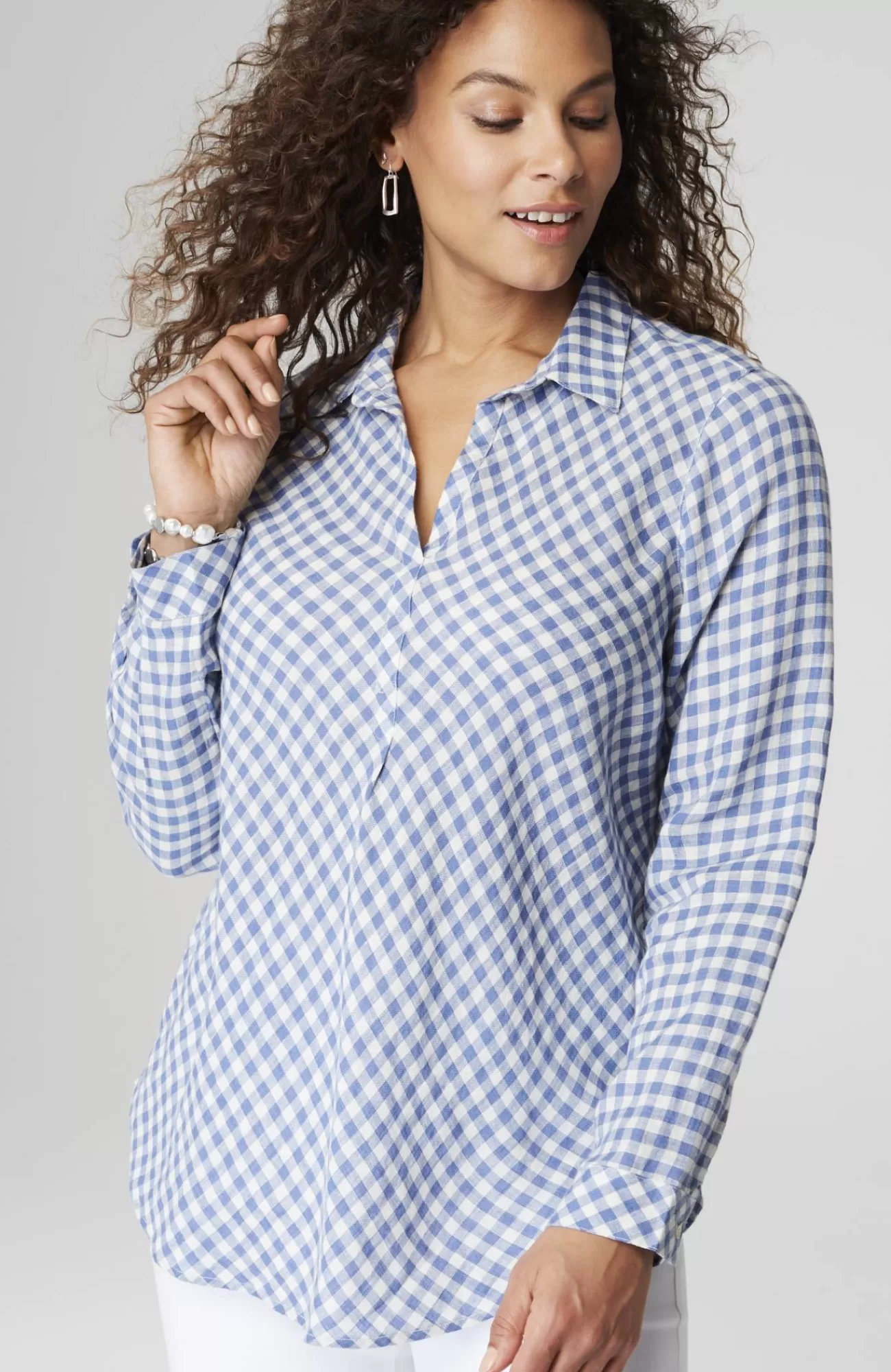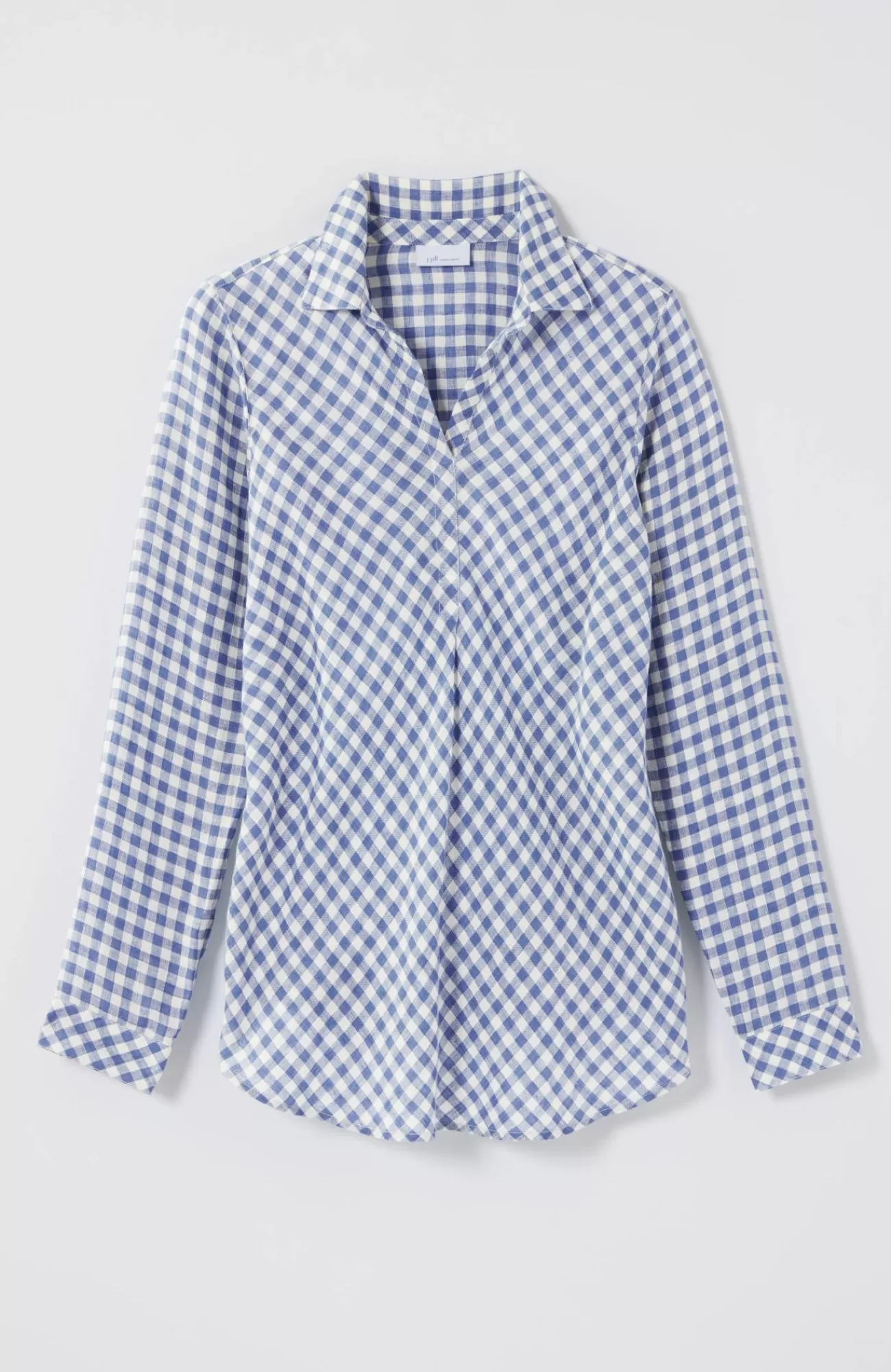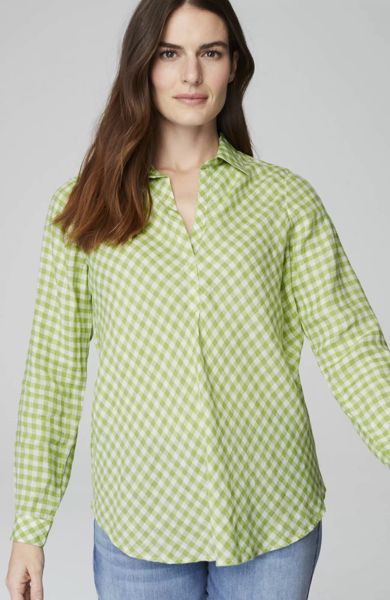Our most effortless linen top, in a pullover silhouette and yarn-dyed gingham pattern, designed with a flattering bias cut and subtle pleats at the front. Finished with a classic shirt collar, buttoned cuffs and shirttail hemline that give it maximum versatility and all-season-long style.