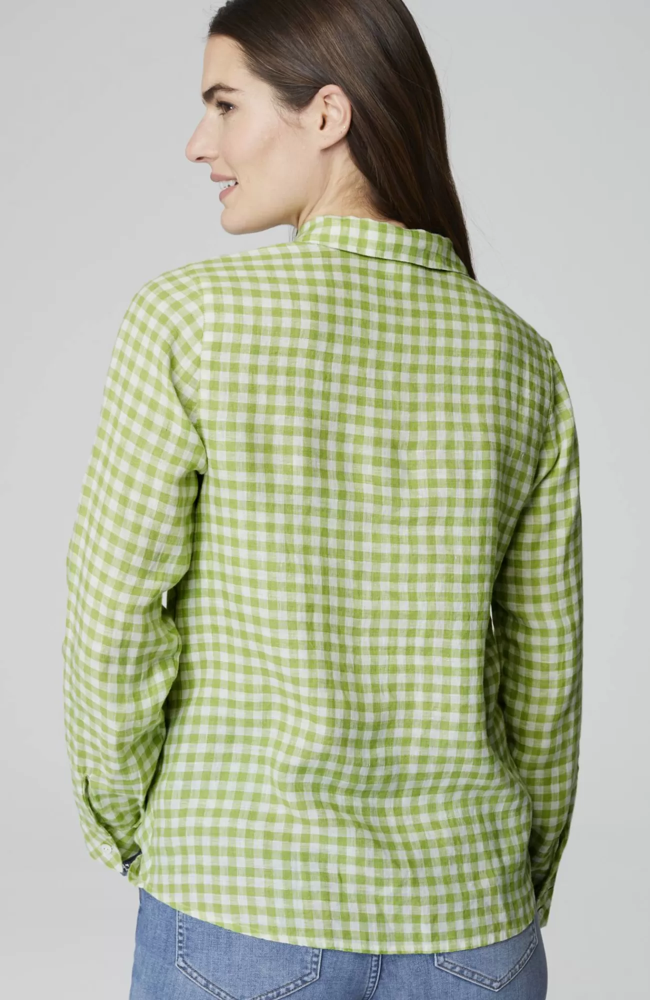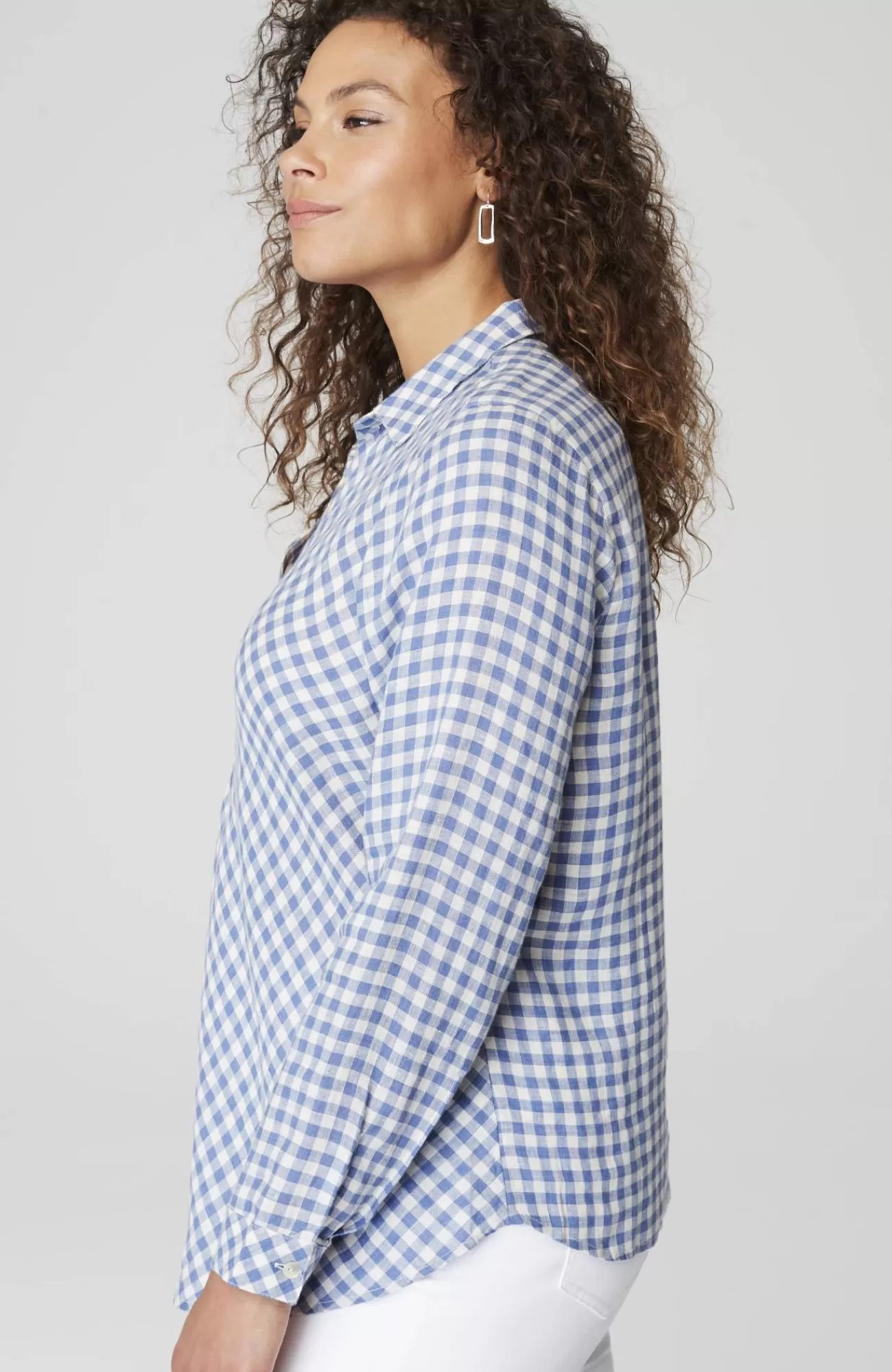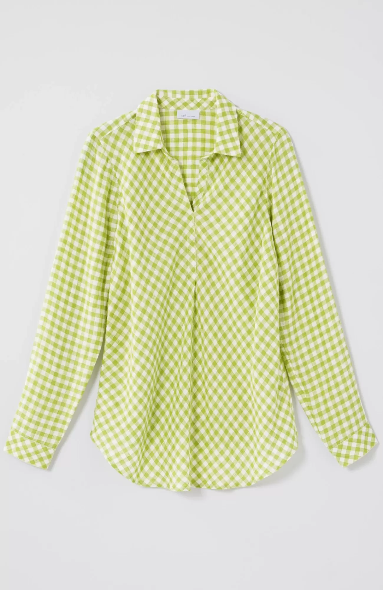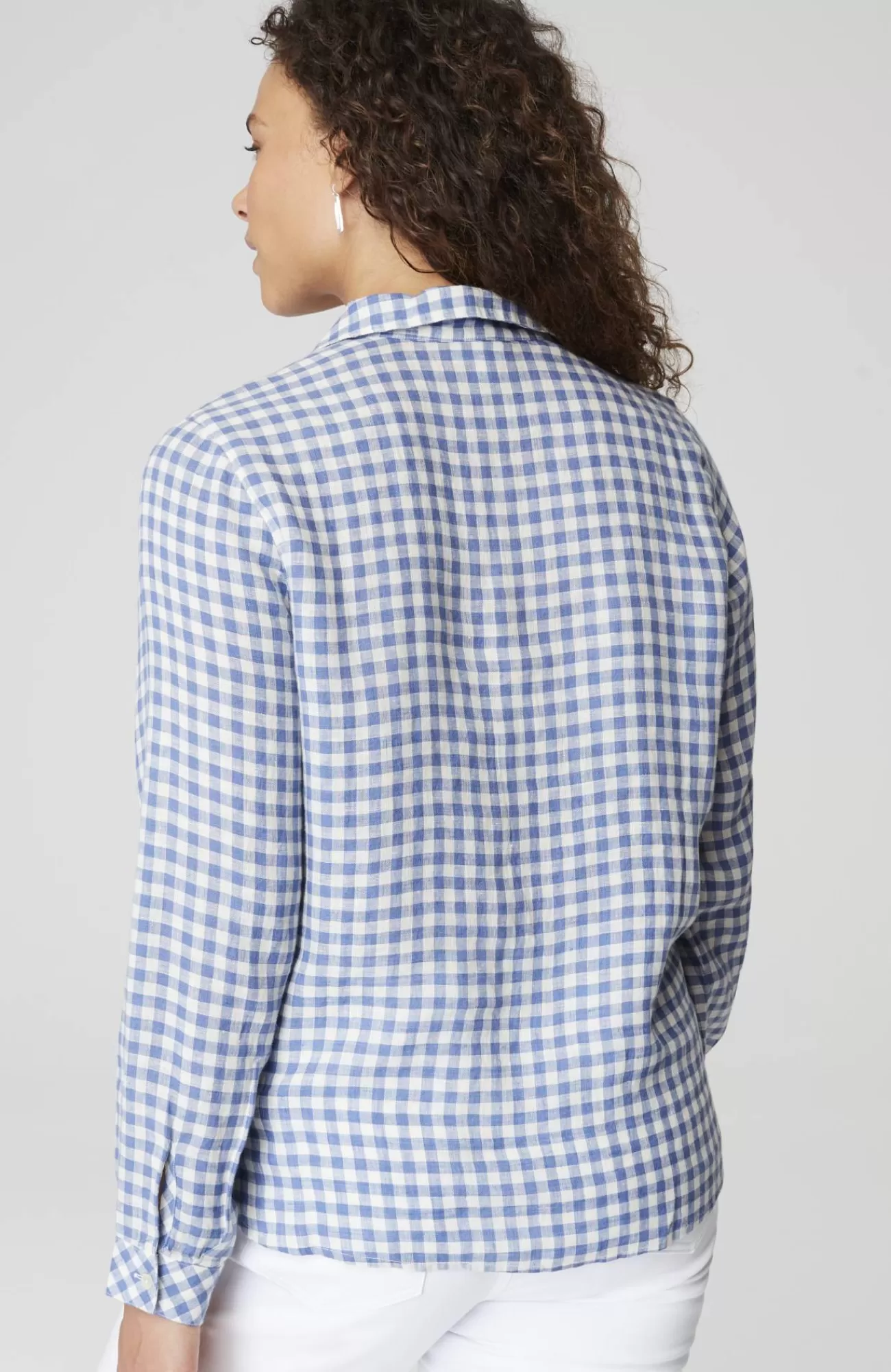 Our most effortless linen top, in a pullover silhouette and yarn-dyed gingham pattern, designed with a flattering bias cut and subtle pleats at the front. Finished with a classic shirt collar, buttoned cuffs and shirttail hemline that give it maximum versatility and all-season-long style.