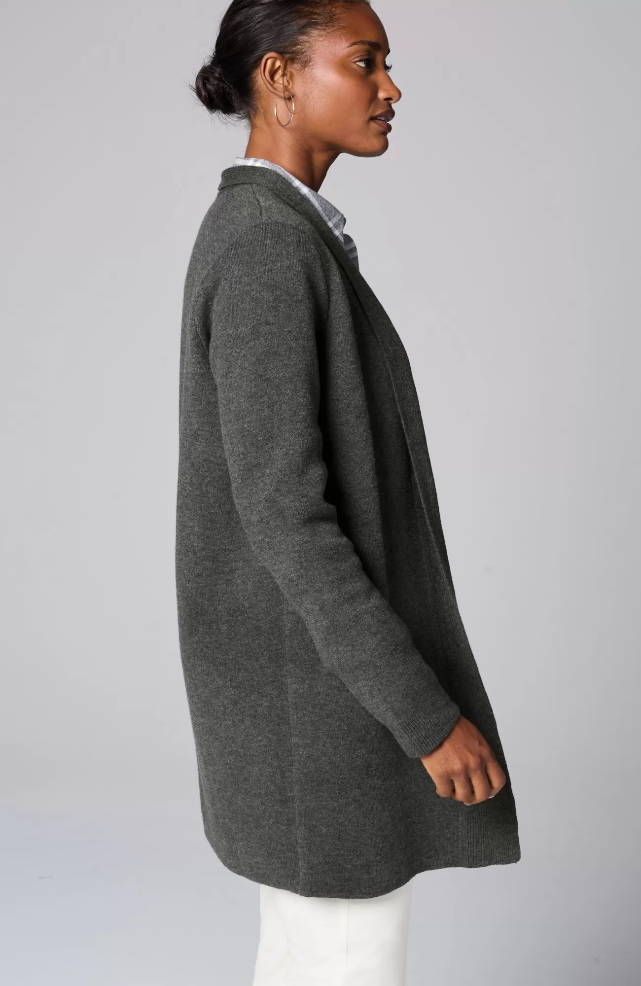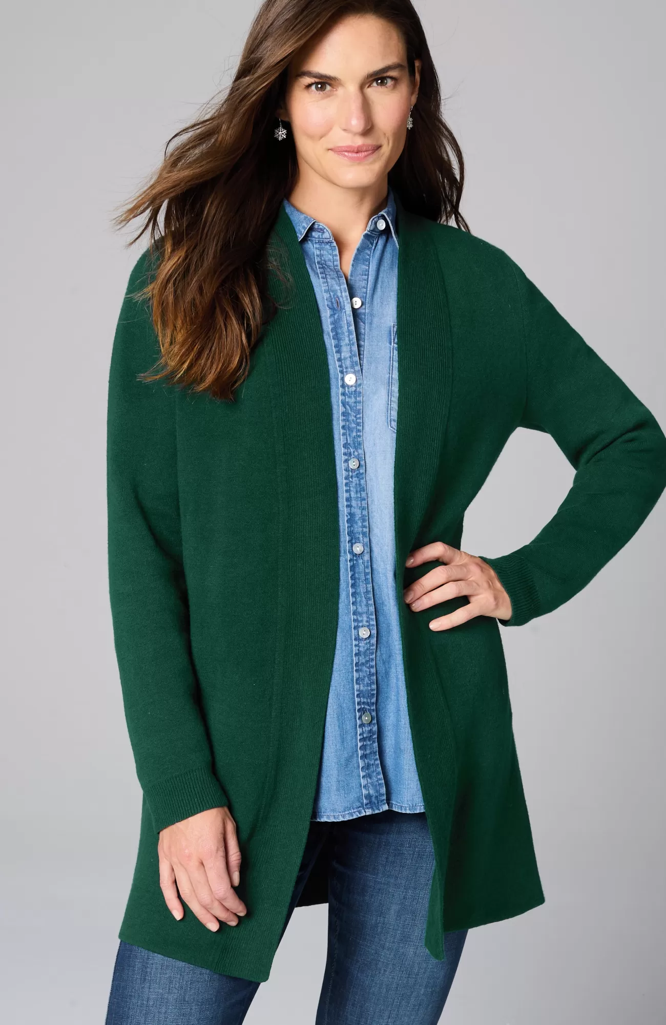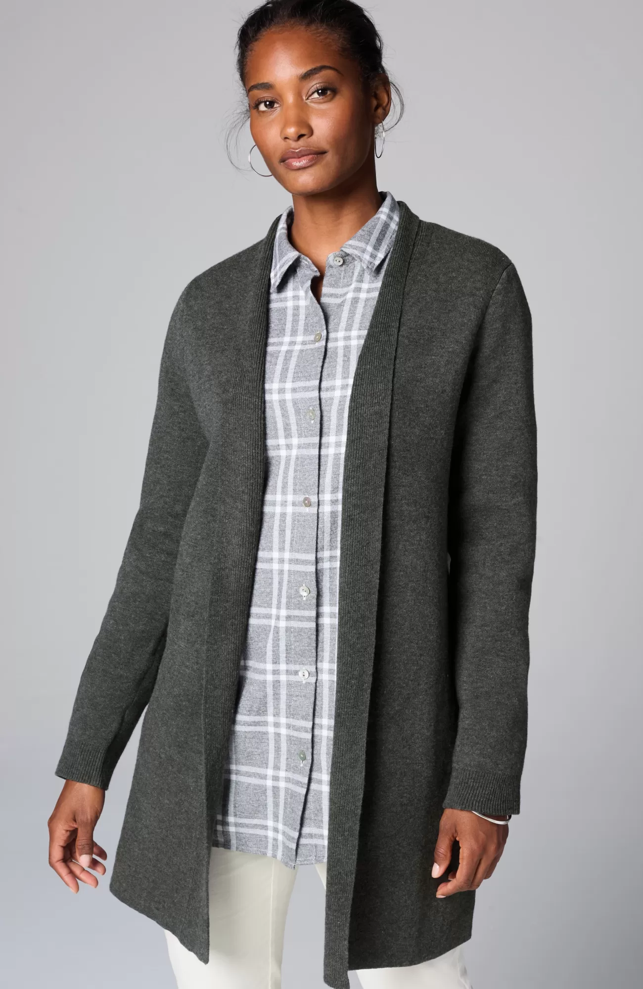 The layer of cozy your wardrobe needs, this streamlined sweater has an open-front design to show off base layers. It's knitted from the supersoft "majestic" cotton-blend yarns you love, and it’s available in two rich hues. Finished with a ribbed placket and cuffs.