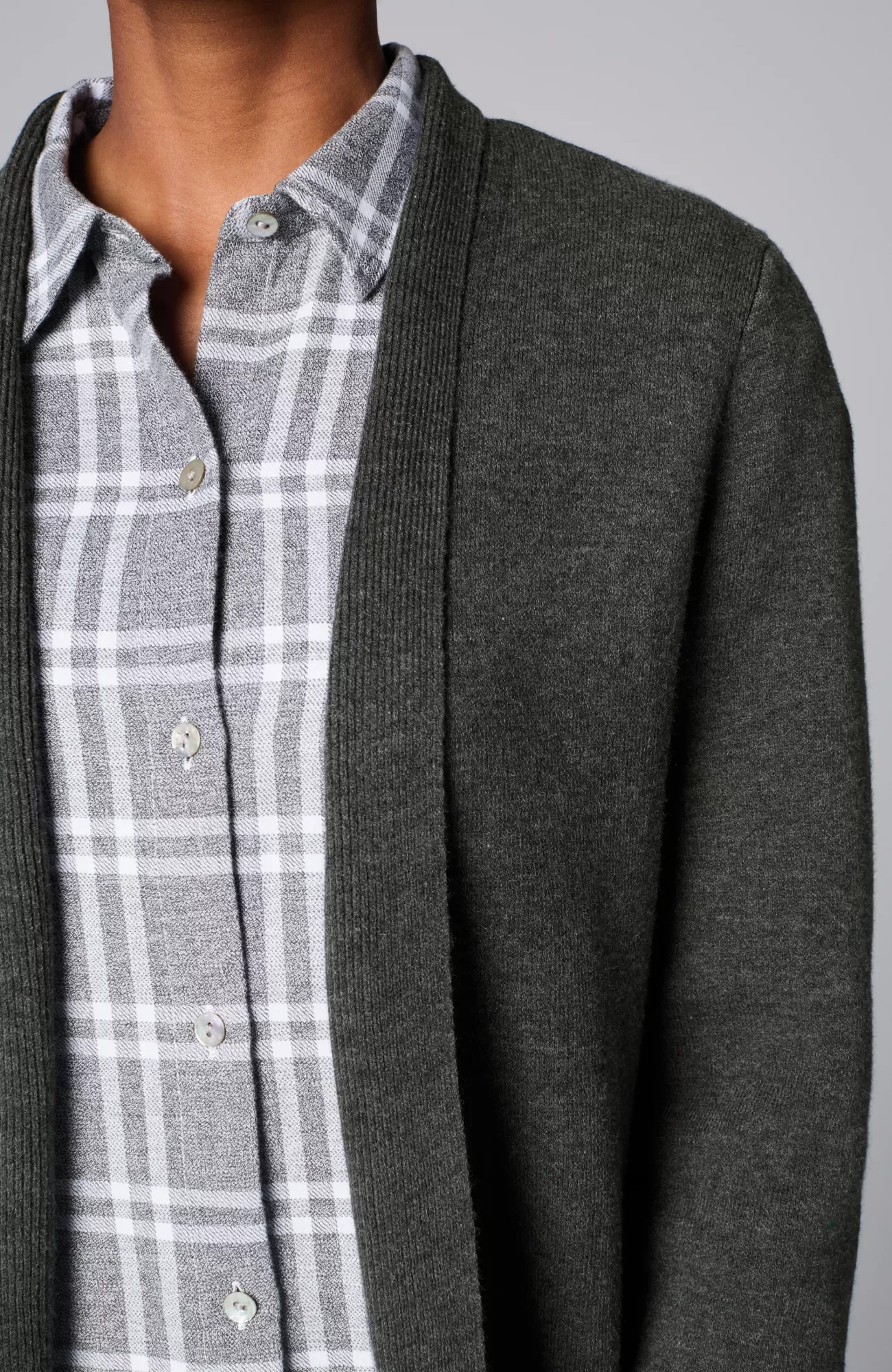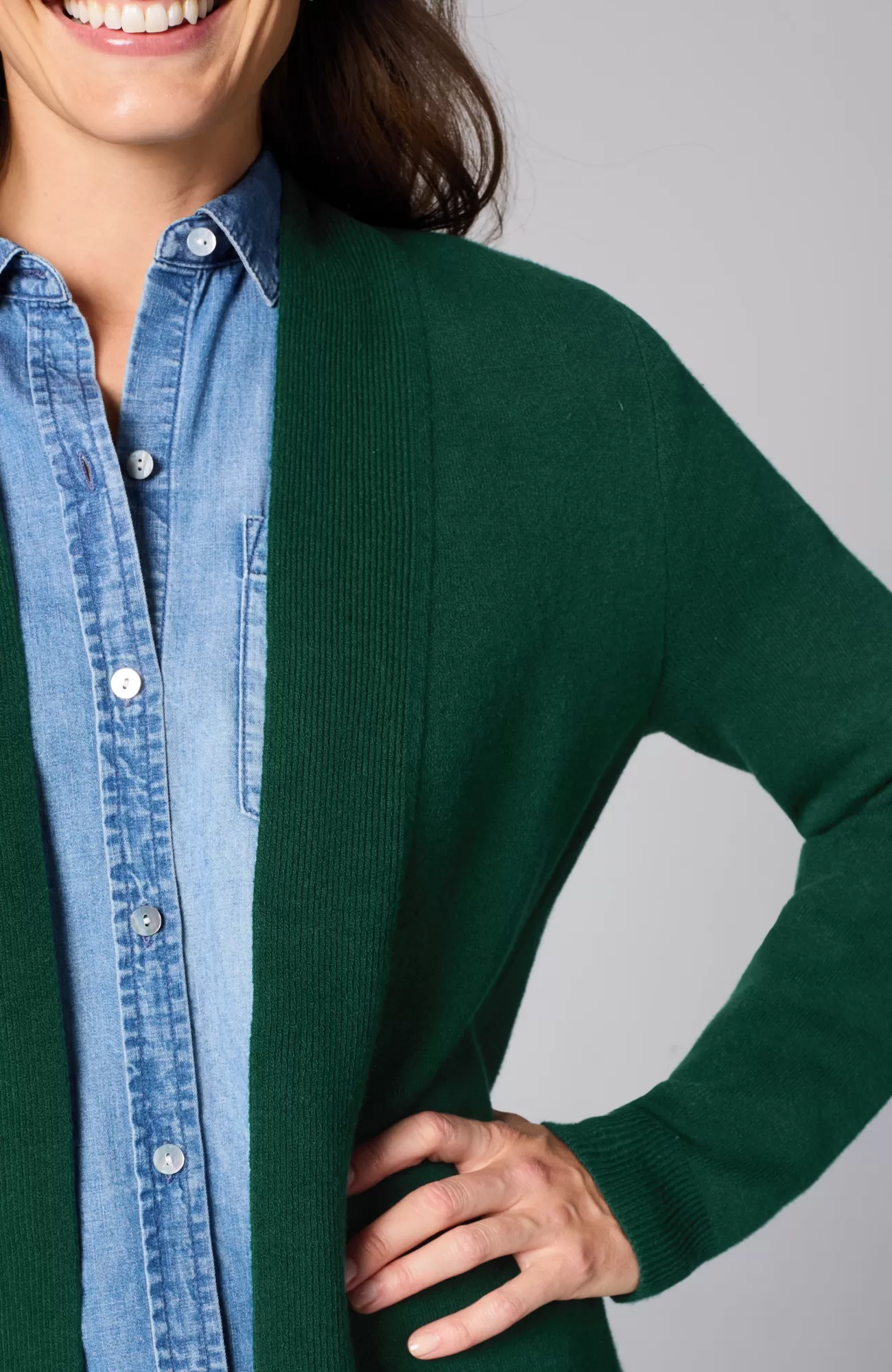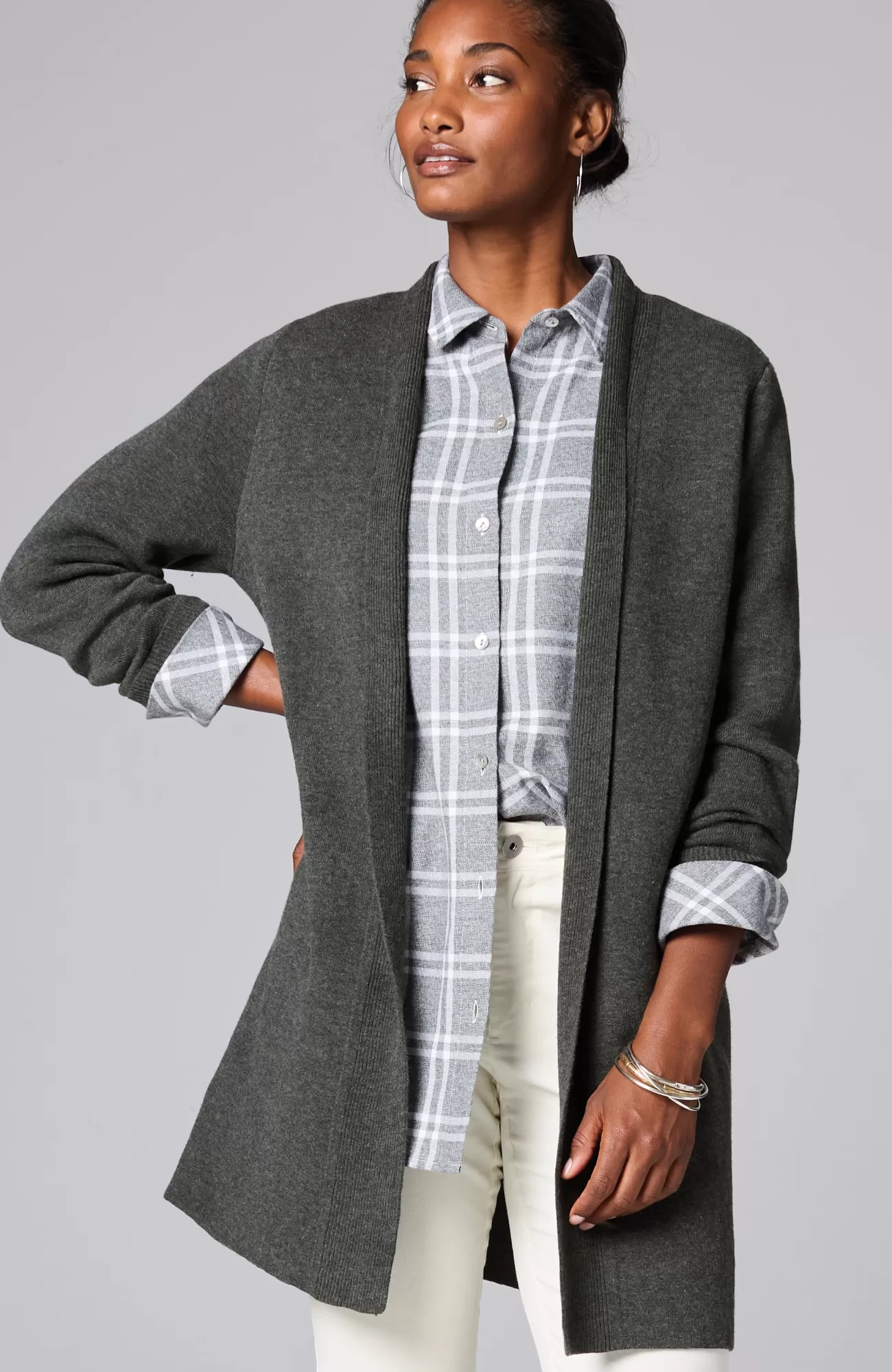 The layer of cozy your wardrobe needs, this streamlined sweater has an open-front design to show off base layers. It's knitted from the supersoft "majestic" cotton-blend yarns you love, and it’s available in two rich hues. Finished with a ribbed placket and cuffs.