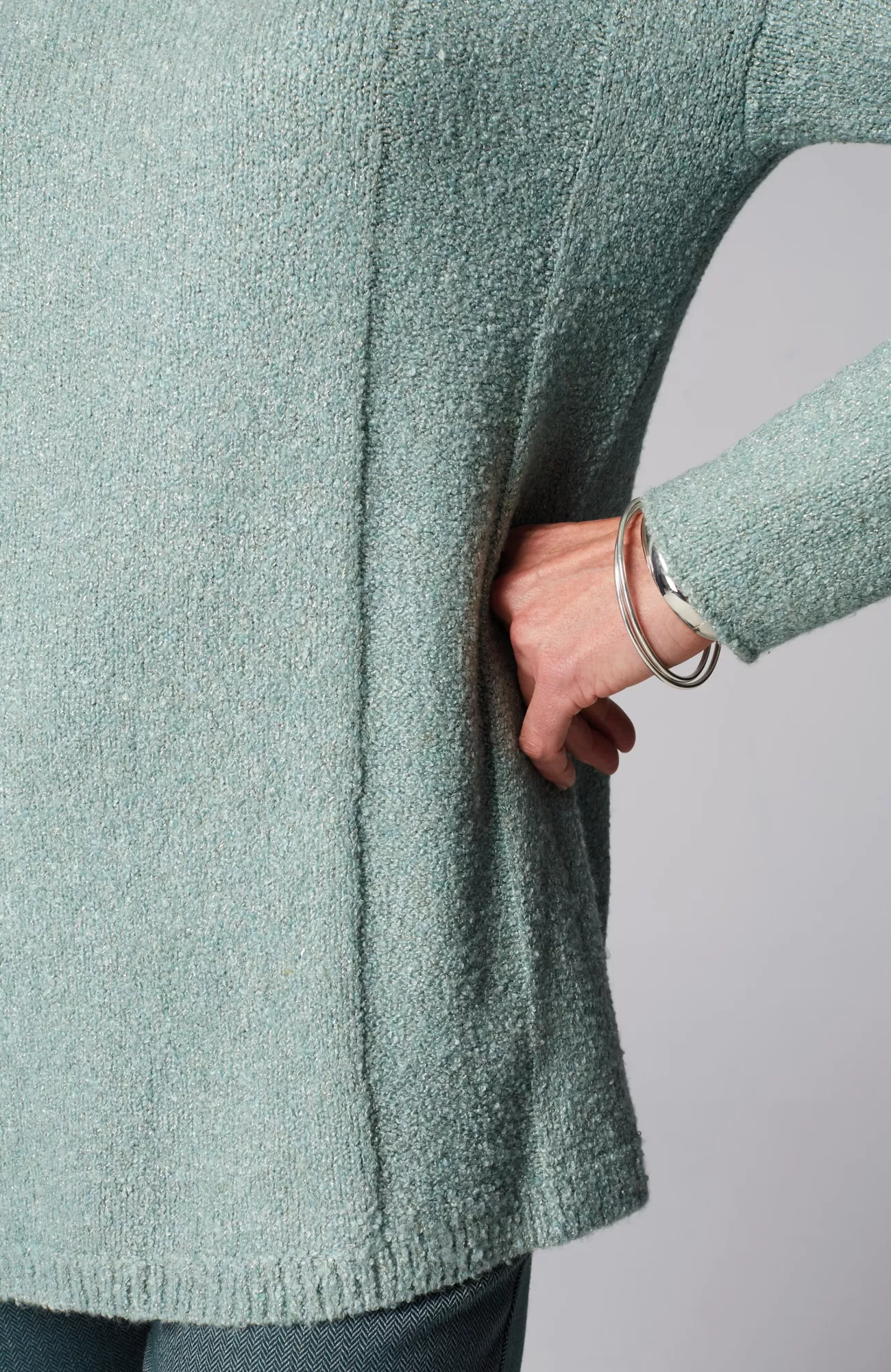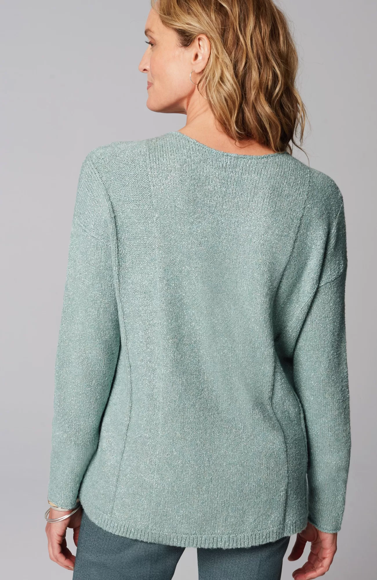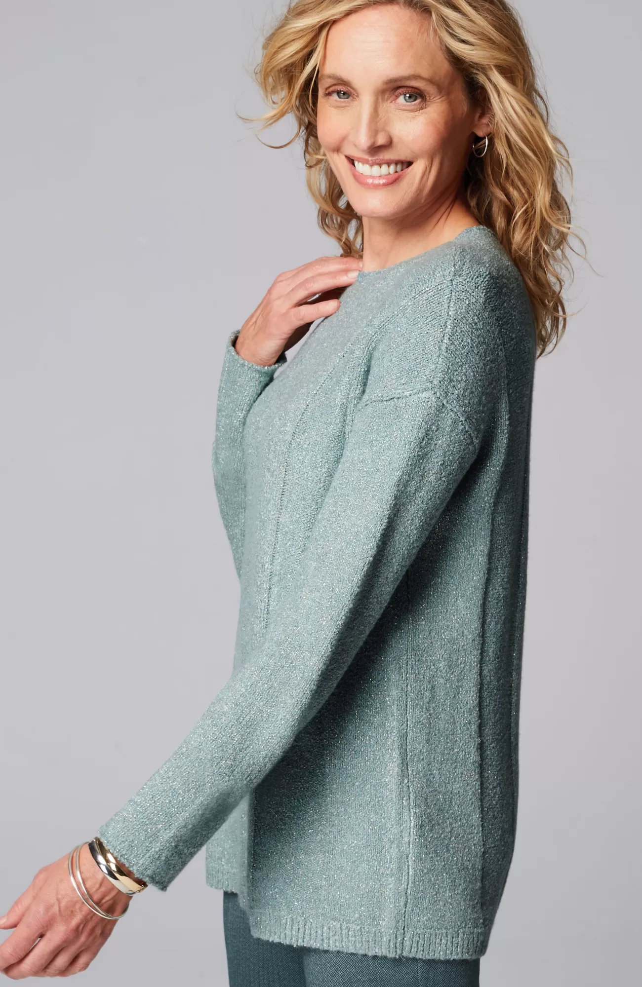 Add this season-perfect boat-neck sweater to your weekly rotation. Supersoft, loosely knit bouclé yarns promise comfort and textural interest while subtle shimmer introduces a bit of glamour into your wardrobe. Finished with a ribbed hem.