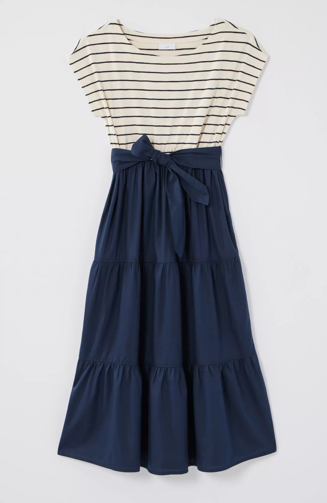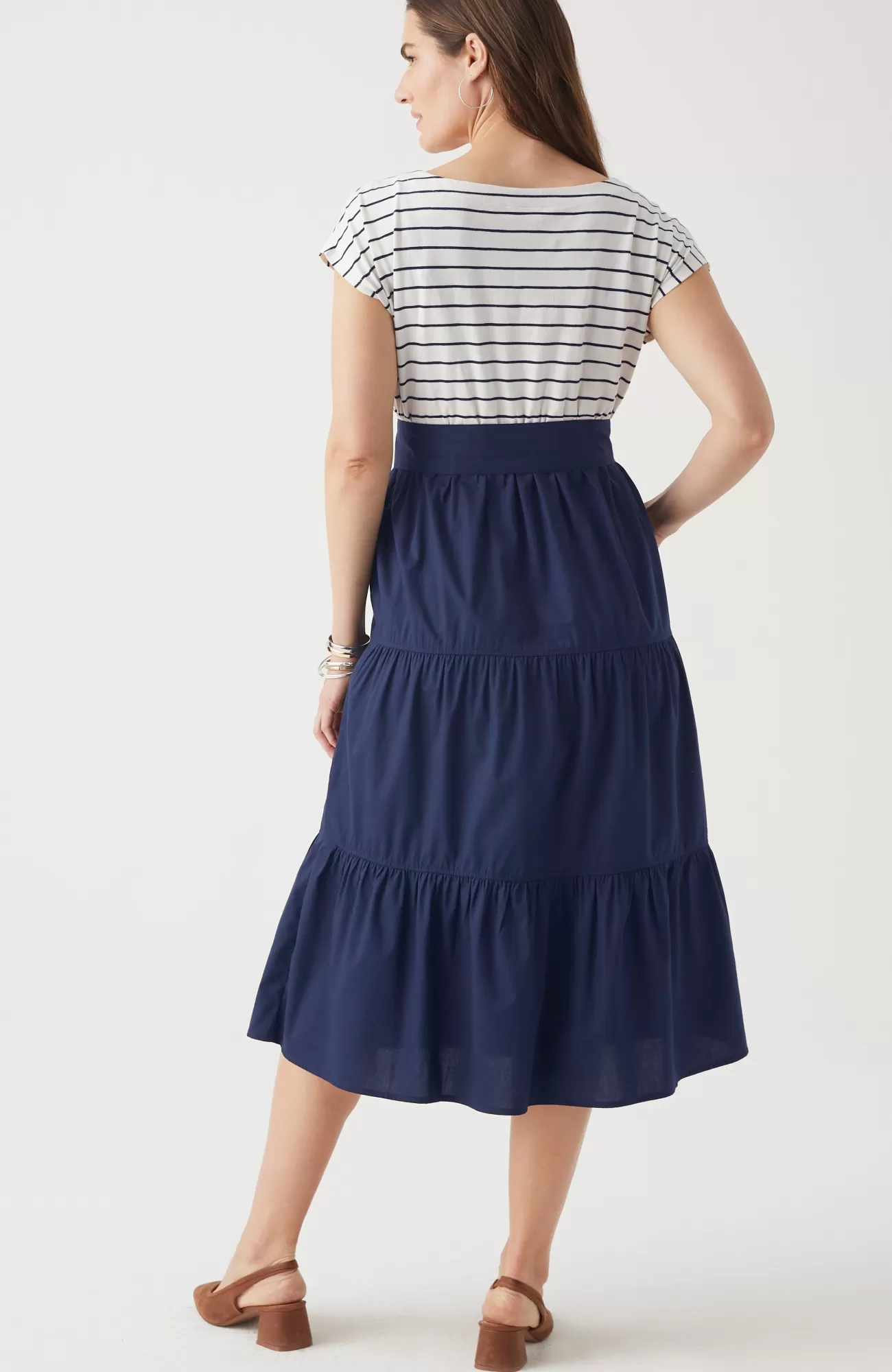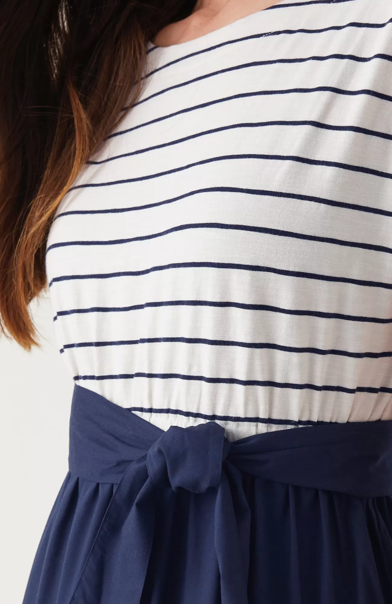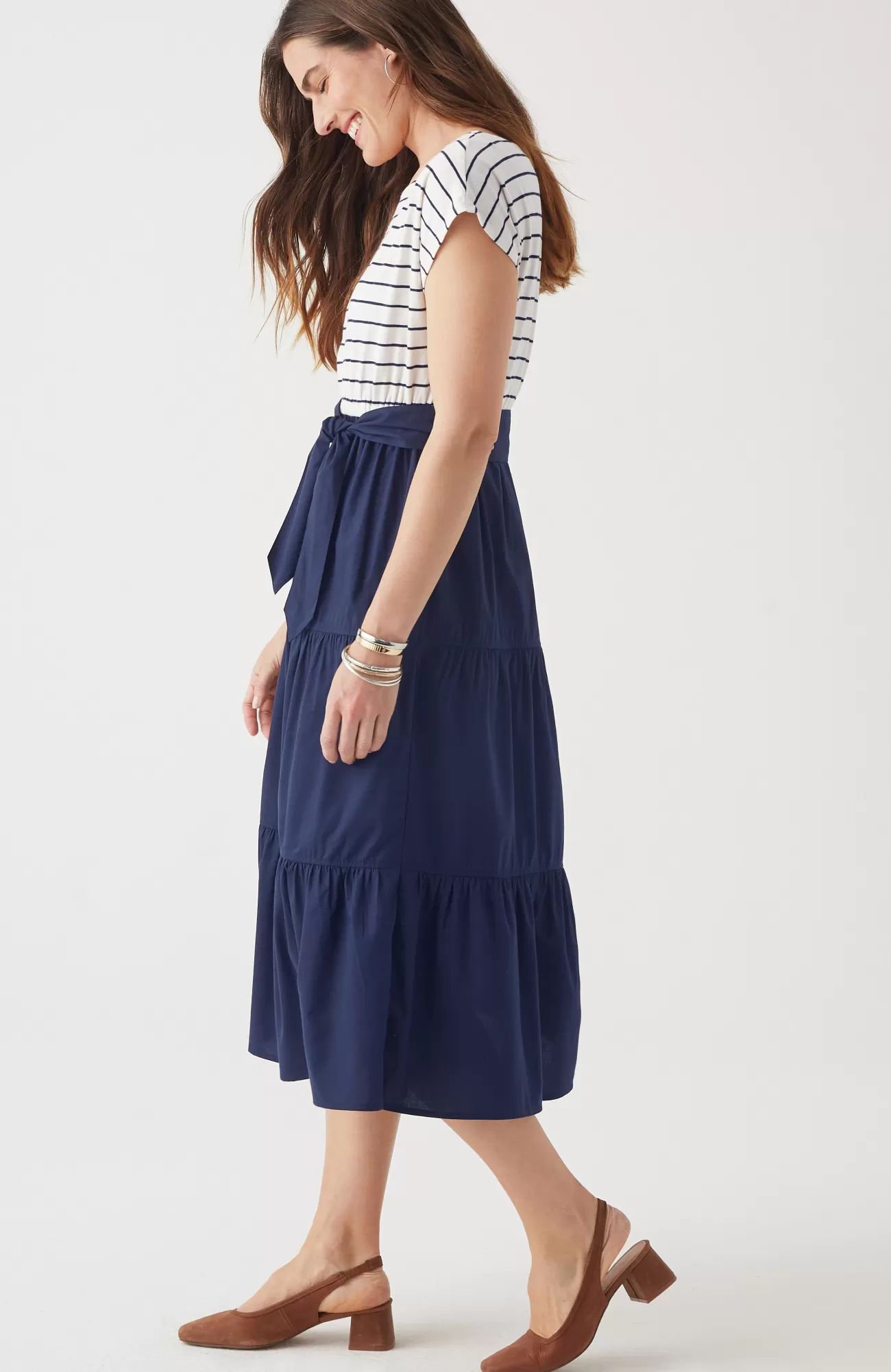 The new nautical: a mix of feel-good fabrics in a fresh take on your favorite dress. Designed with a striped knit T-shirt top and a woven tiered skirt, it’s a comfortable style that moves with you. Our favorite part? The removable belt that offers so many styling possibilities.